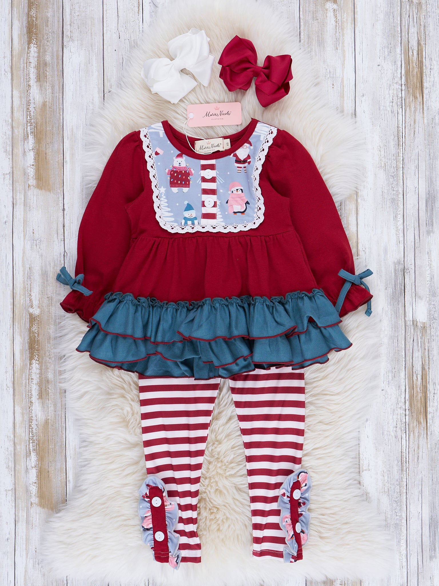 Make your way to the North Pole in this sister set! This outfit features a red top overflowing with a chambray ruffle hem paired with red & white stripe leggings.