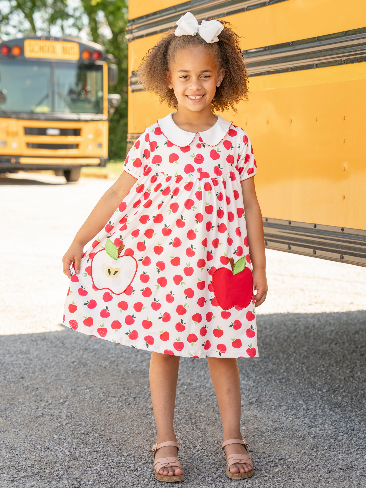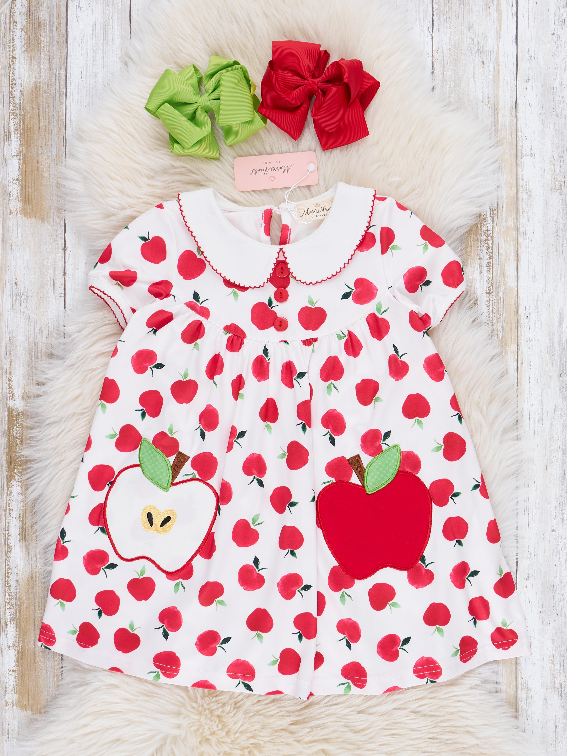 Get ready for fall with our Red Delicious Ruffle Dress! This playful girls dress features a sweet apple print and a classic peter pan collar. Perfect for back to school, this dress is both stylish and comfortable. Make a statement with this must-have addition to your little one's wardrobe. Shop the sister set here!