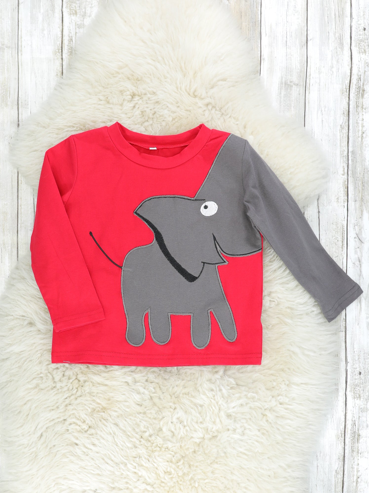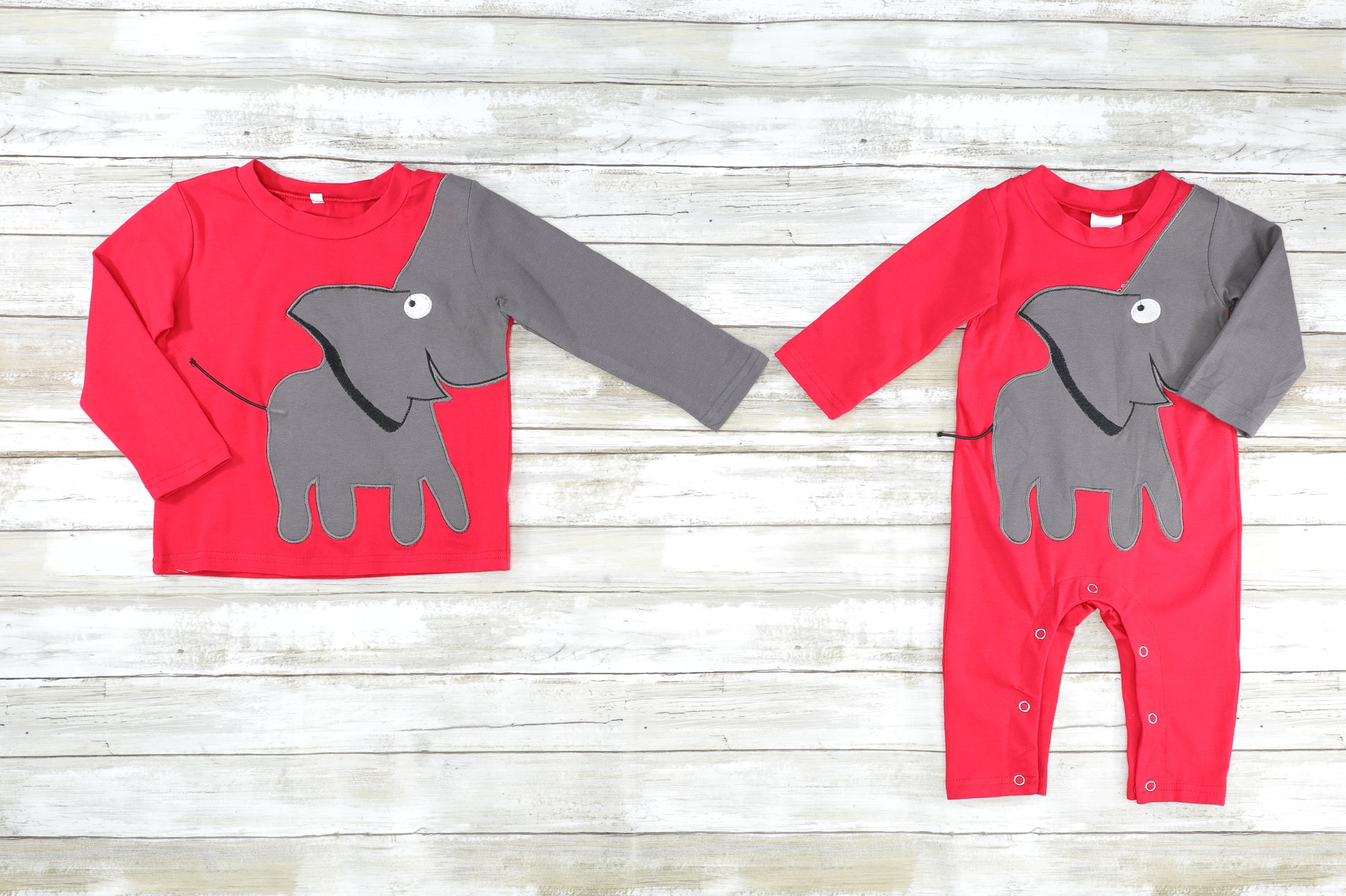 Let's talk about the elephant in the room... You need this sibling set! This red shirt features the cutest elephant appliqué.