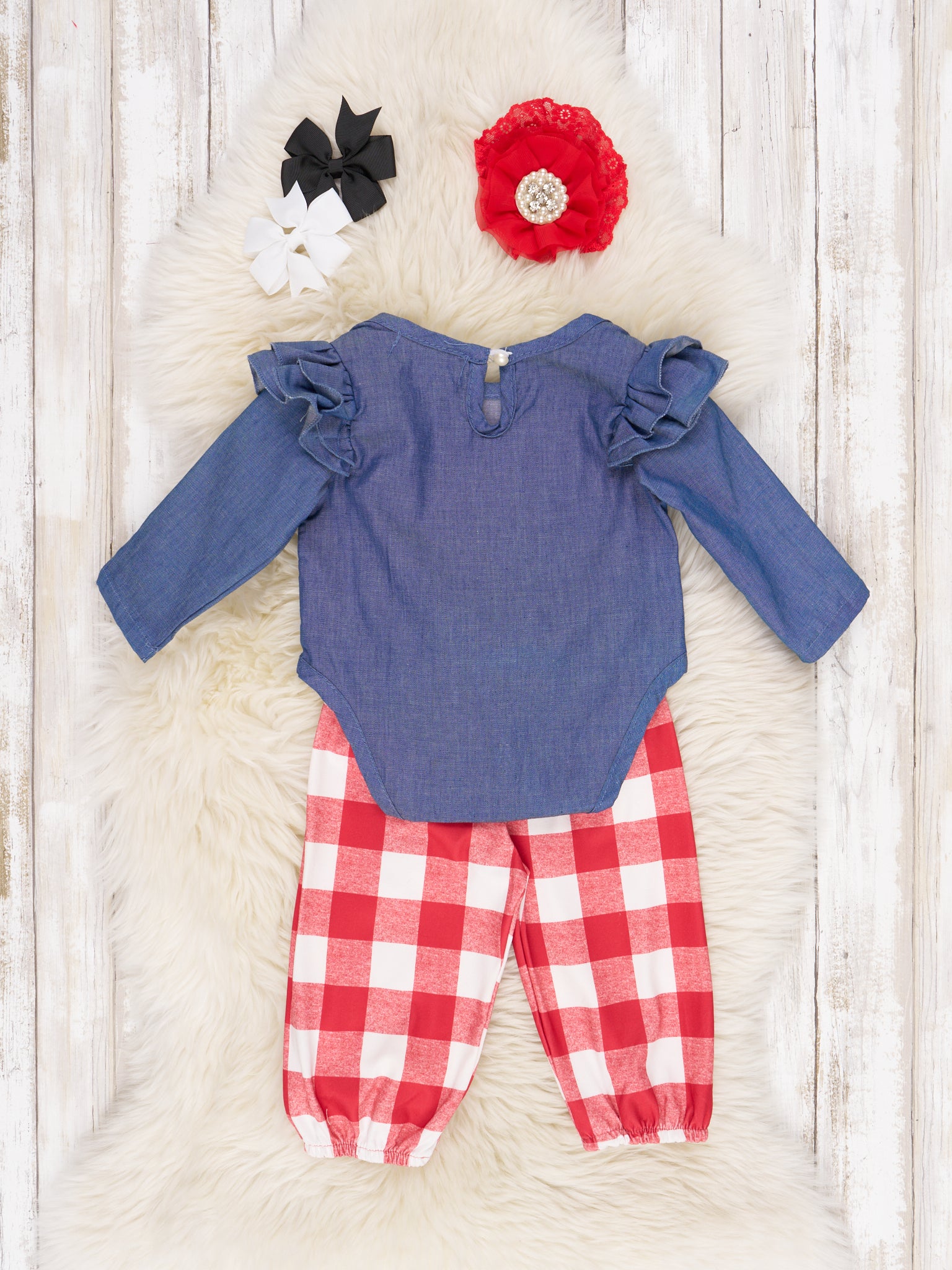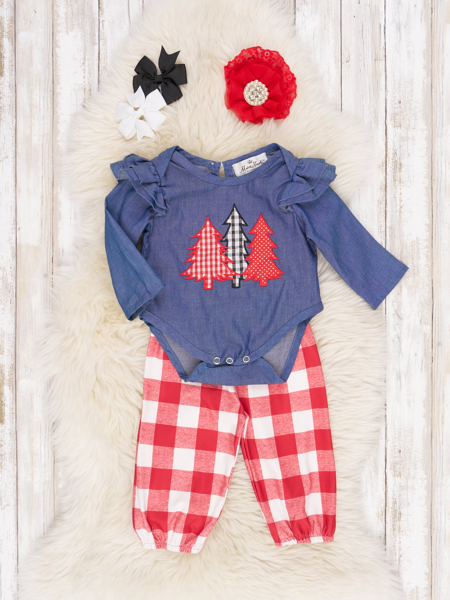 Red Gingham Chambray Christmas Tree Ruffle Onesie Outfit