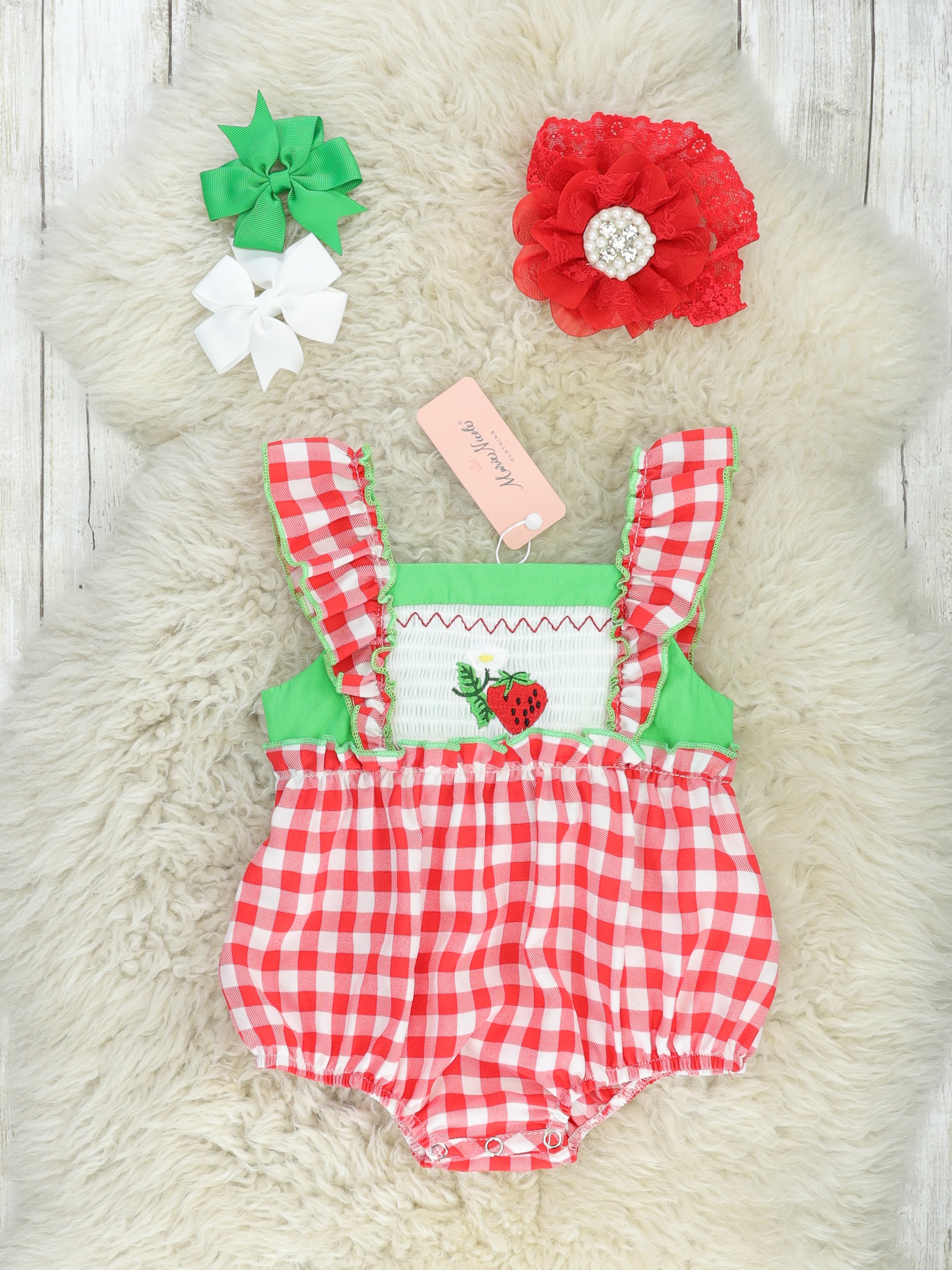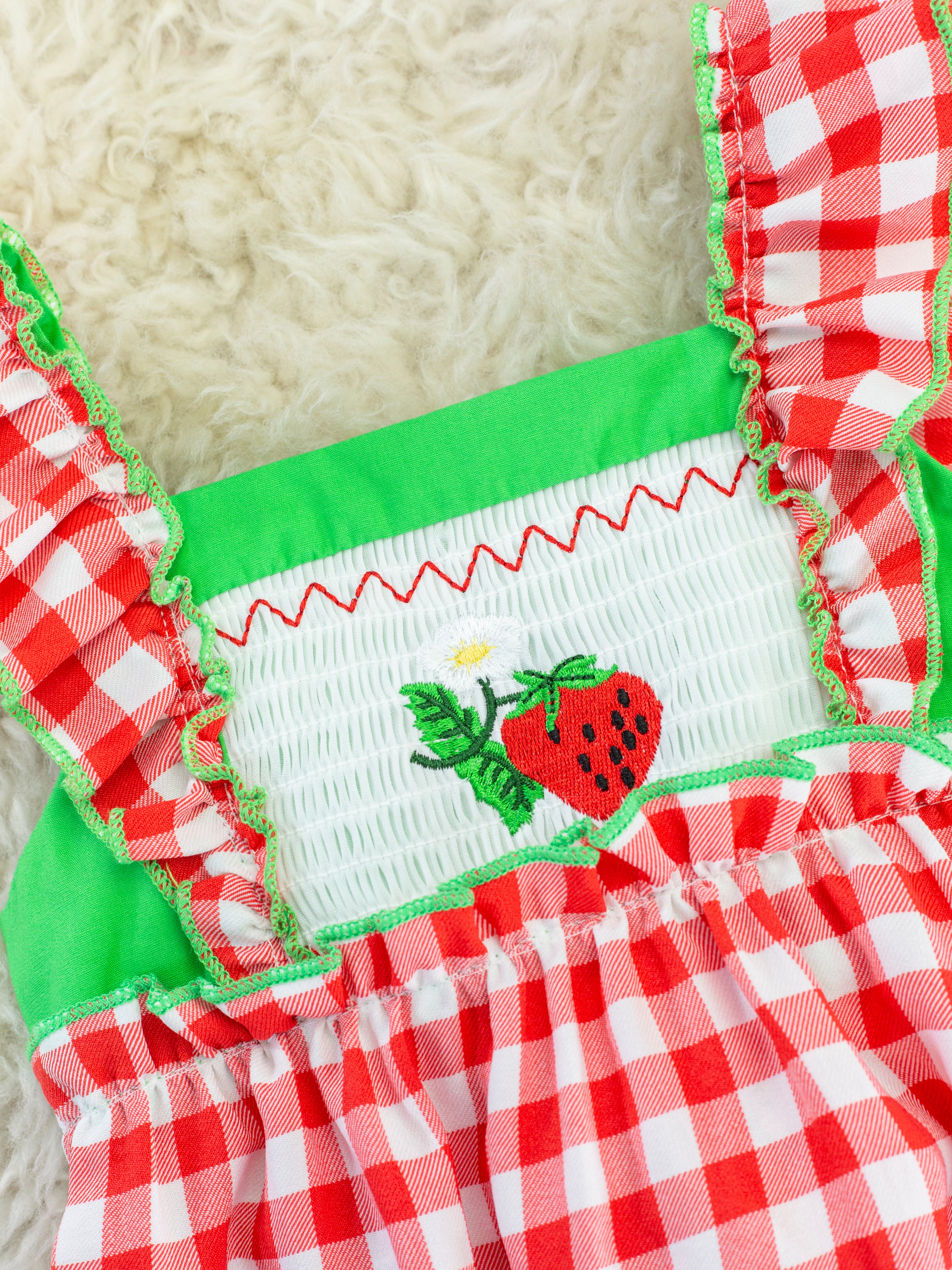 Capture that summery feeling with this playful Red Gingham Strawberry Smocked Sister Set! It features flutter sleeves, a tie at the waist, and a colorful smocked and embroidered strawberry. So why not join in the fun and enjoy the sunshine this season?