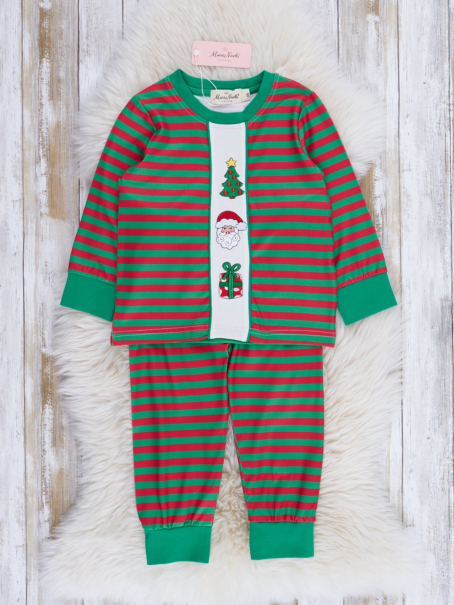 Slide into holiday enchantment with the Red & Green Christmas Embroidered Sibling Set. Adorned with playful stripes that dance like festive ornaments, green trim, and embroidered holiday elements, this outfit is a merry celebration in every stitch.