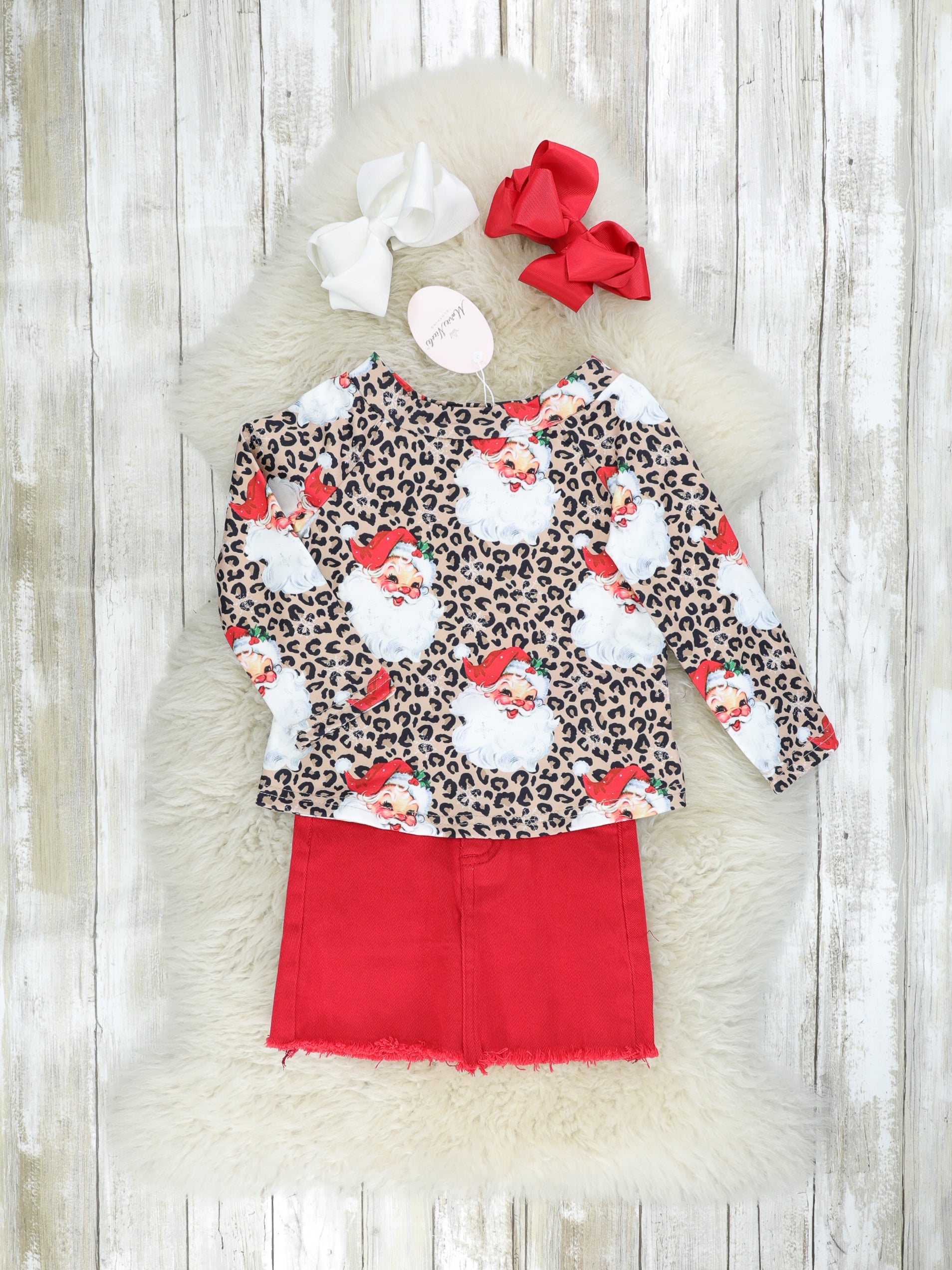 Santa is sassy this season! This outfit features a leopard top with Santa details & a red skirt with an elastic waistband.