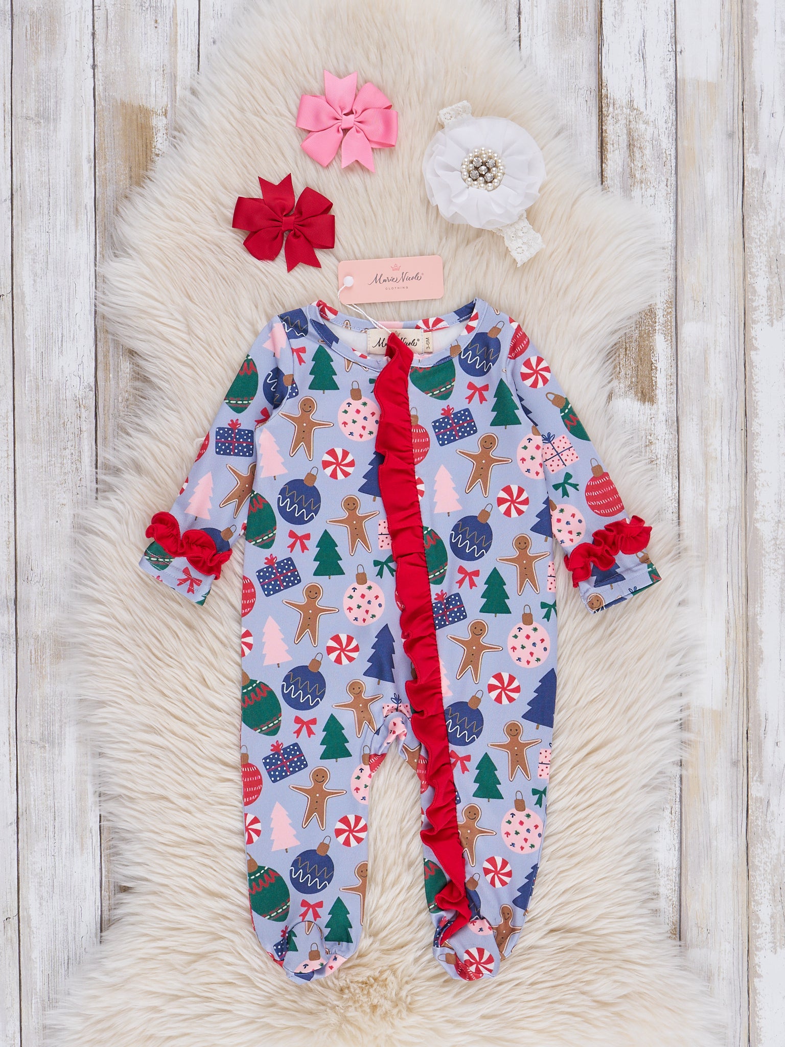 Looking for sibling style? Dress your little ones in this eye-catching Red & Light Blue Holiday Joy Ruffle Romper! It features a light blue bodice with an ornament print detail and sweet red ruffles to get them in the holiday spirit! They'll be ready for family photoshoots and yuletide fun!