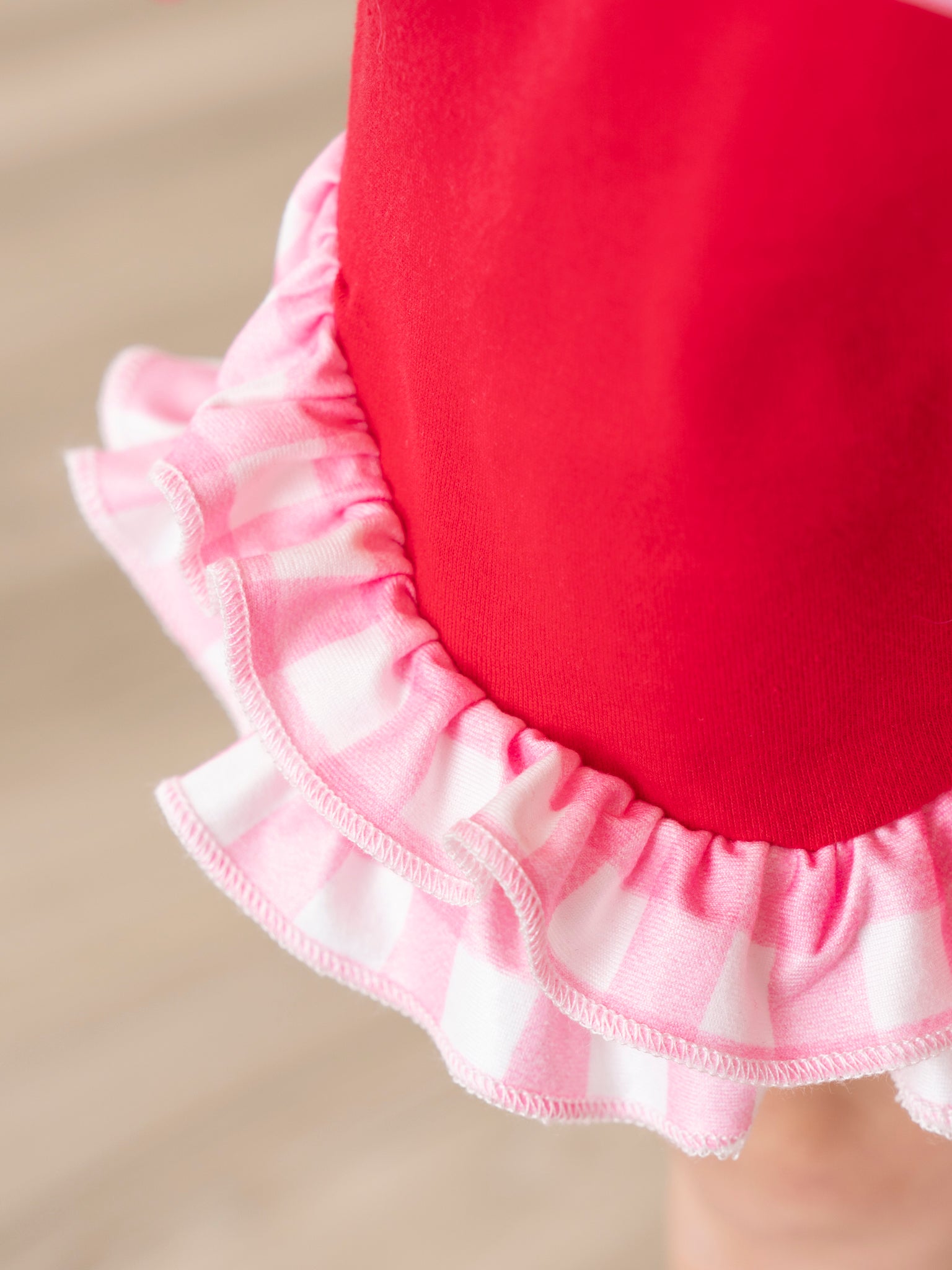 Add a cute and fun touch to your mini's wardrobe with our Red & Pink Gingham Strawberry Ruffle Outfit by Marie Nicole Clothing! Featuring a pink gingham embroidered strawberry top and gorgeous red skort w/ ruffle trim, this outfit is perfect for warm weather and brings a touch of sweetness. Shop the matching outfit!