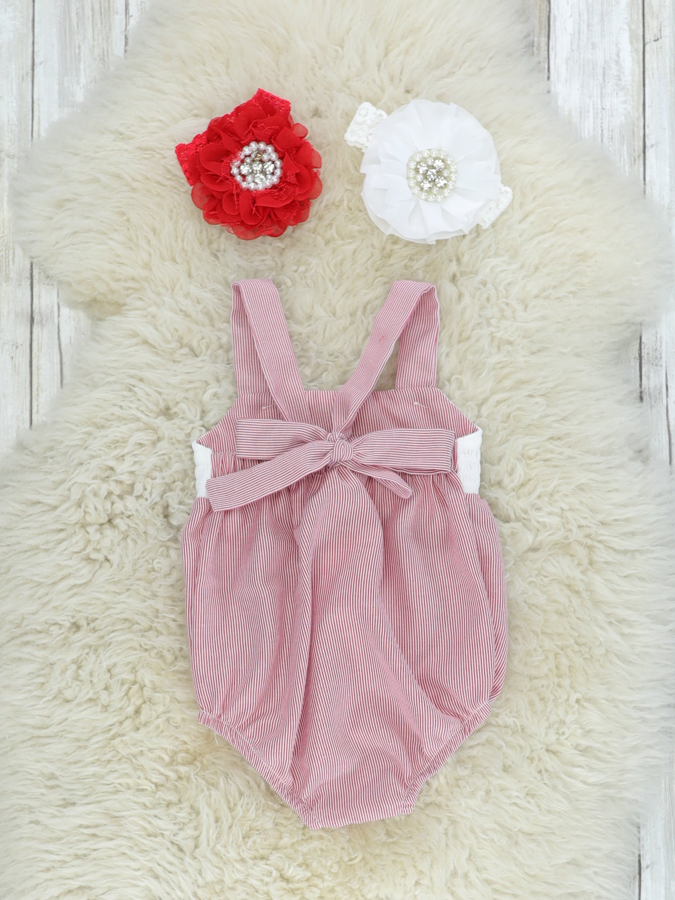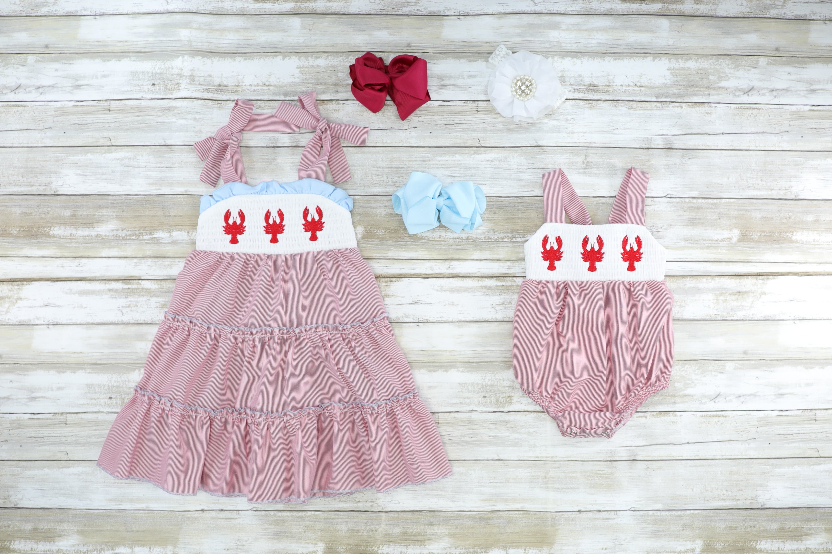 Ready to head to the beach? This adorable sister set has all of the details and features smocking and a red and white pinstripe.