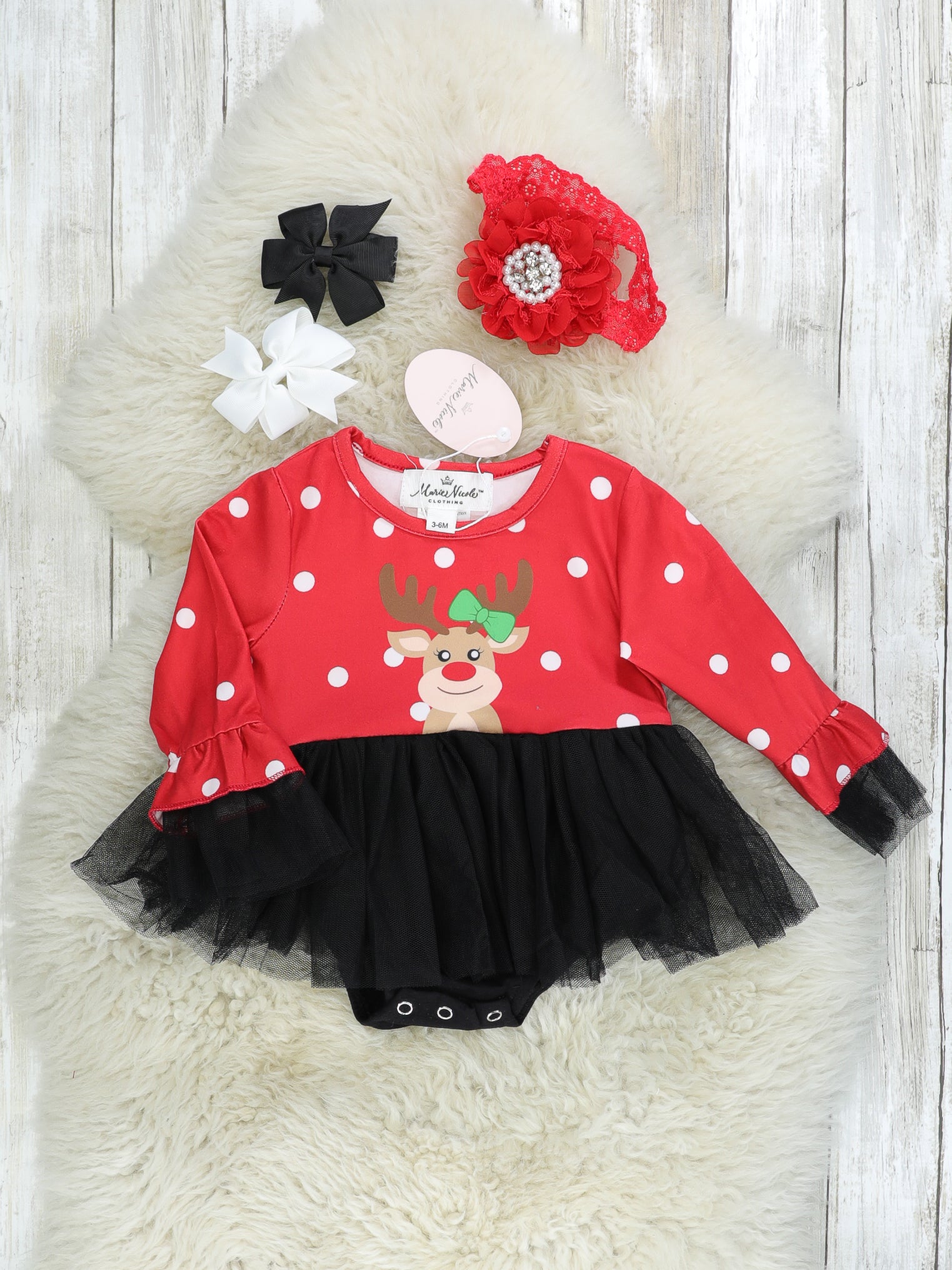 This darling sister set is so deerly cute! This romper features polka dots, the sweetest reindeer detail, ruffle sleeves, & a tulle dressy skirt.