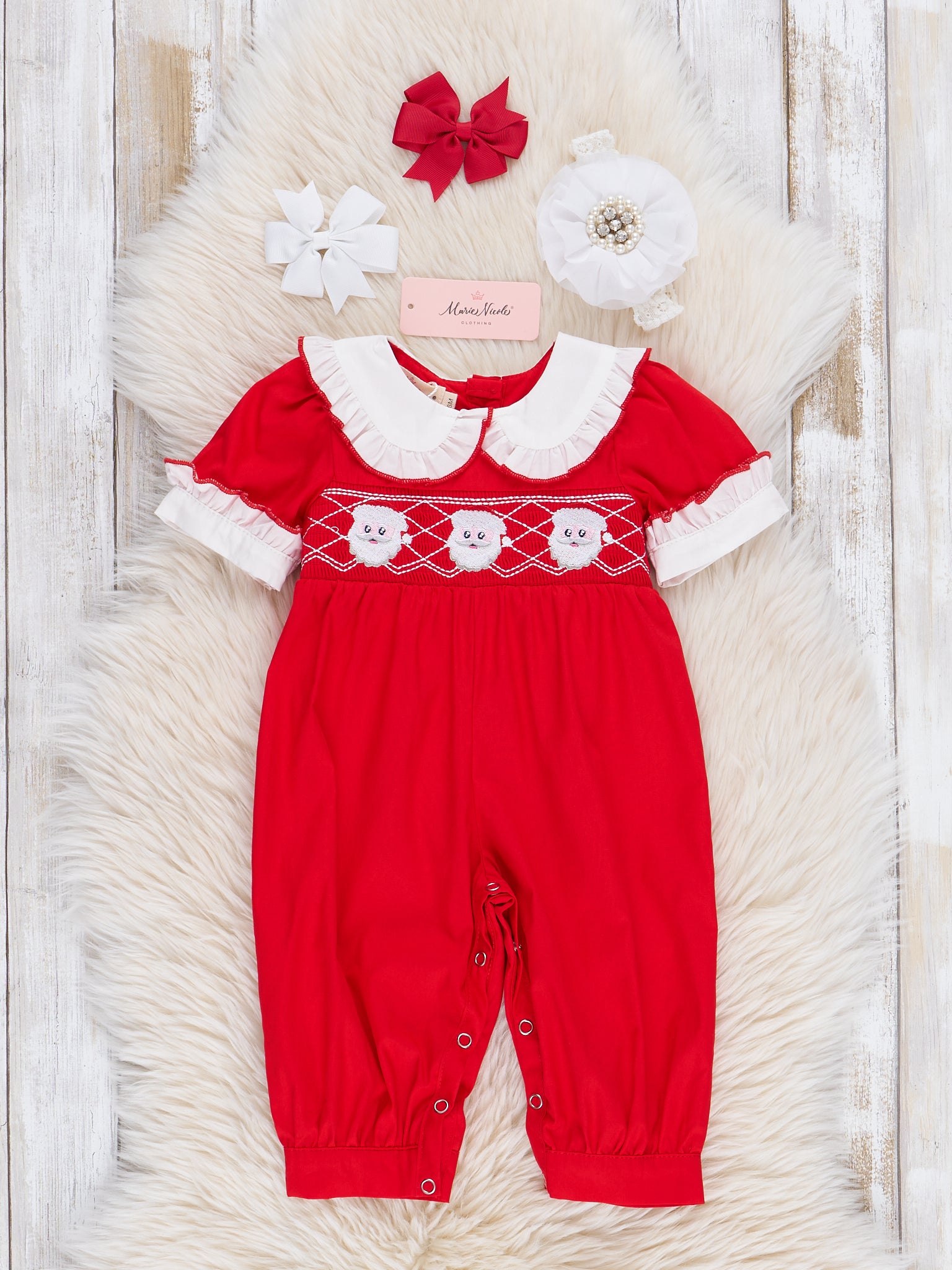Get your little one ready for the holiday season with our Red Smocked Santa Lace Trim Romper. Featuring a bright red bodice adorned with embroidered Santas over smocking, this girls Christmas romper is both festive and comfortable. The lace trim peter pan collar and sleeves add a charming touch, while the button-back closure makes dressing a breeze. This dress is also available in a sister set, perfect for family photos and gatherings. Spread the holiday cheer with this adorable romper!