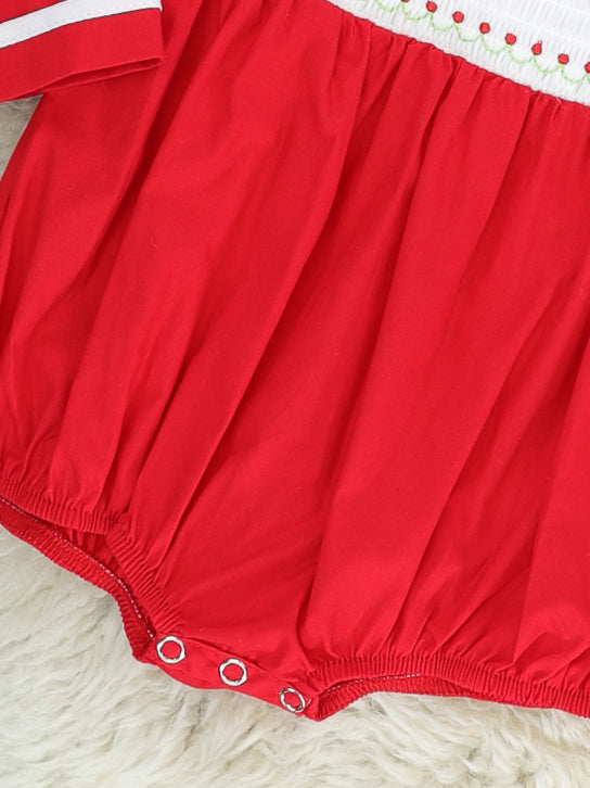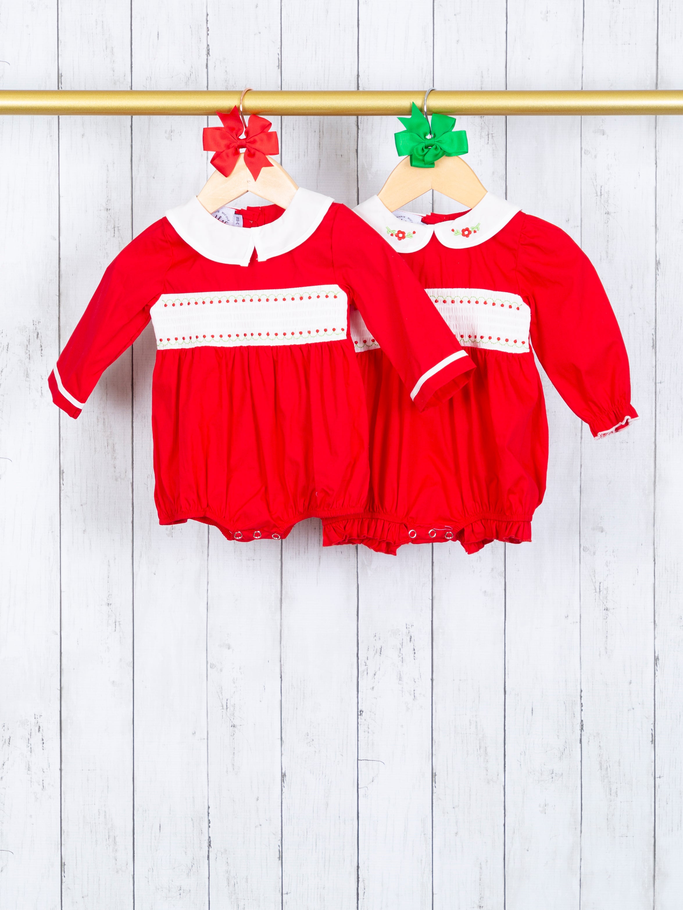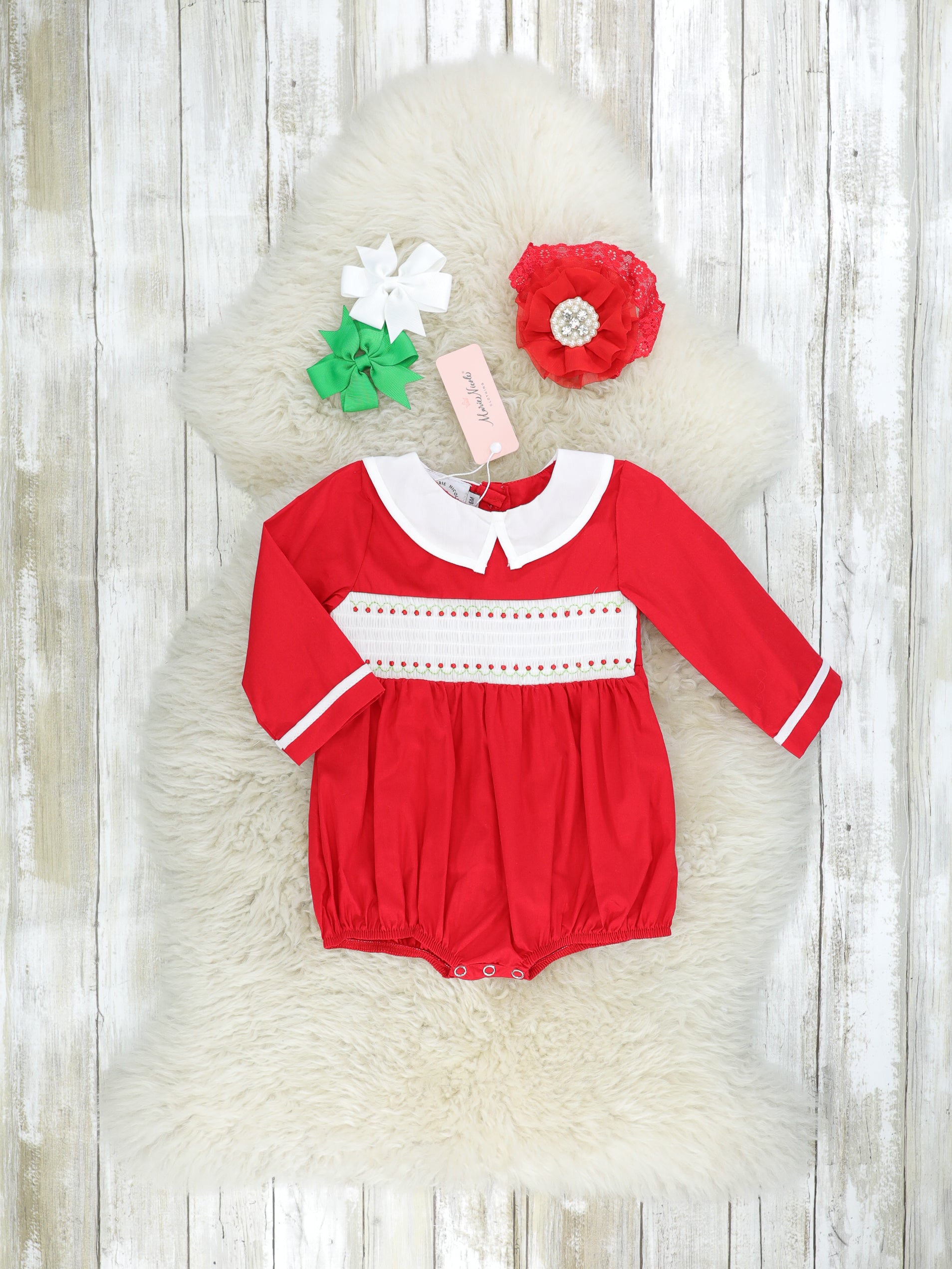 The sweetest romper for your holiday babe! This red romper features a peter pan collar & smocking.