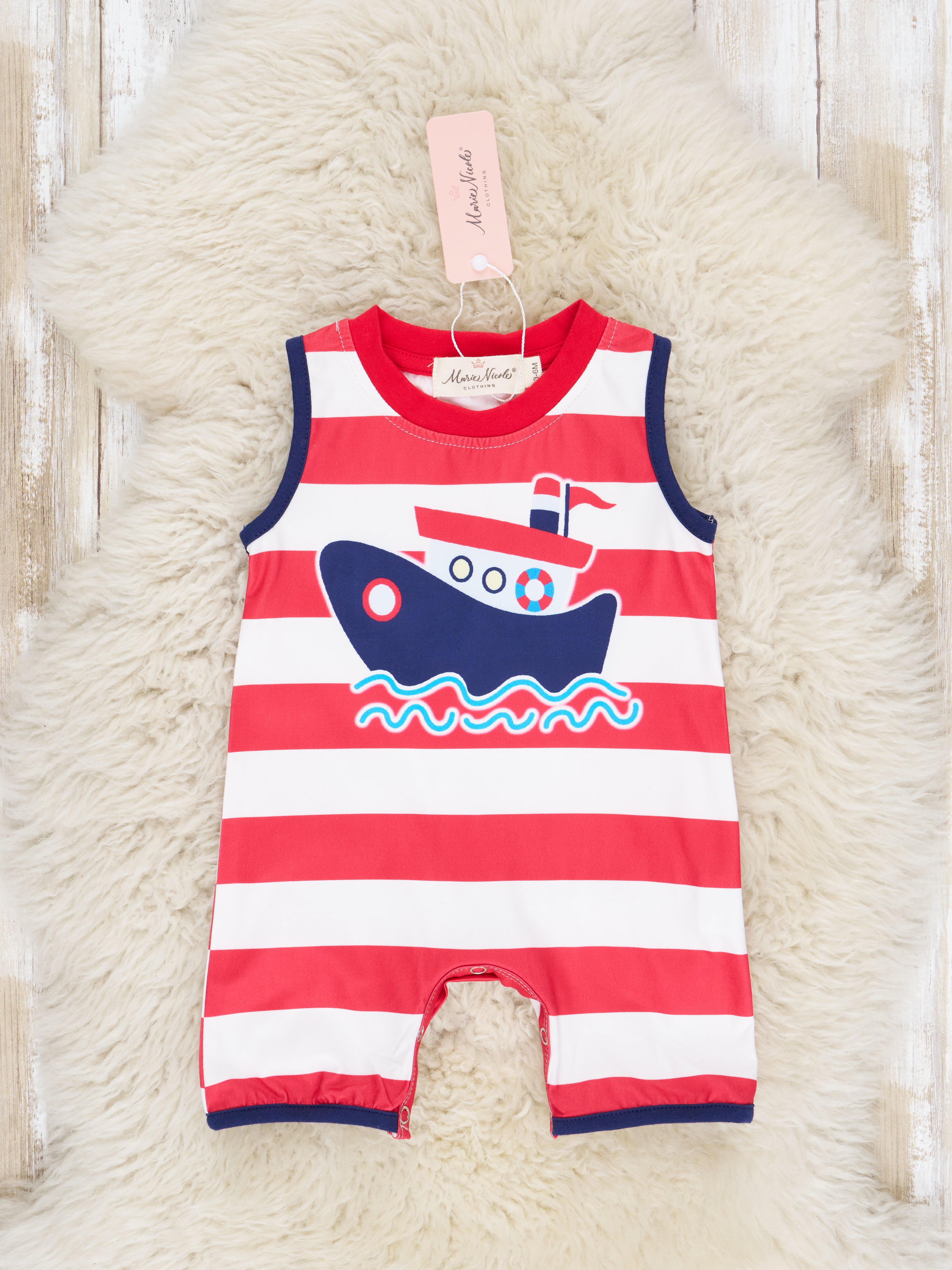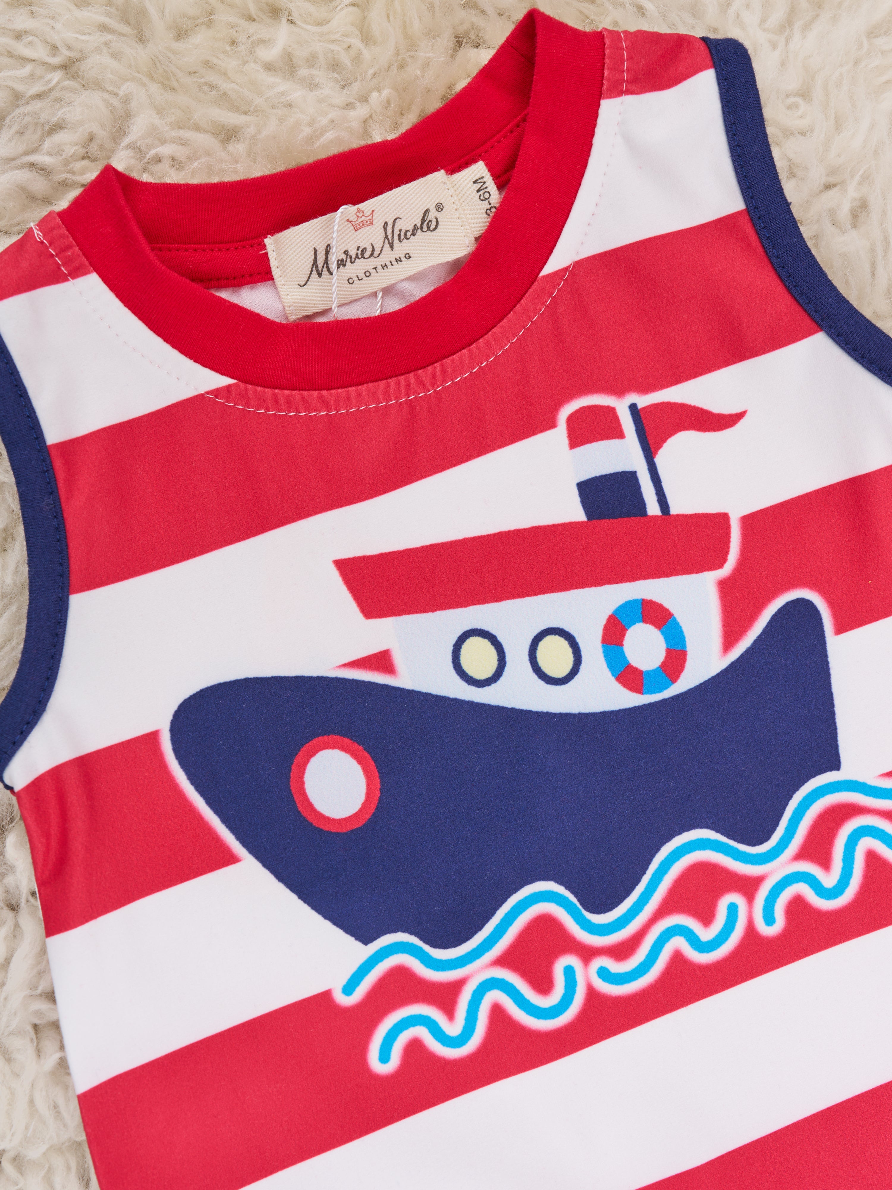 Ahoy! Introducing Red Striped Sailboat Johnny, the only kids' clothing that sails the style seas with a savvy and a smile! With bold red stripes and a sailboat detail, this quirky and fun outfit is sure to bring plenty of oceanic adventures to your kids' wardrobes.