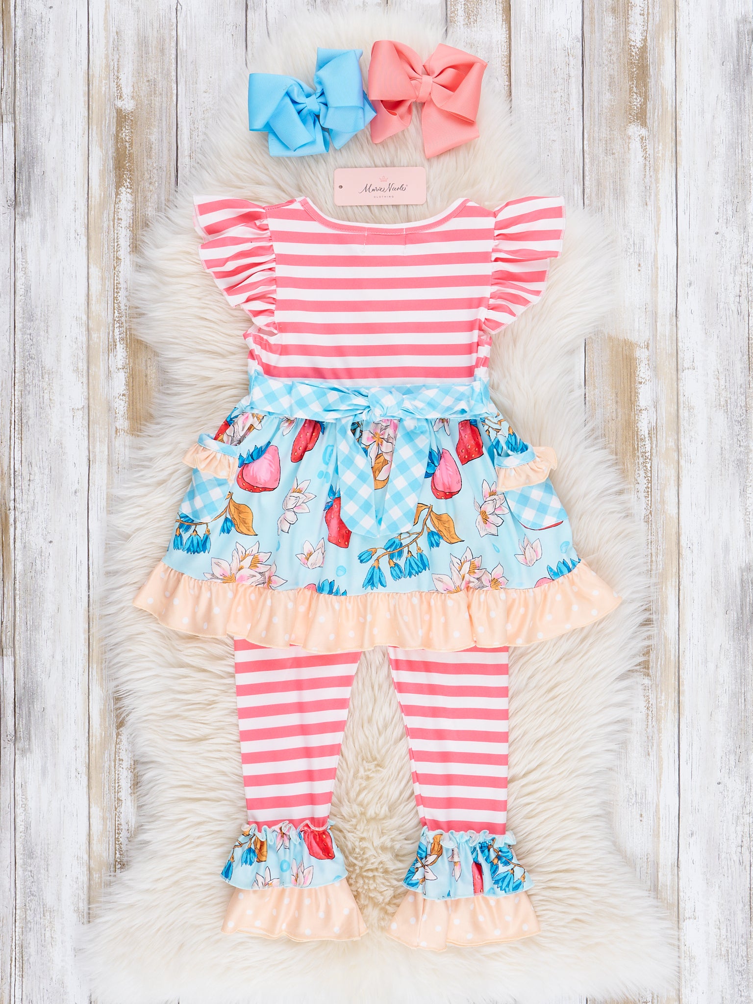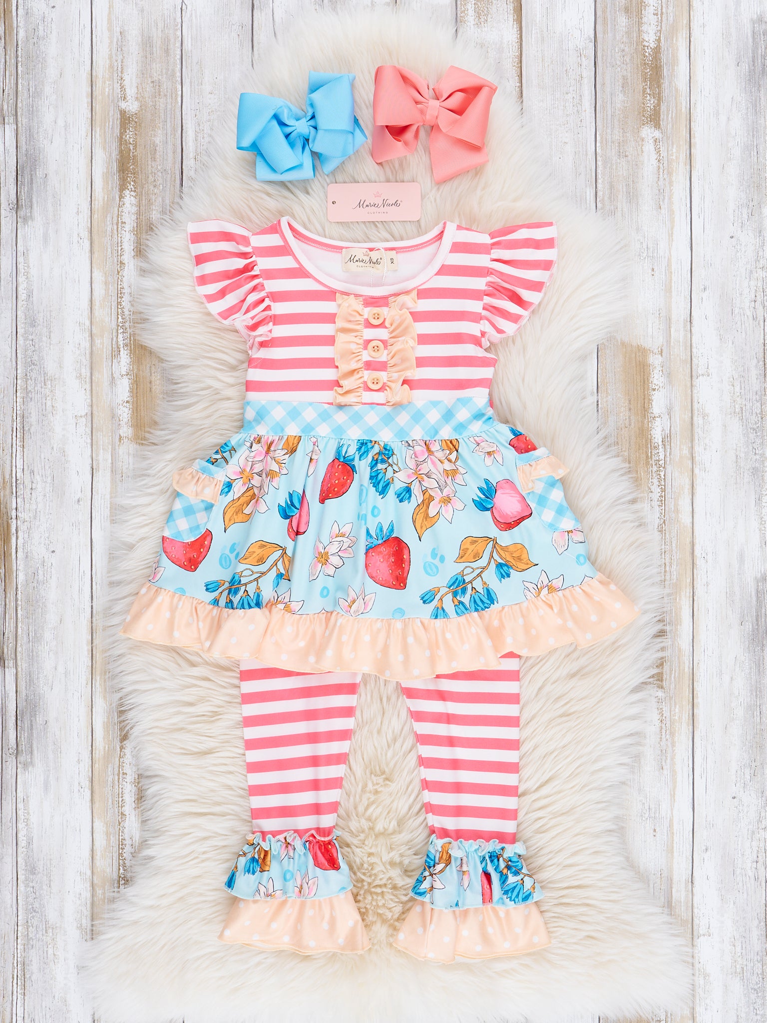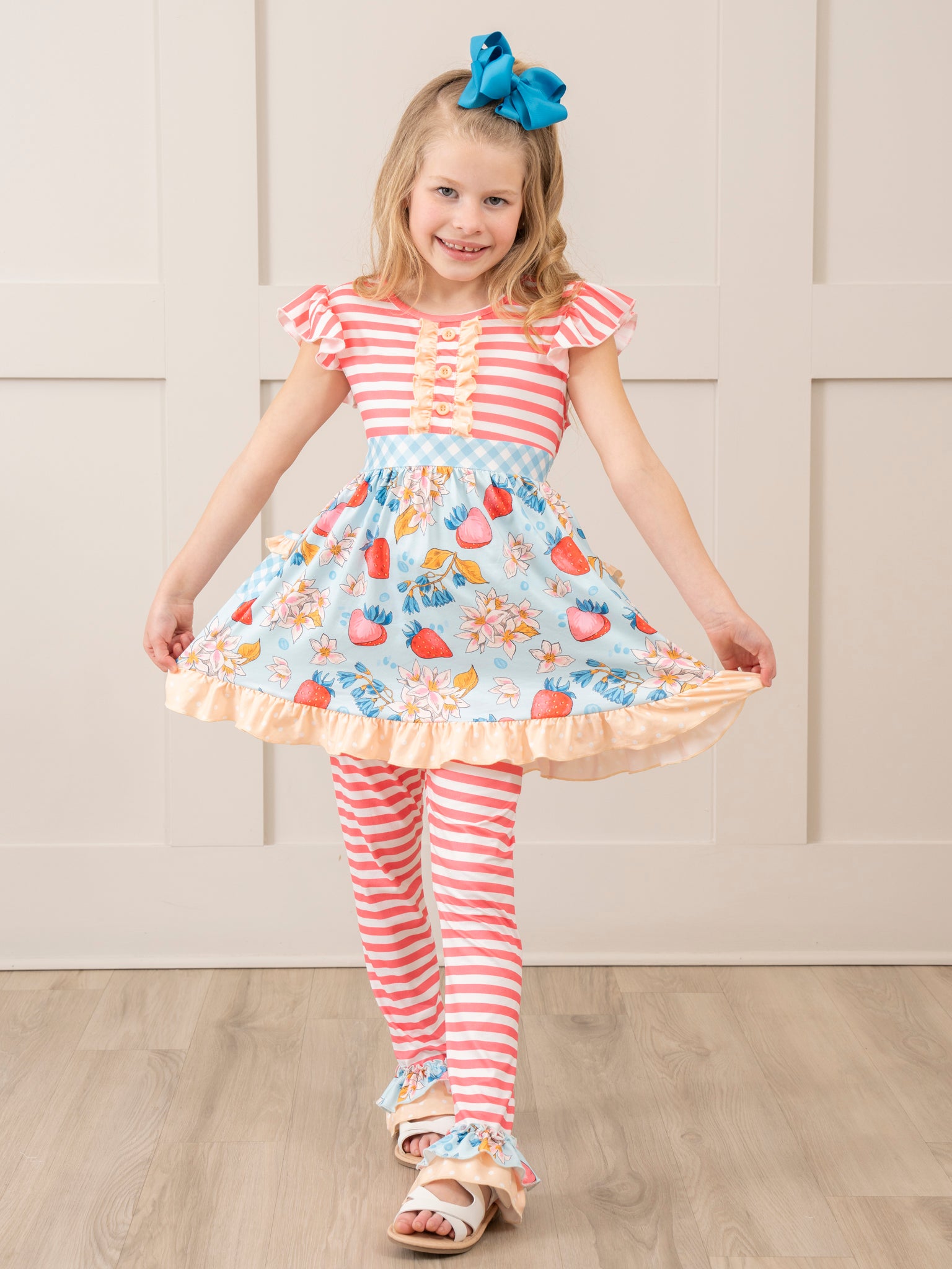 Get ready for a sister set that will make your littles stand out! With striking red stripes and a charming strawberries & daisies pattern, this ruffle outfit is a playful blend of style and fun. The teal gingham waist tie and yellow ruffle detail add a pop of color and personality to this unique ensemble.