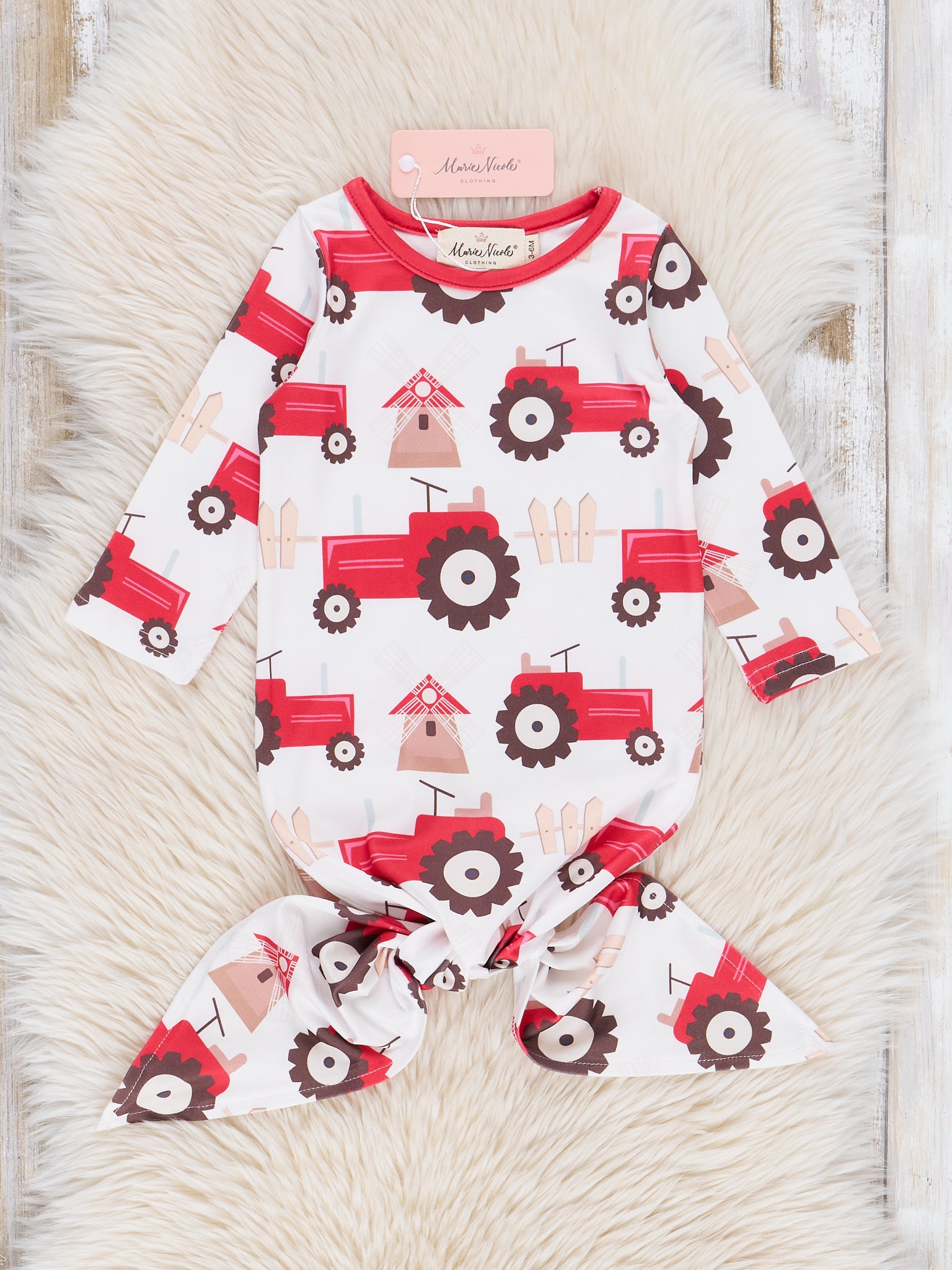 Get your little one ready for a peaceful slumber with our Red Tractor Tales Knot Gown. The knot closure keeps baby cozy while the playful print of red tractors and farms adds a touch of whimsy. Plus the coordinating sleep set by Marie Nicole Clothing is perfect for your little farmer in training.