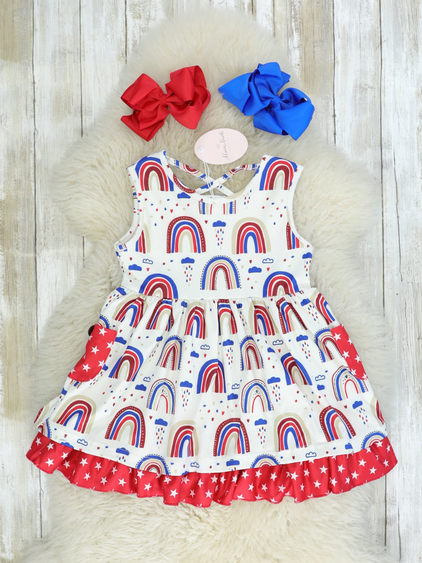 Be a rainbow in the clouds ❤️ This adorable dress features rainbows, clouds and a polka dot trim detail with matching pockets.
