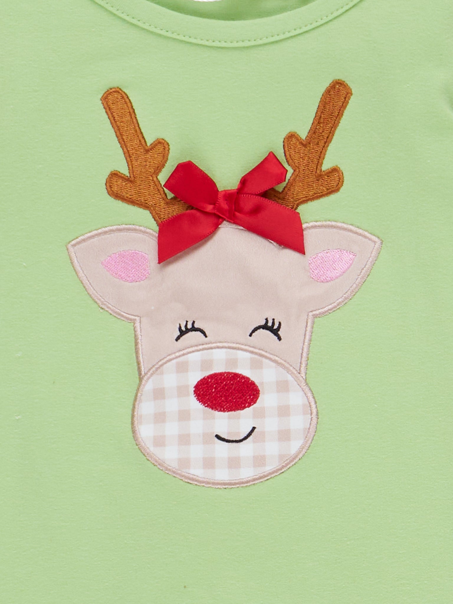 The Reindeer Smile Embroidered Ruffle Outfit from Marie Nicole Clothing brings playful holiday cheer with a charming reindeer appliqué and sweet ruffle trim. Designed for festive comfort, this set combines a cozy long-sleeve top with bright pants, making it perfect for seasonal gatherings, photos, or gifting. The whimsical details and fun colors capture the spirit of winter celebrations.