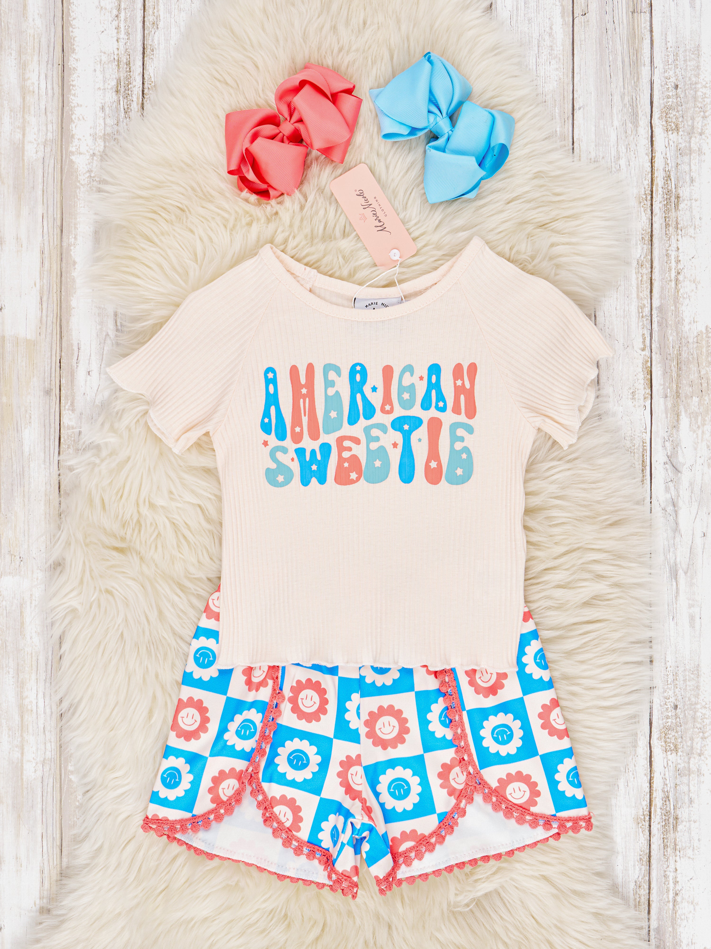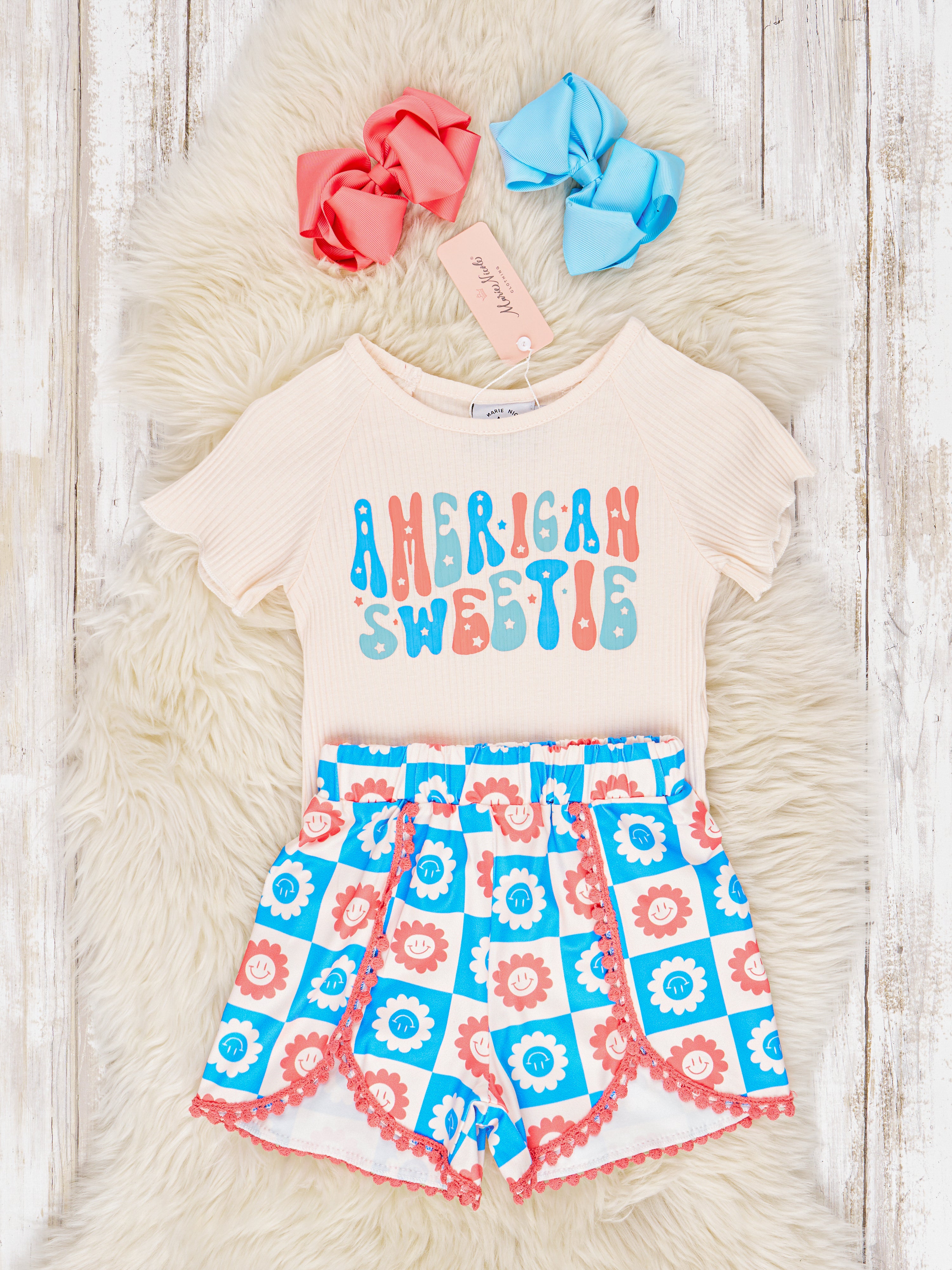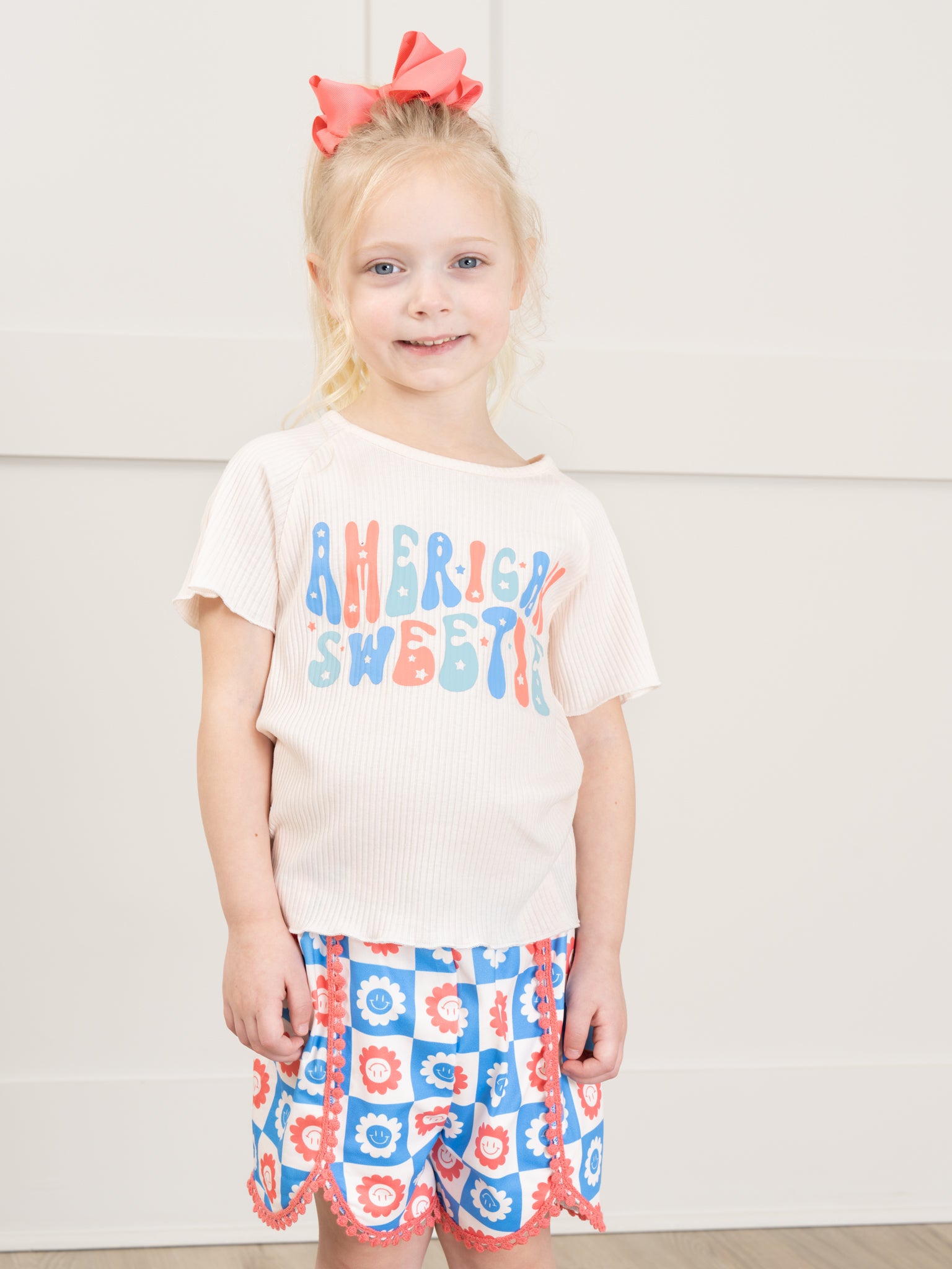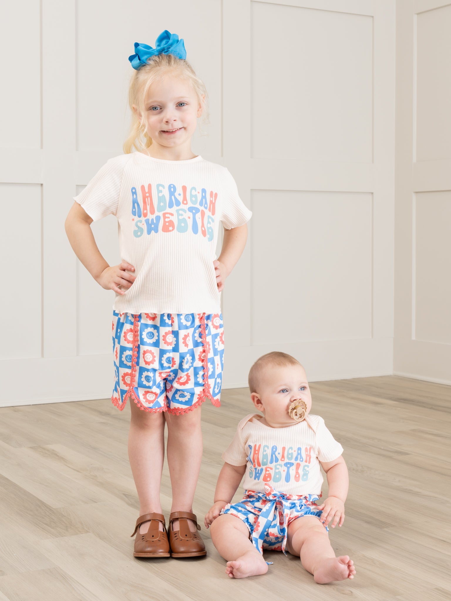 This sister set will have your little ones feeling like "American Sweeties"! The retro shorts feature an elastic waistband to make them super comfy, so they'll be ready for hours of fun activities!