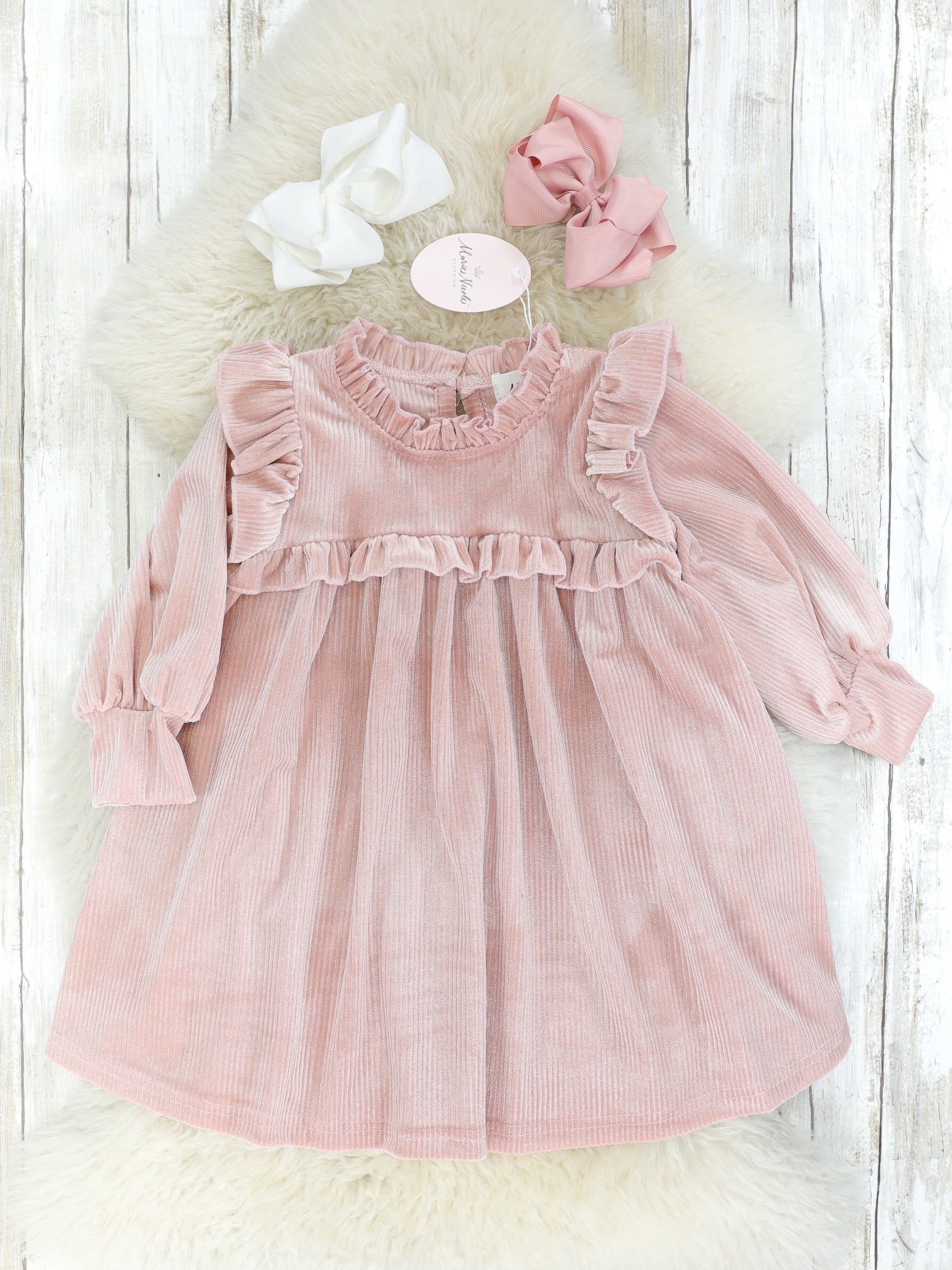 The cozy season is here & we have the softest dresses for your sweetheart! This mauve velvet dress features flutter trim around the neck, arms, and chest.