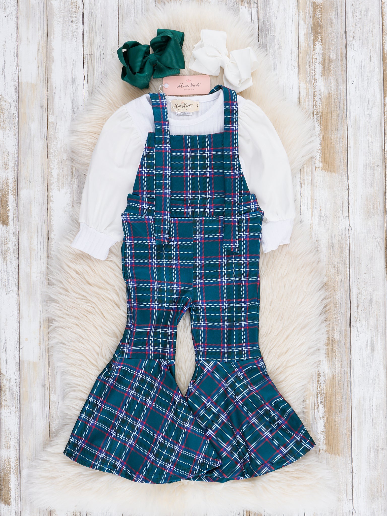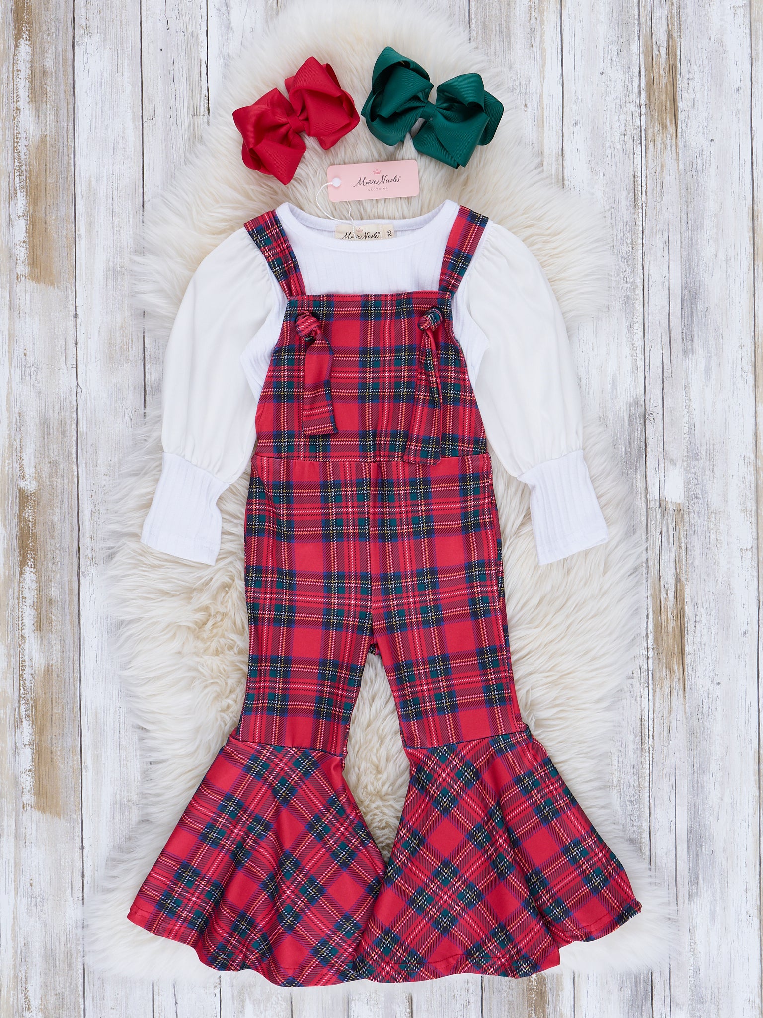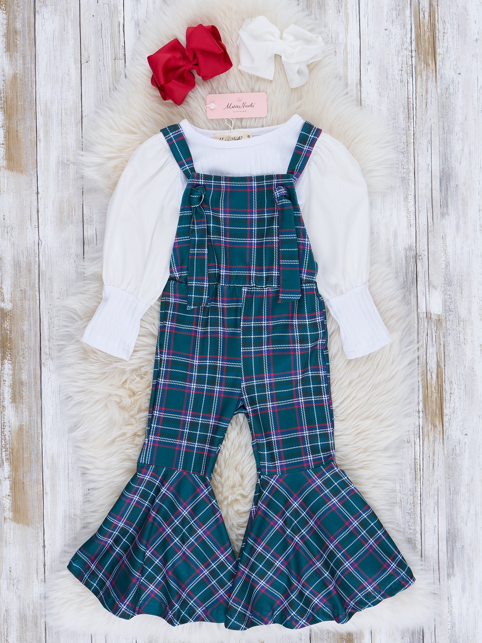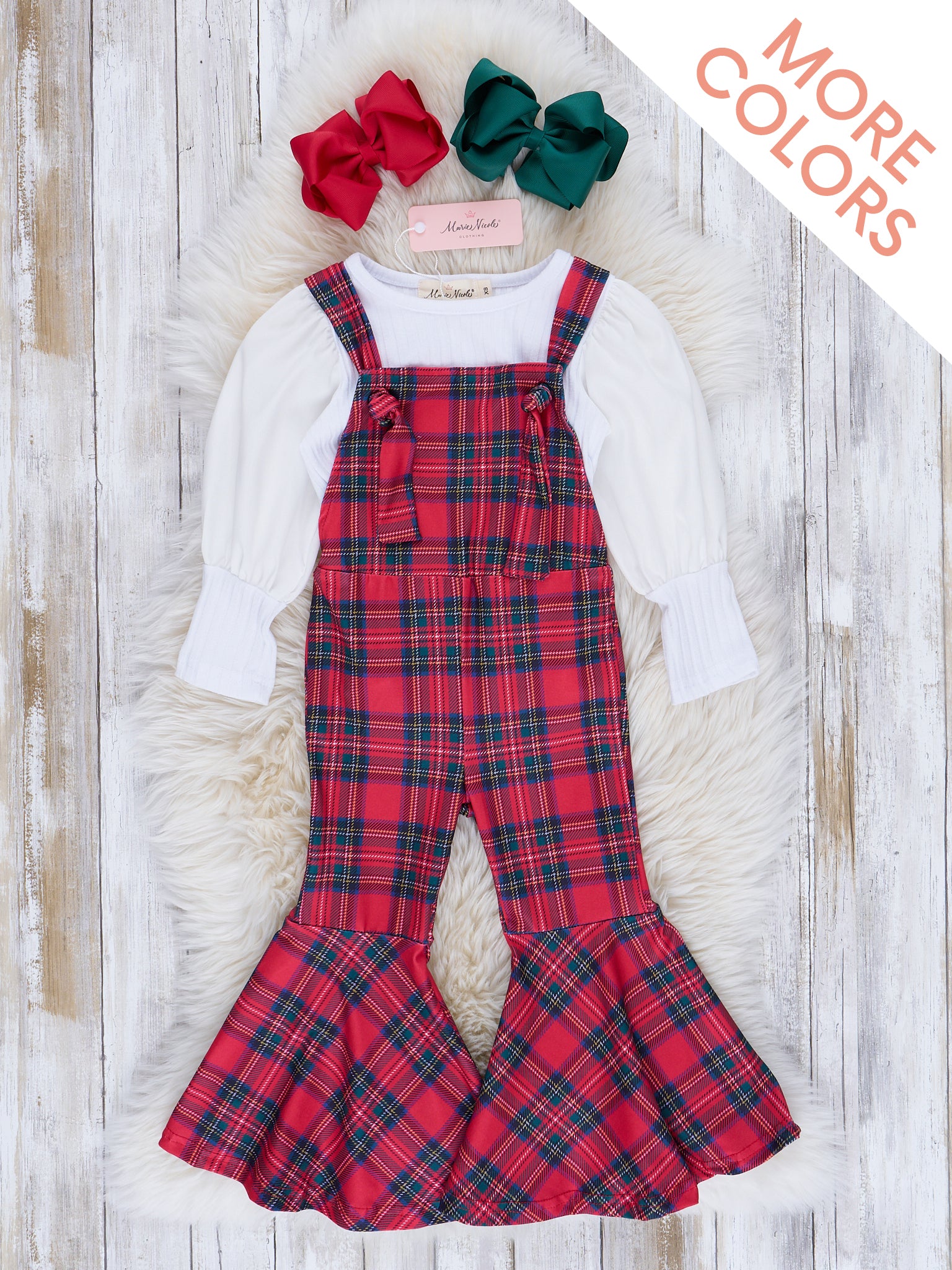 This Ribbed Puff Sleeves Bell Bottom Outfit mixes classic and modern style elements into a holiday-ready look. The white ribbed puff sleeves top and festive plaid bell bottom overalls make this the perfect outfit for a Christmas party! Get ready to rock around the (Christmas) tree in this stylish ensemble.