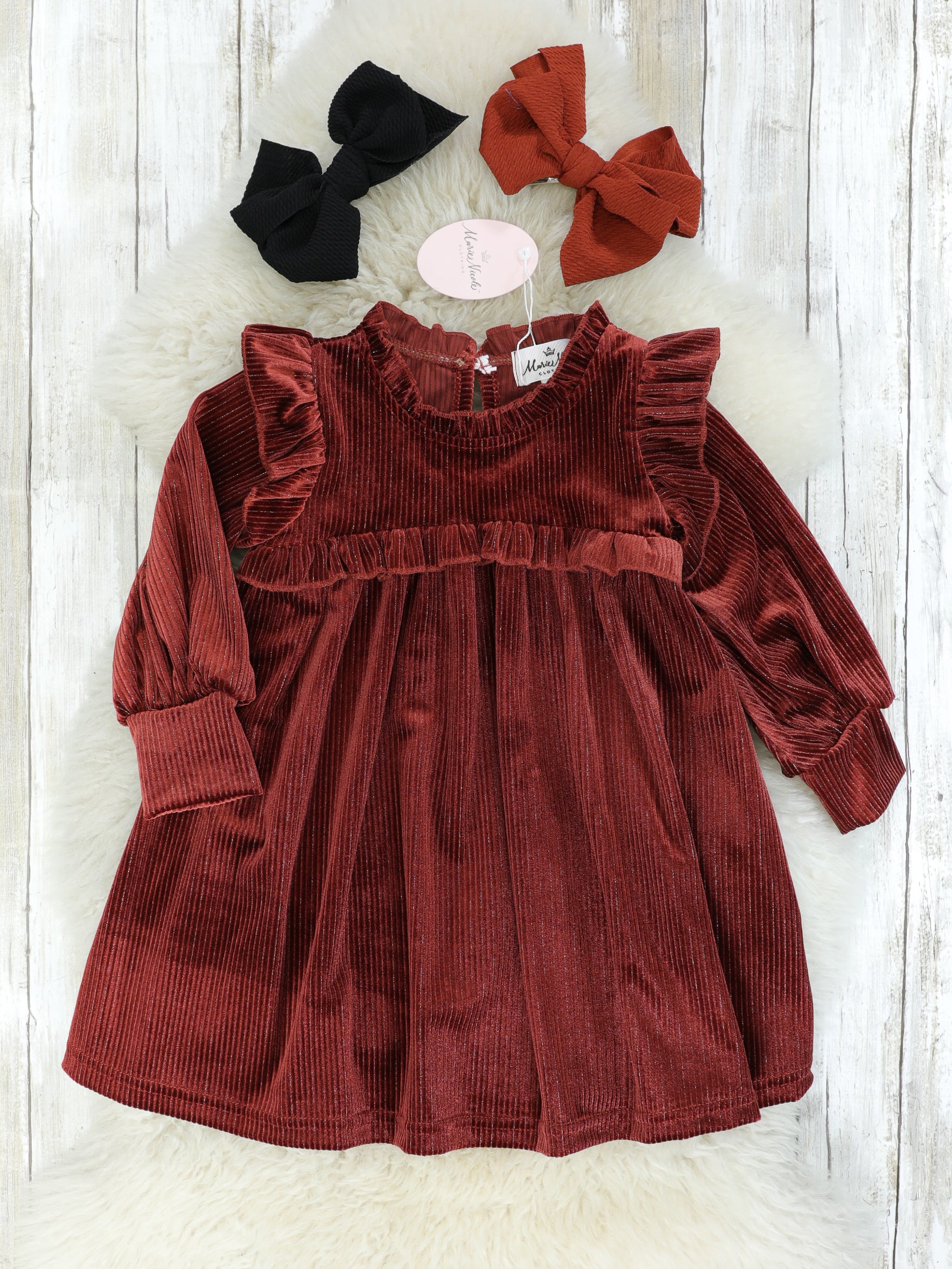 The cozy season is here & we have the softest dresses for your sweetheart! This rust velvet dress features flutter trim around the neck, arms, and chest.