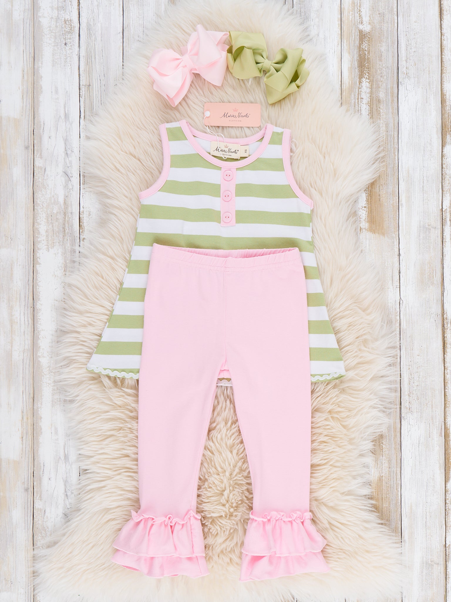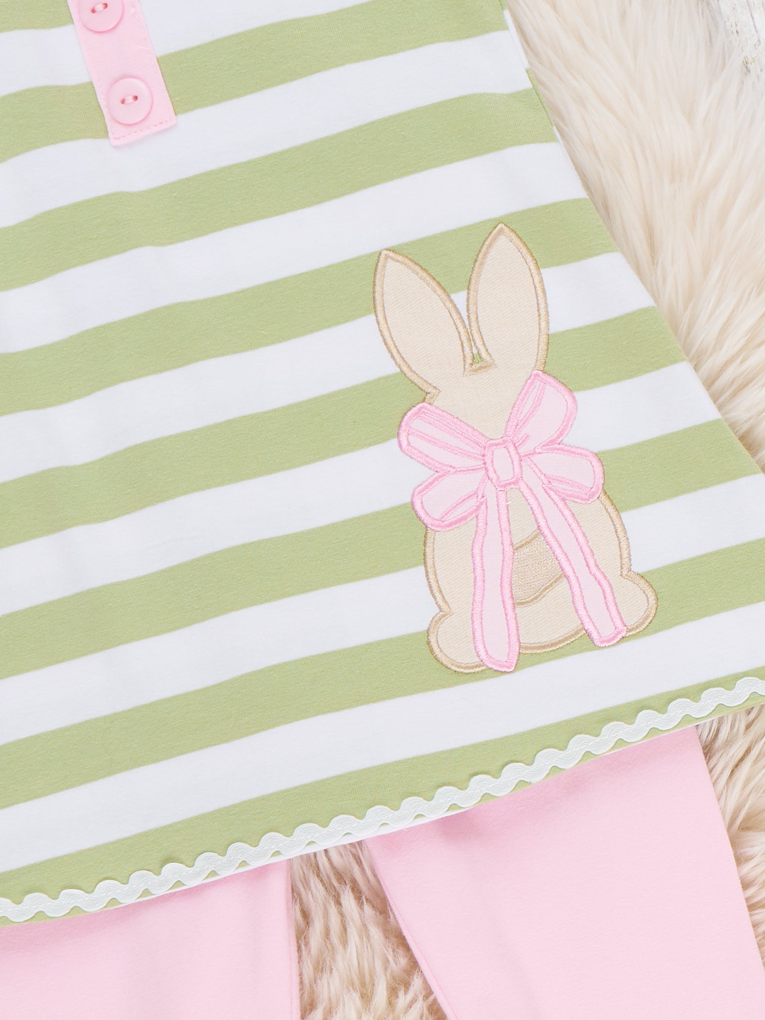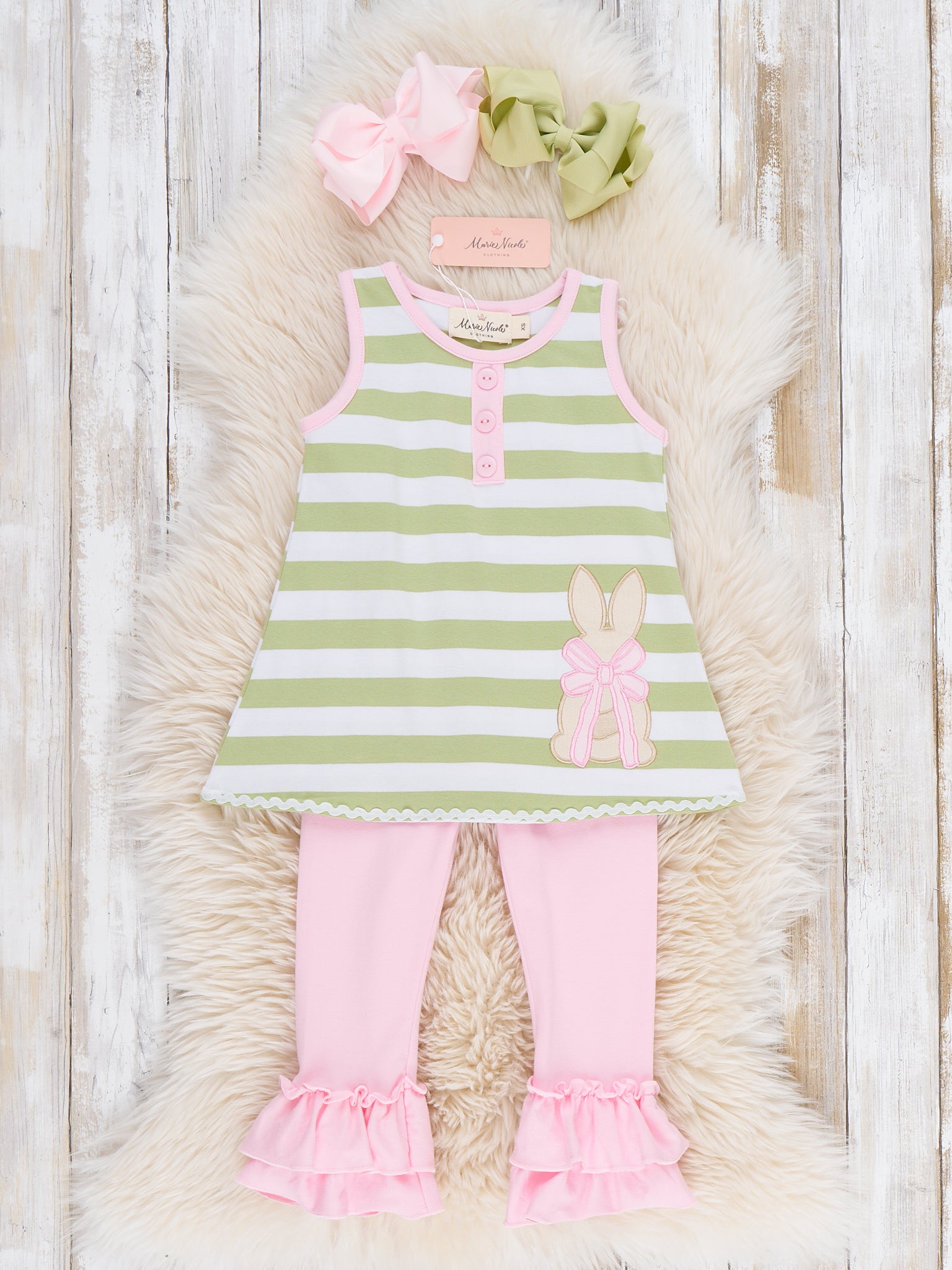 Ribbon Warren Stripe Embroidered Cotton Outfit by Marie Nicole Clothing features a sleeveless, striped knit top adorned with a charming bunny applique holding a ribbon, paired with soft ruffle-cuff leggings. The fresh, spring-ready look is perfect for playful days and special occasions. Gentle stretch and cheerful details make this set a delightful pick for your little one’s seasonal adventures.