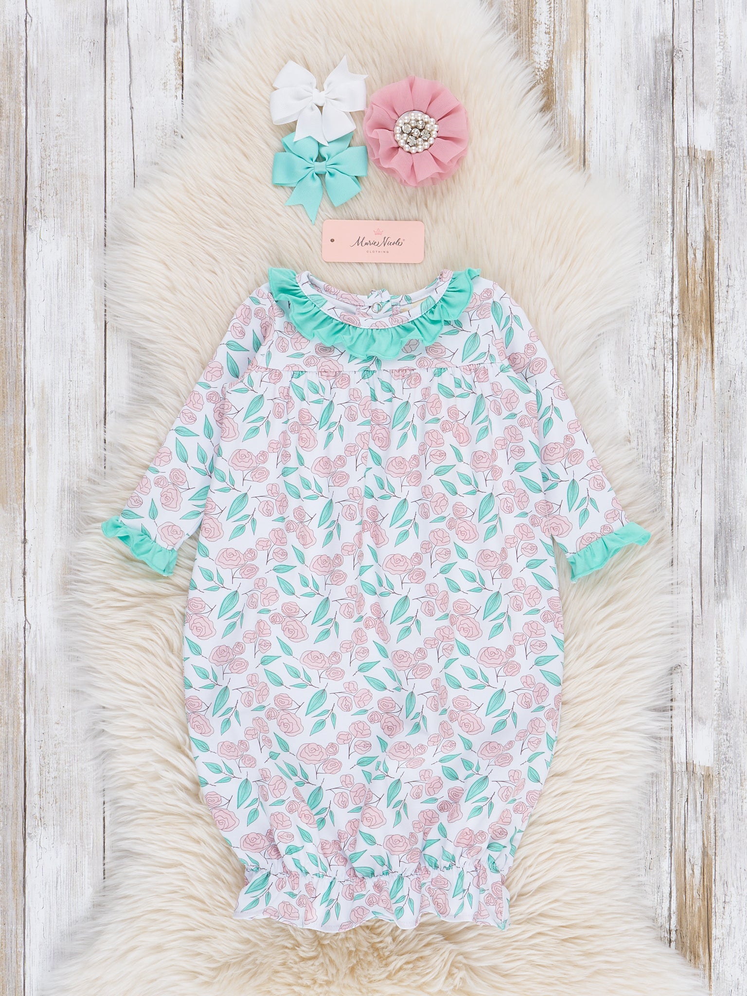Get your little one ready for a cozy night's sleep with our Rosewood Lane Ruffle Sleep Gown. This girls sleep gown features a delicate pink rose print and playful teal ruffle trim details. Pair it with our sister sleep set to make bedtime even more fun. Designed by Marie Nicole Clothing.