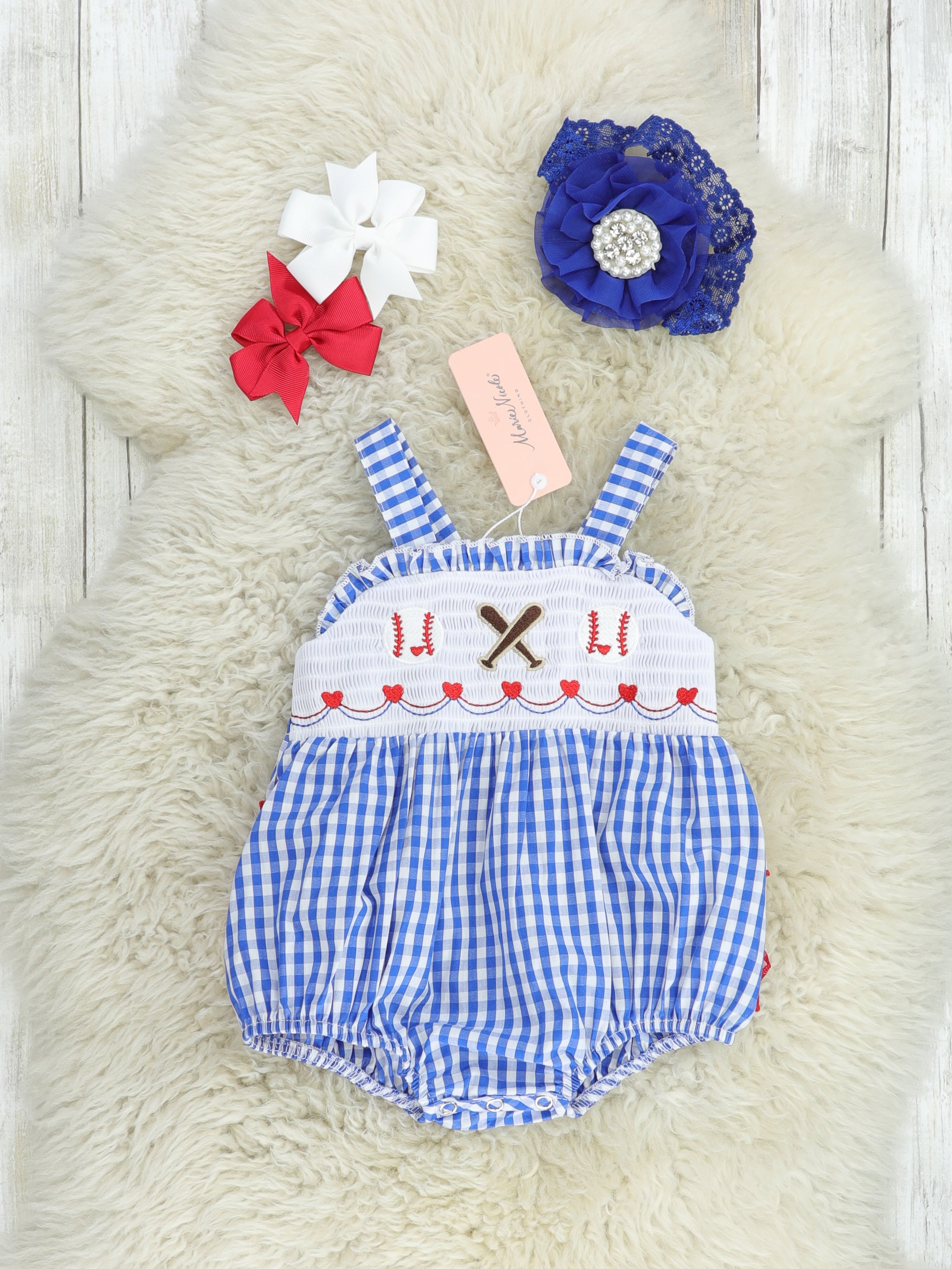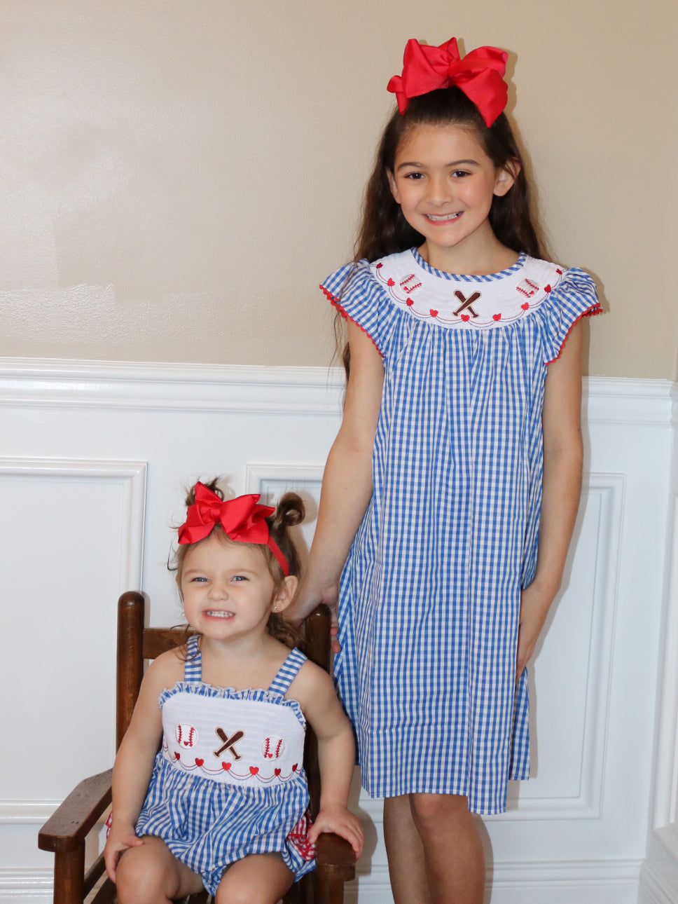 This sweet sibling set is a catch! This bubble features royal blue gingham, smocking, embroidered baseball details, & a ruffle butt.