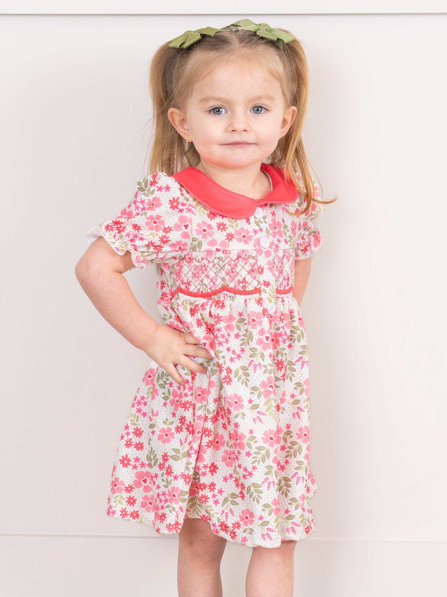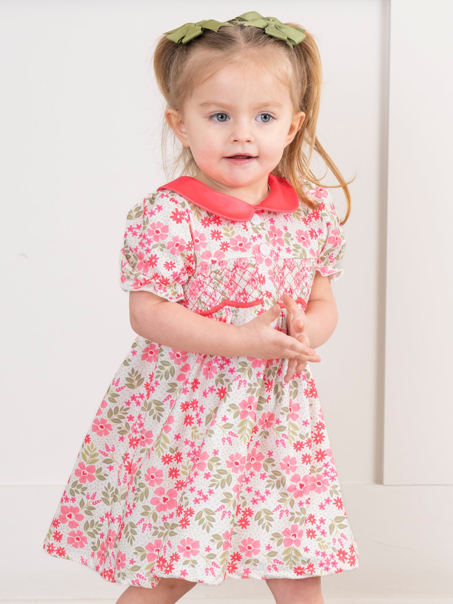 Get your little one ready for a wild adventure with our Ruby Wildflowers Smocked Bloomers Dress! This adorable set features a classic peter pan collar, smocking at the waist, and a vibrant wildflower print. Perfect for sisters to match and explore in style. Sisterhood never looked so cute!