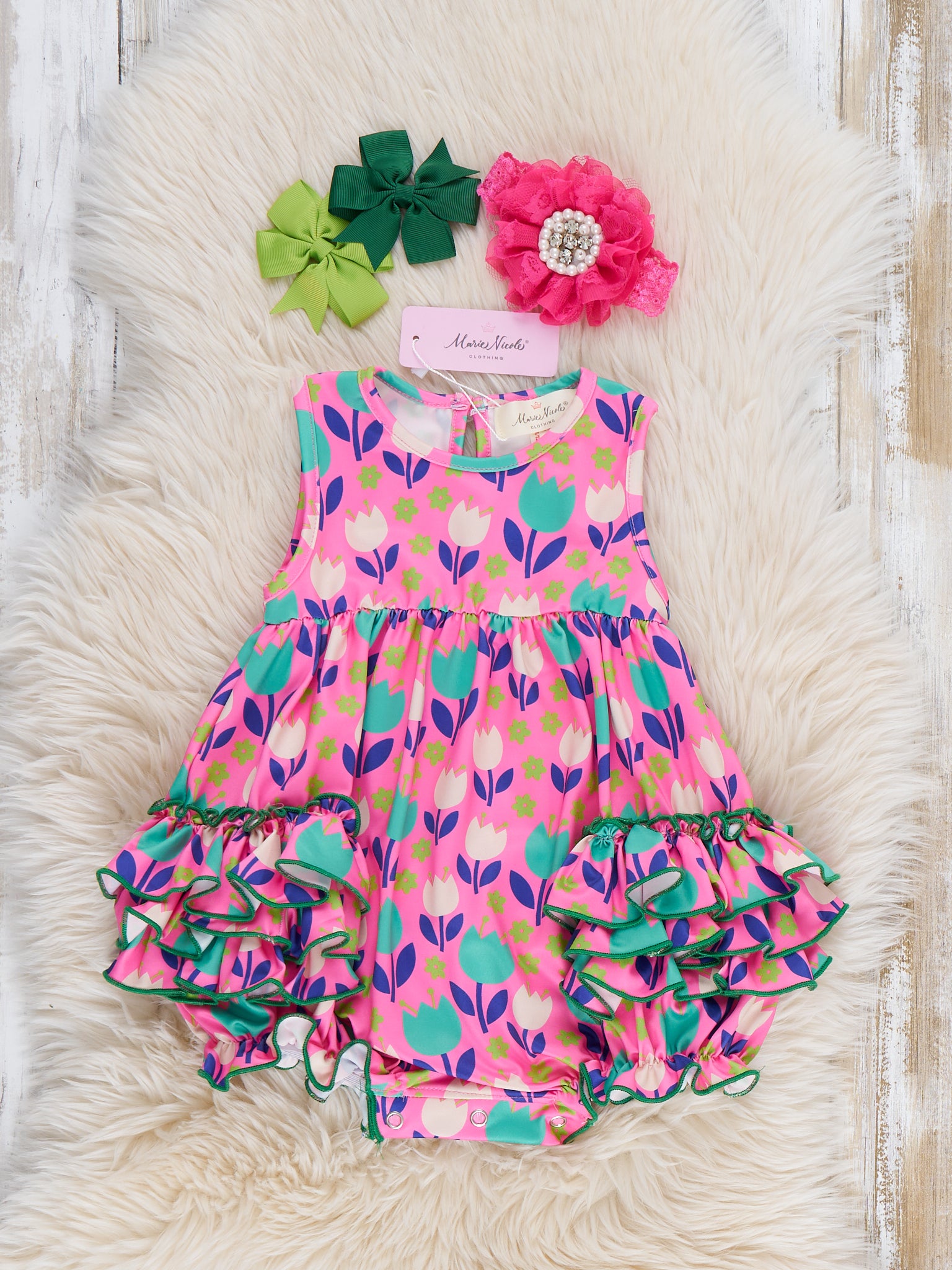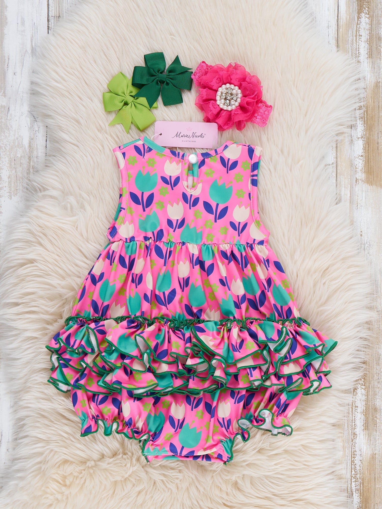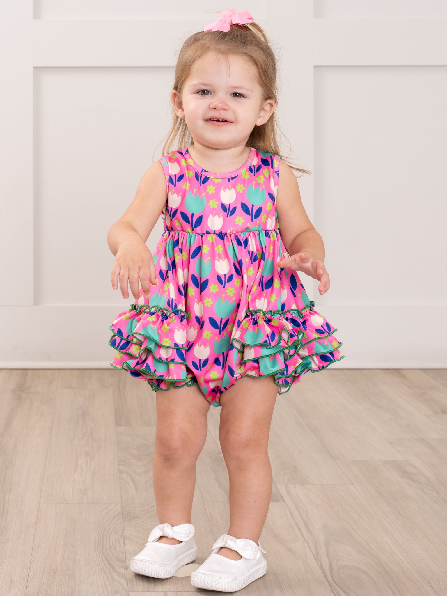 The Ruffle Bubble Romper in our Tulip pattern is perfect a sibling match. This top by Marie Nicole Clothing features tiered ruffles and a comfy sleeveless silhouette for those sunny playdates and vacation fun!