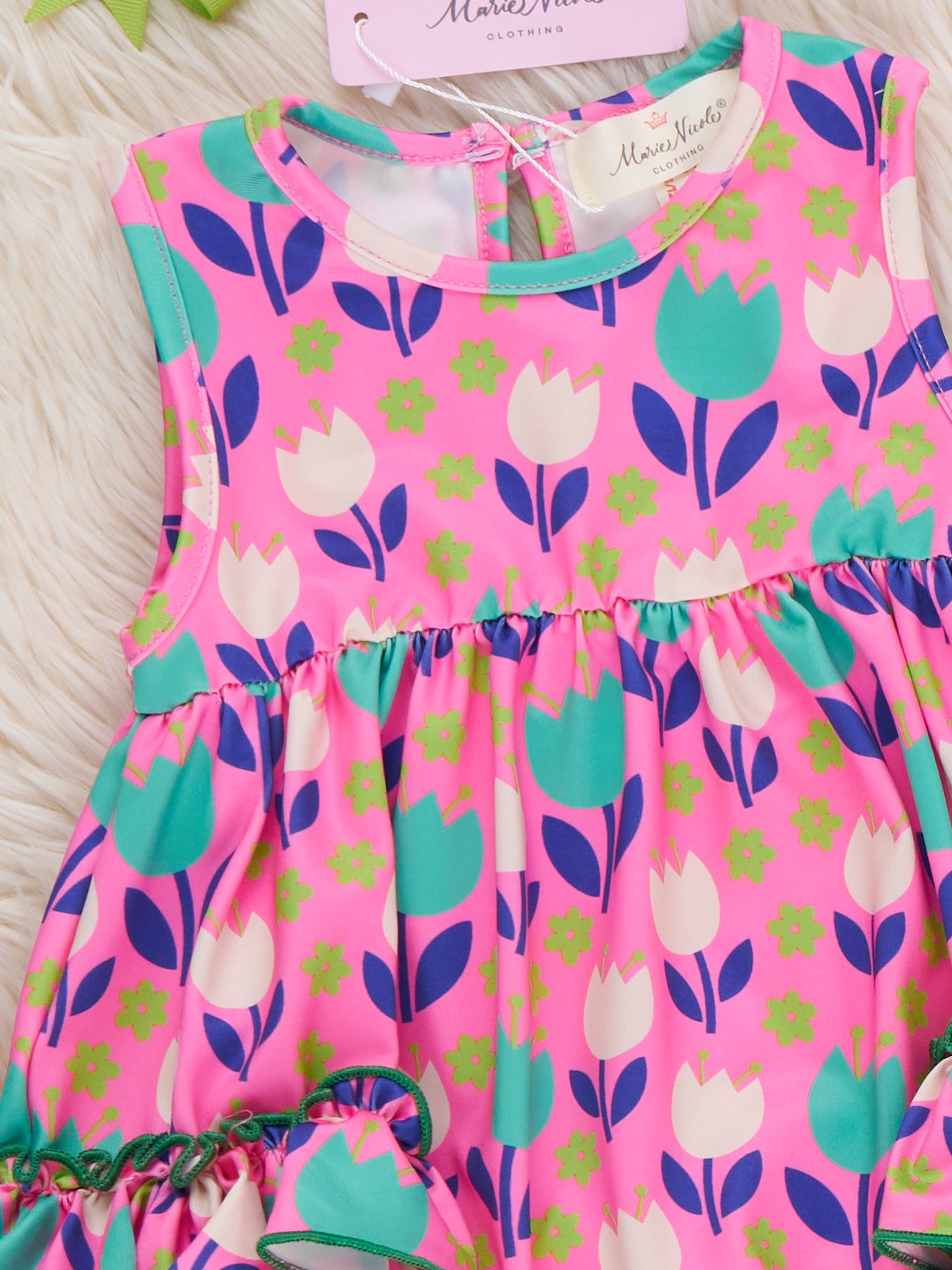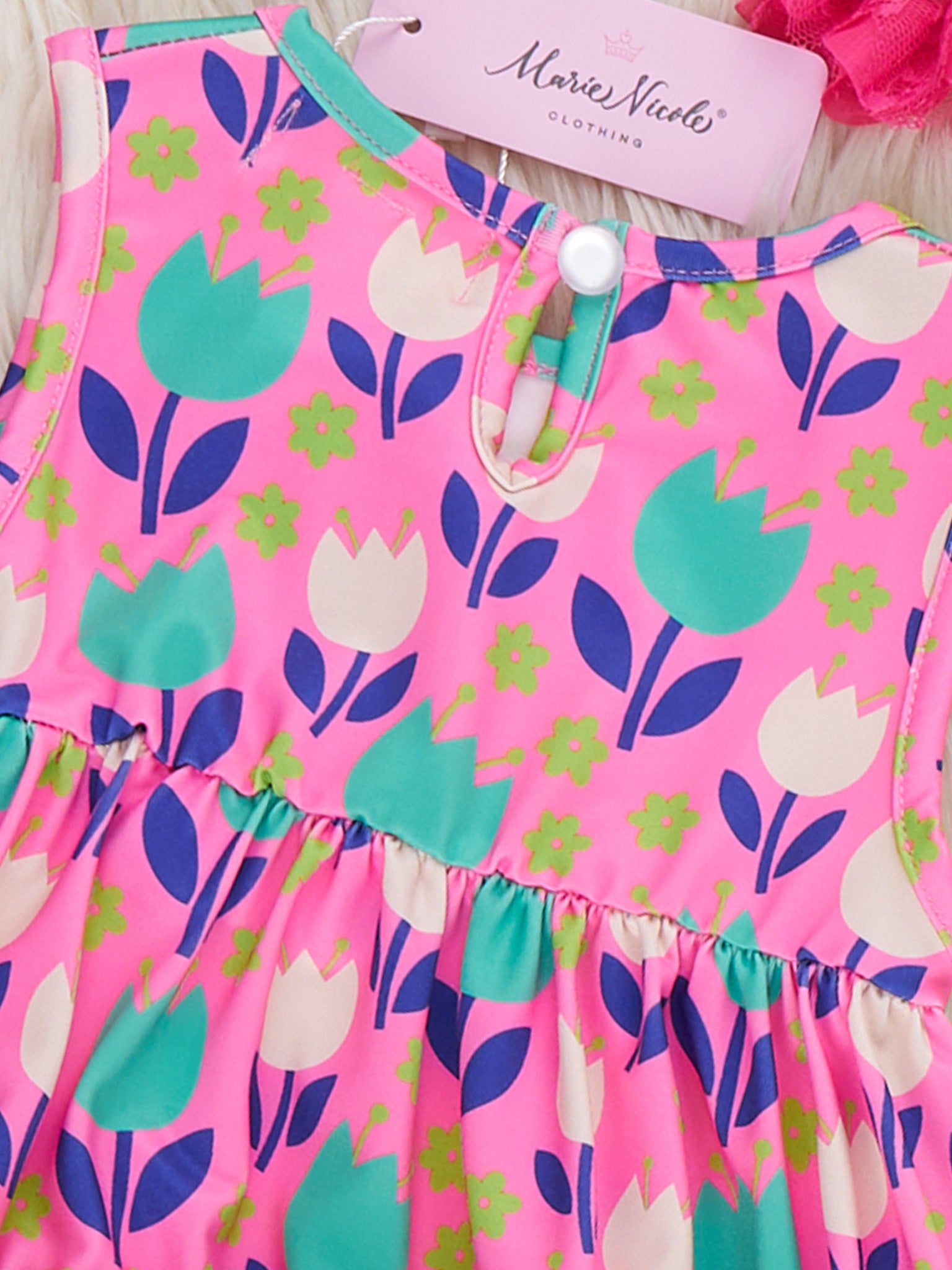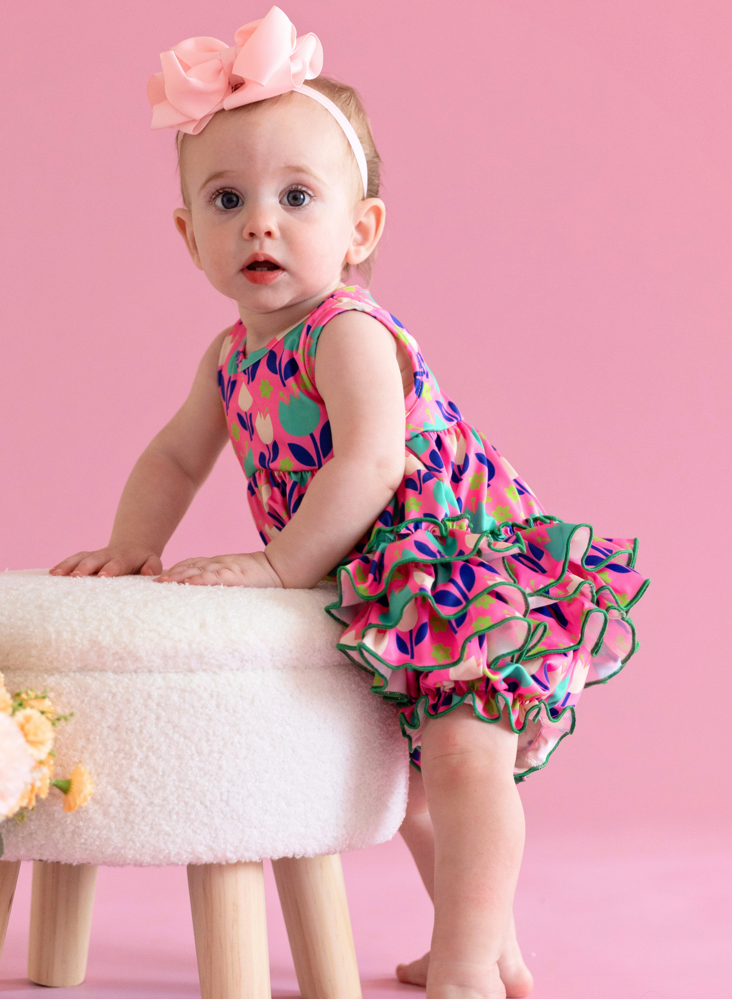 The Ruffle Bubble Romper in our Tulip pattern is perfect a sibling match. This top by Marie Nicole Clothing features tiered ruffles and a comfy sleeveless silhouette for those sunny playdates and vacation fun!