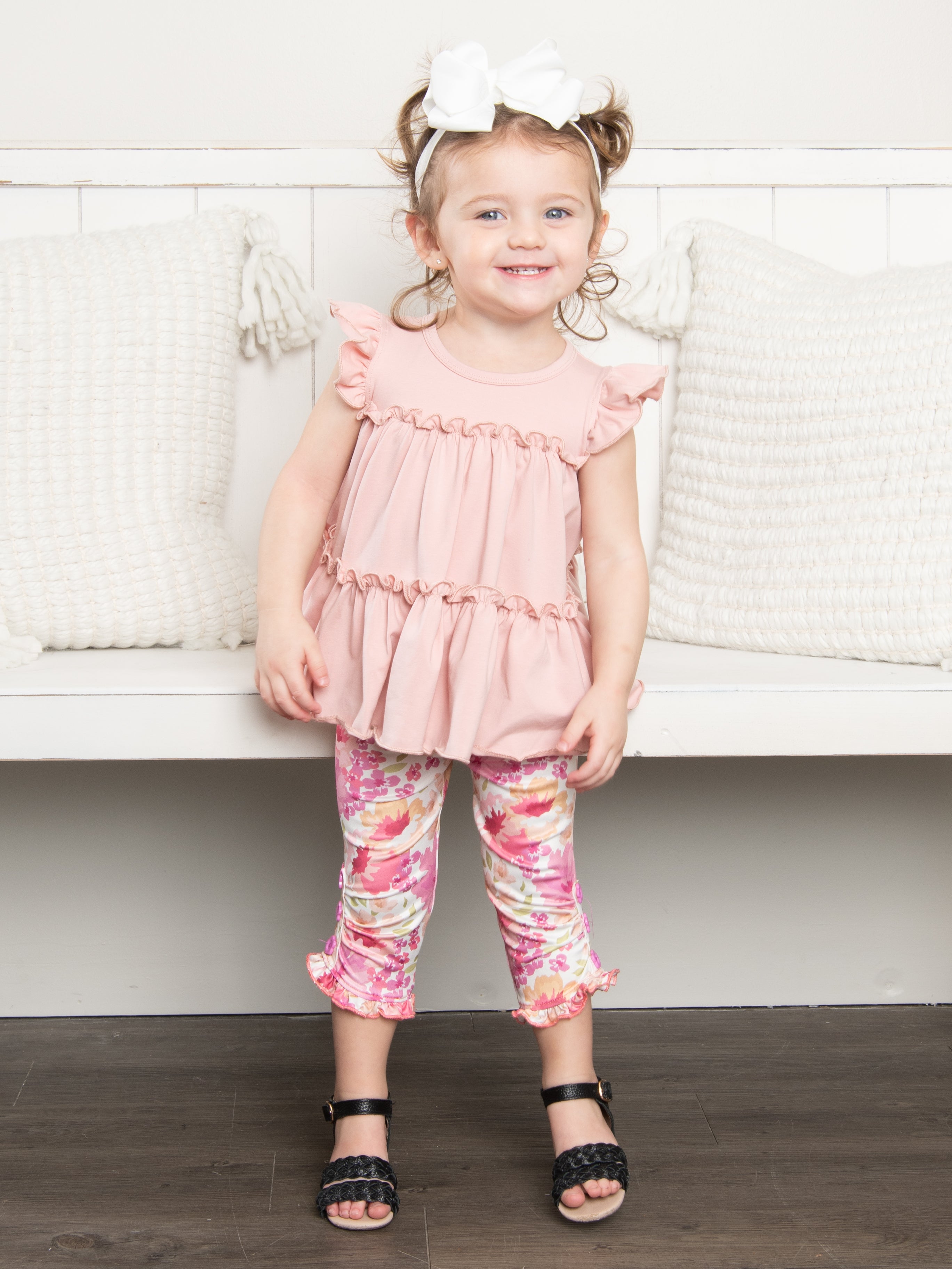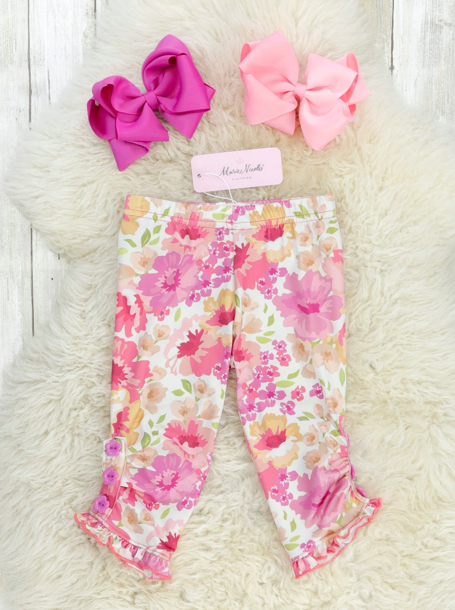 These darling capris are a closet staple! These beautiful capris feature a sweet pink peony design, cinches at the ankles, decorative buttons, a ruffle hem line, & an elastic waistband for east changing.