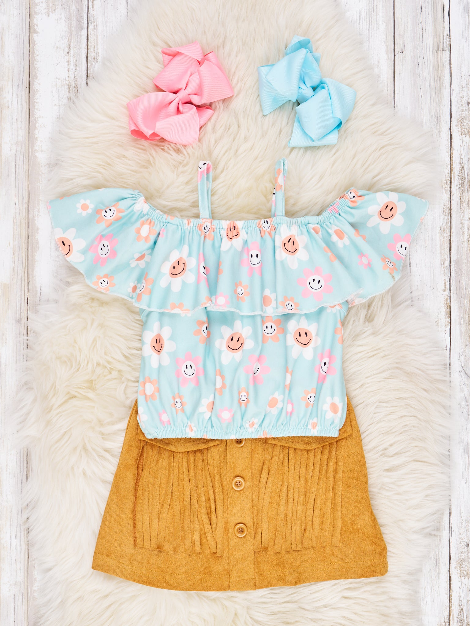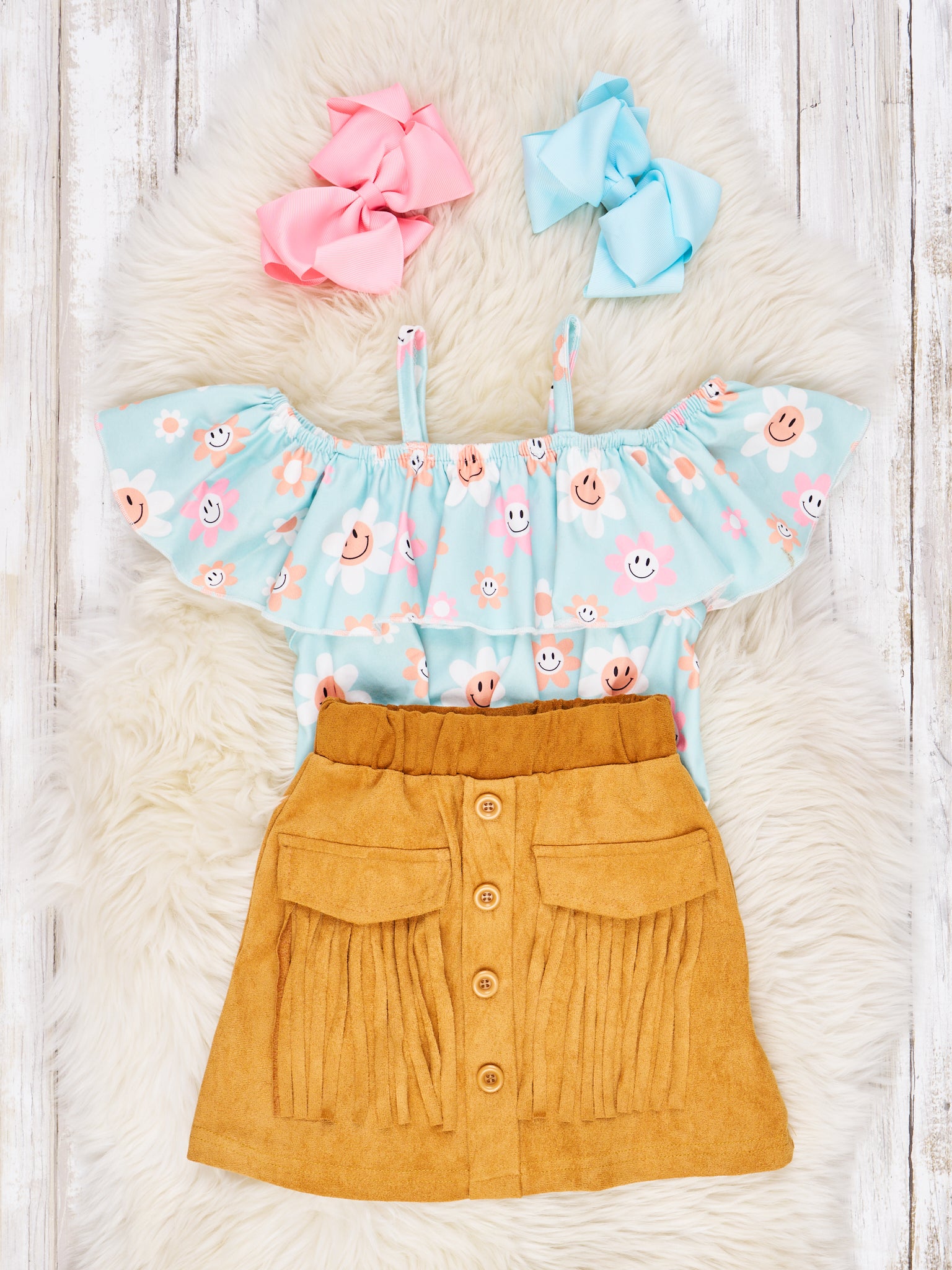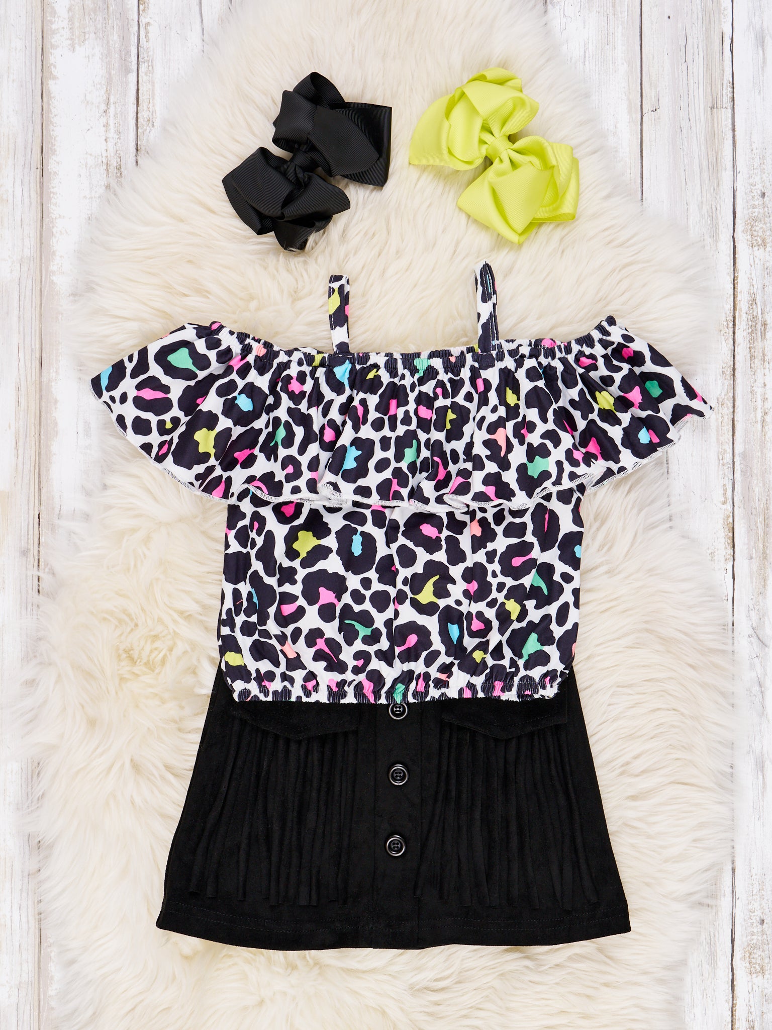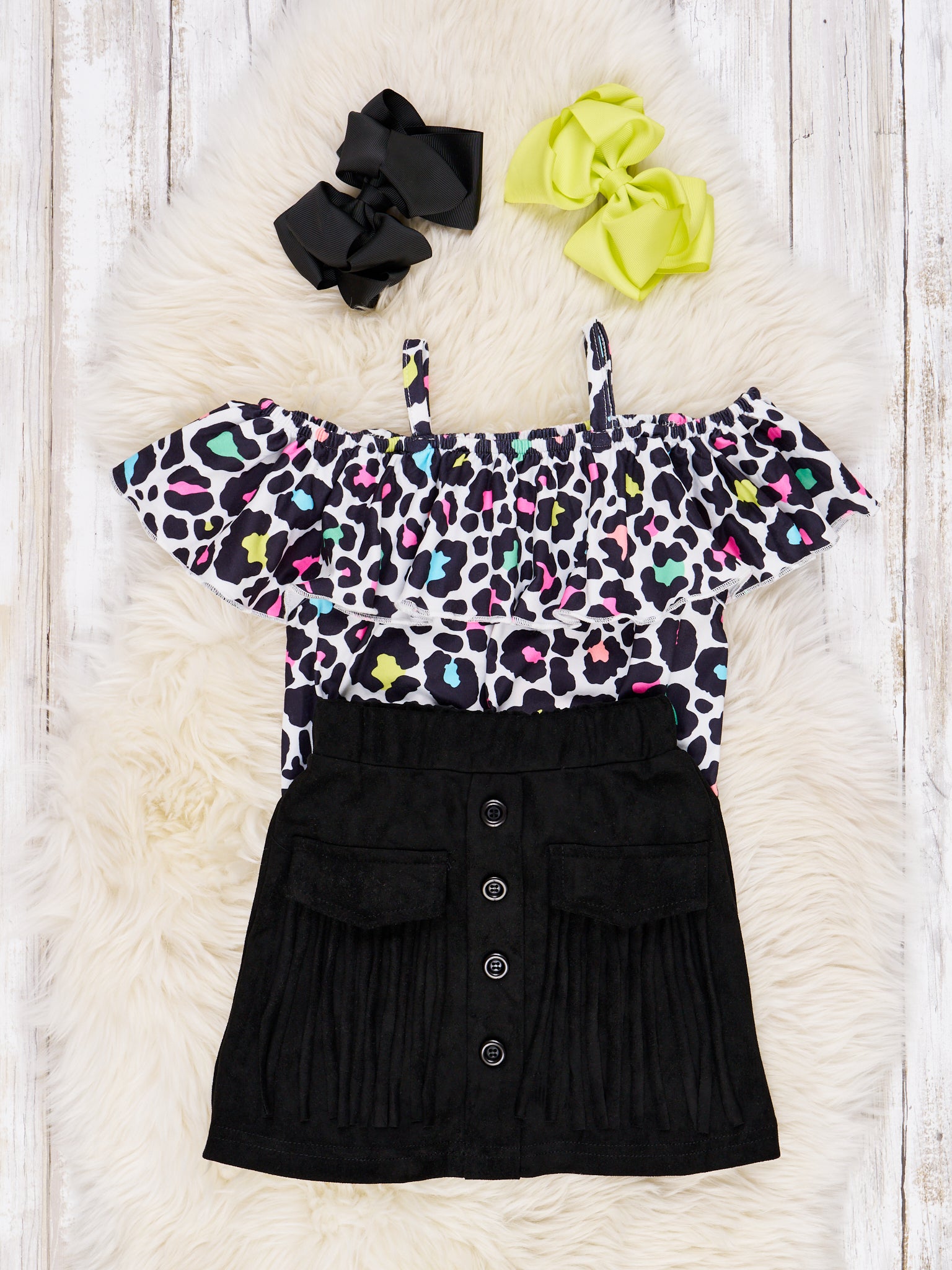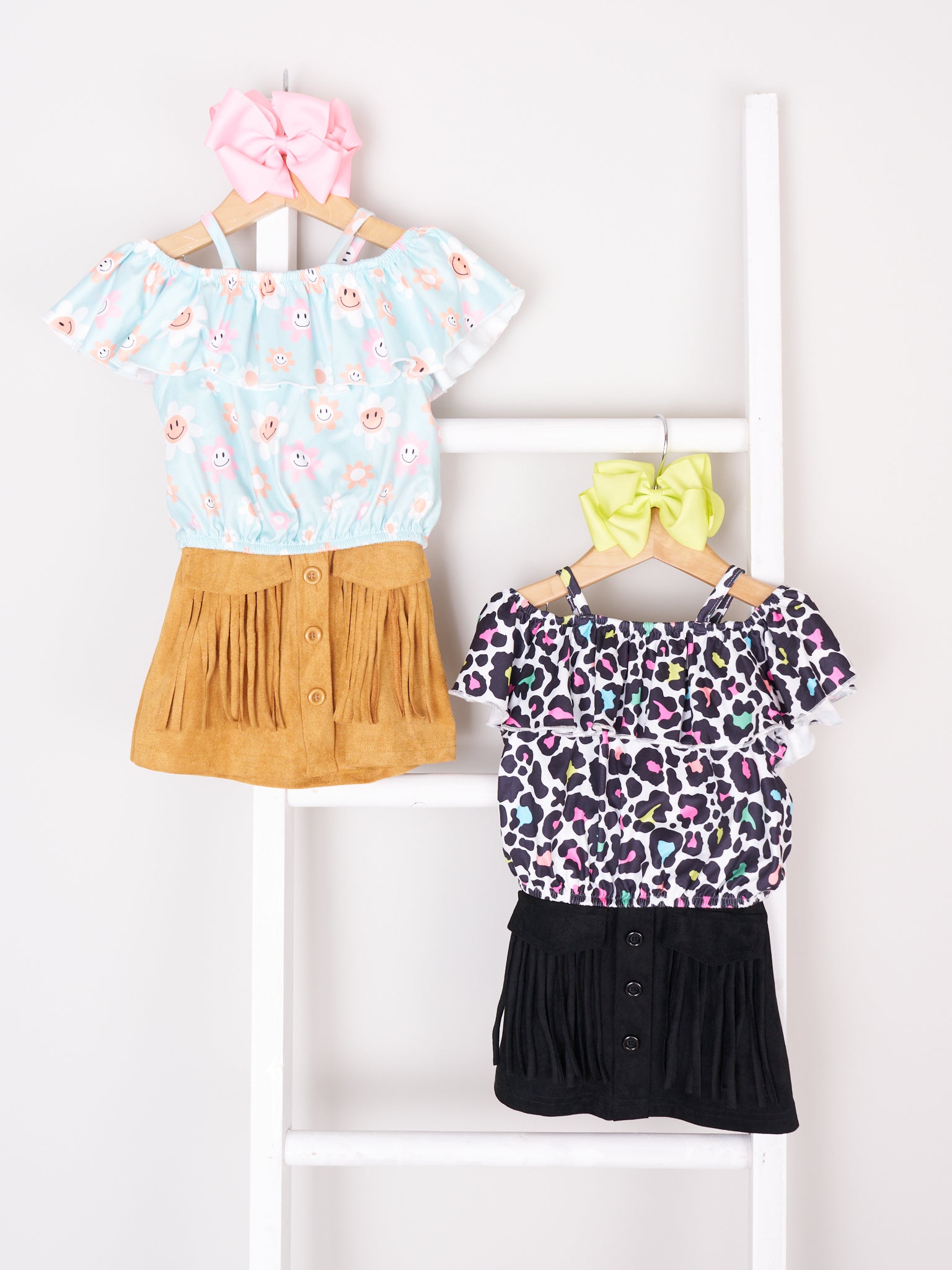 A chic outfit for the little one! Your child will look so cute in this off-the-shoulder top with a ruffle neckline and elastic waistband skirt. Enough playfulness for the playground, yet totally suited for a special occasion. Dress to impress!