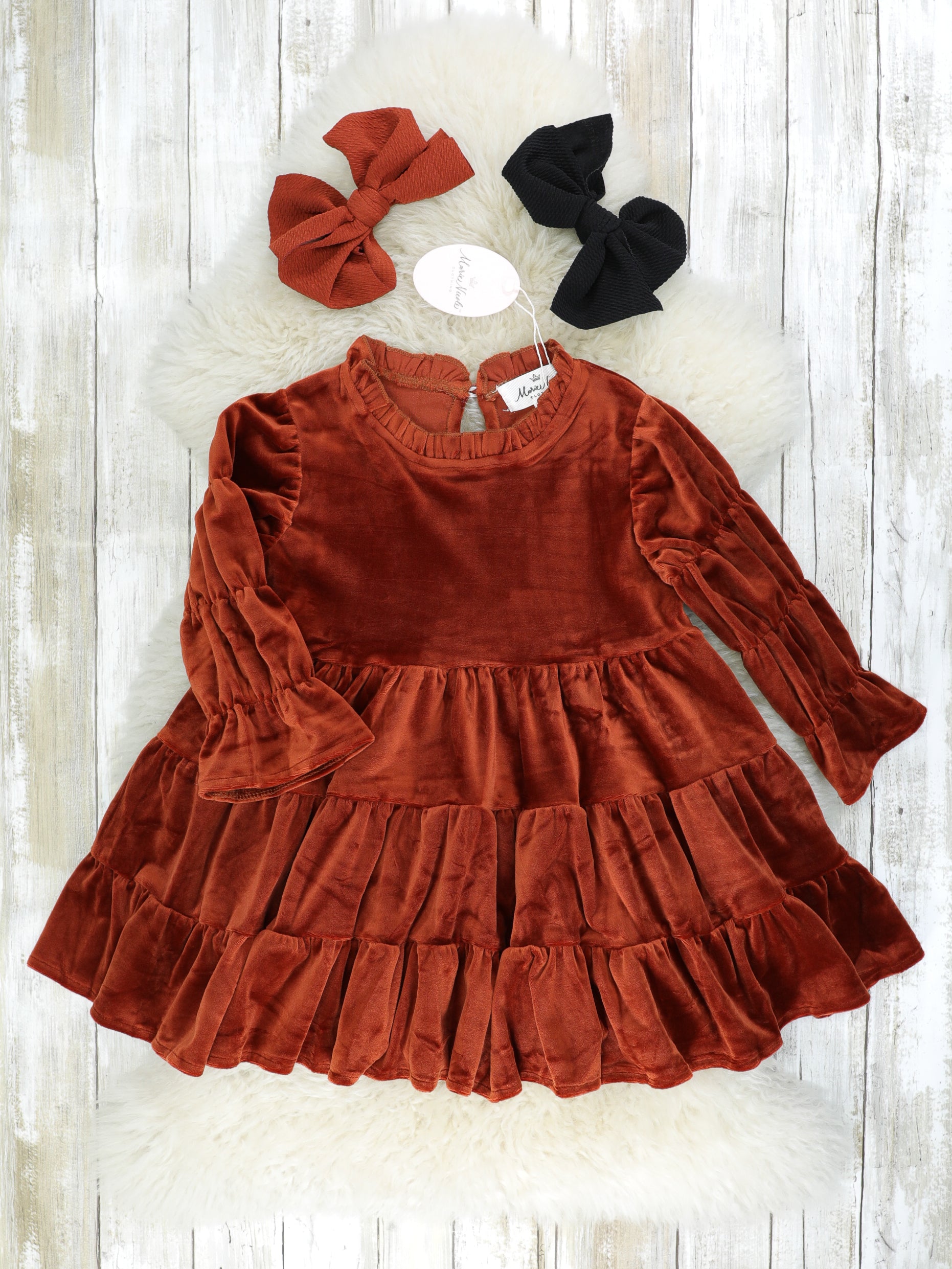 The softest velvet for the sweetest girls! This rust velvet dress features a tiered dress skirt, sleeves, & a keyhole at the back of the neck.