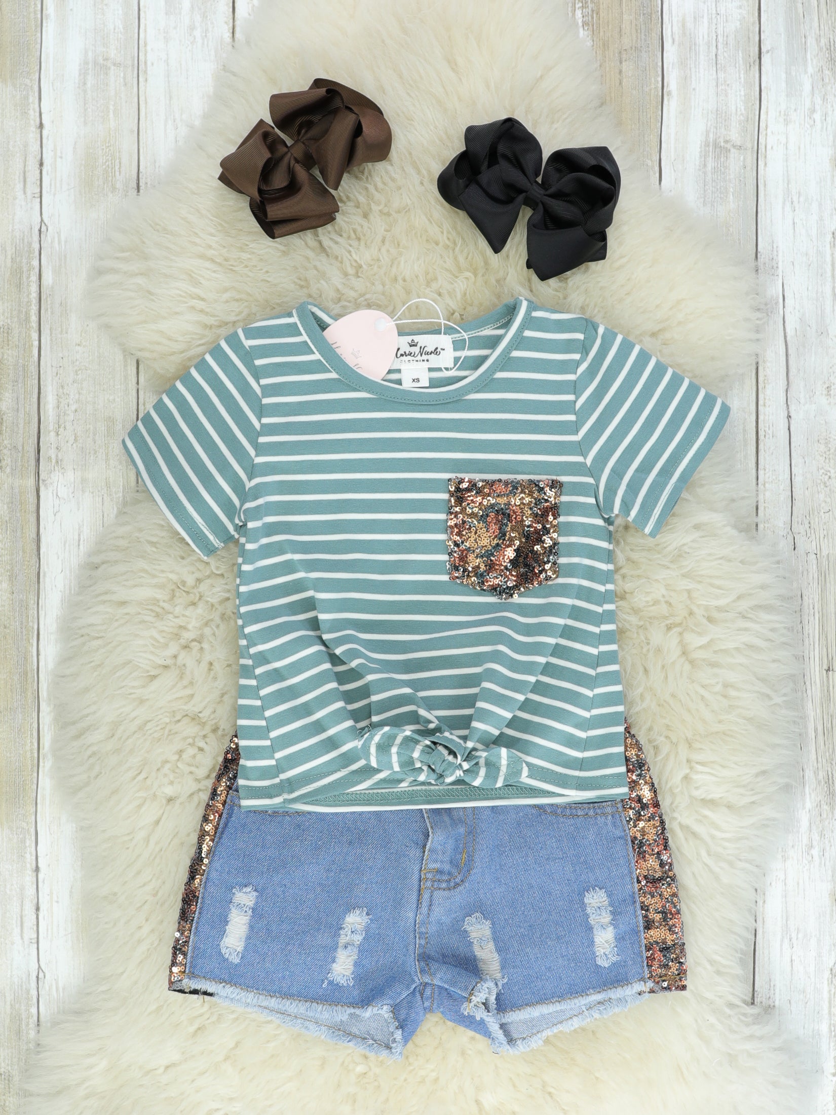The perfect outfit for your girl who loves glitter! This outfit features a sage tee with a multicolor sequin pocket & knot tie; the bottoms are distressed with matching multicolor sequins lining the sides.