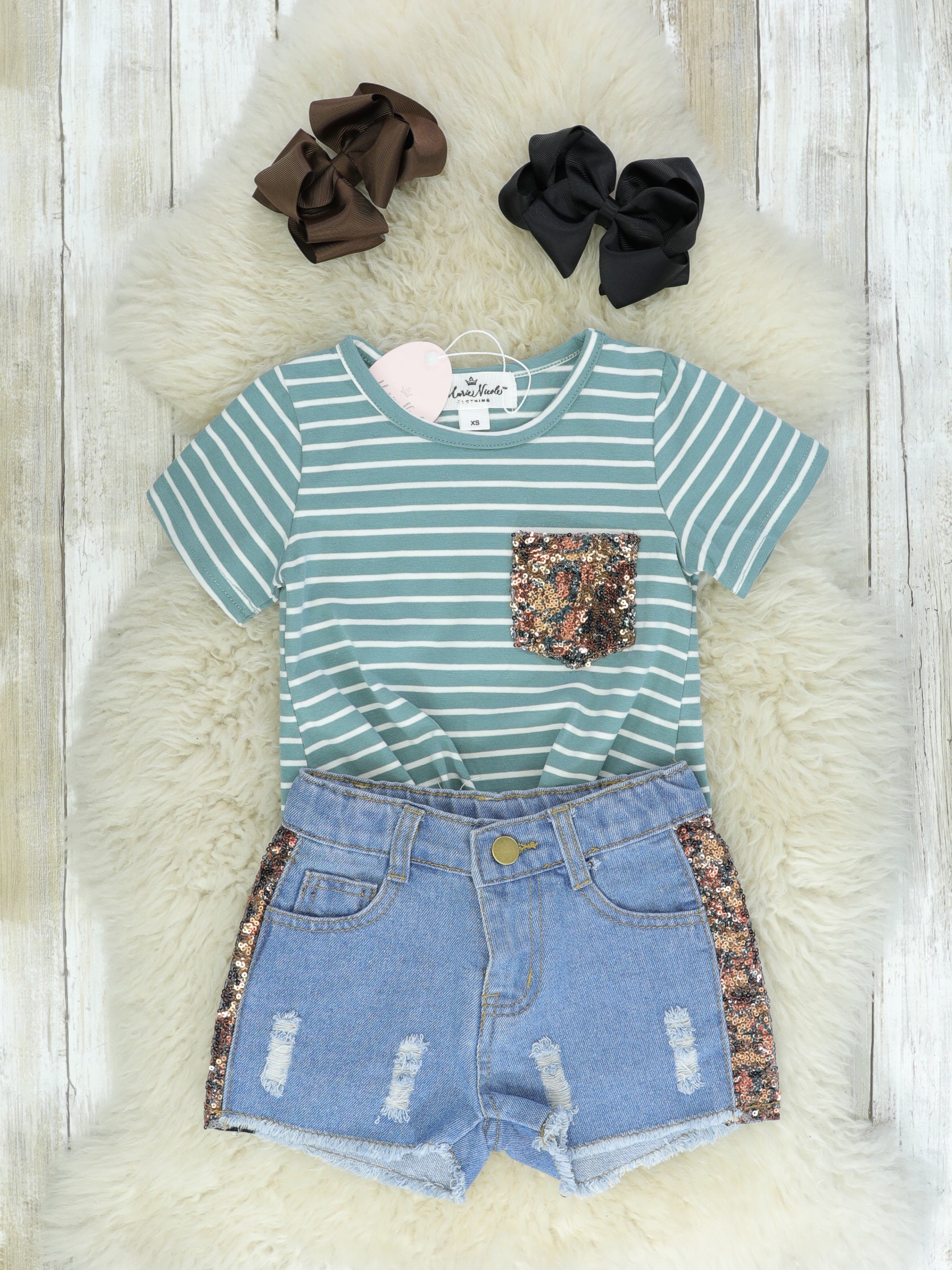 Sage Sequin Pocket Tee & Denim Shorts Outfit