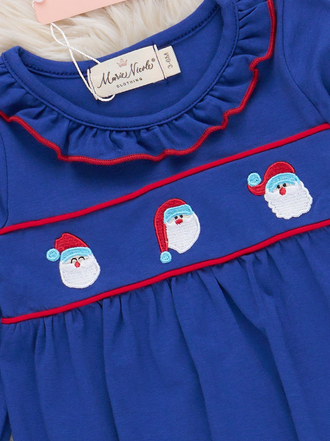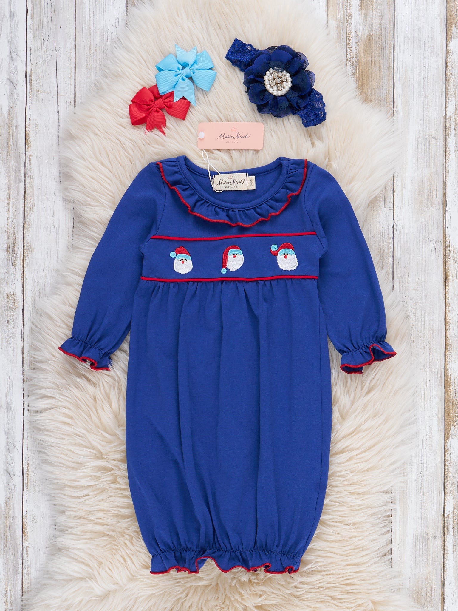 The Santa Parade Embroidered Ruffle Sleeper Gown by Marie Nicole features festive embroidered designs along the gathered neckline, paired with gentle ruffle accents at the collar and cuffs. Its relaxed, stretchy silhouette with elasticized hem makes nighttime changes easy, bringing a cheerful holiday touch to cozy sleep.