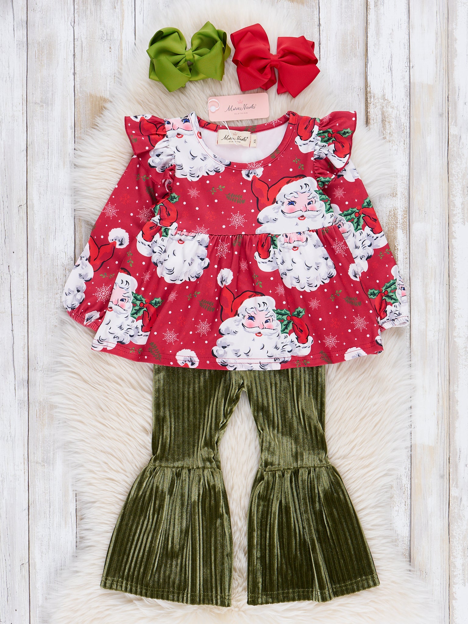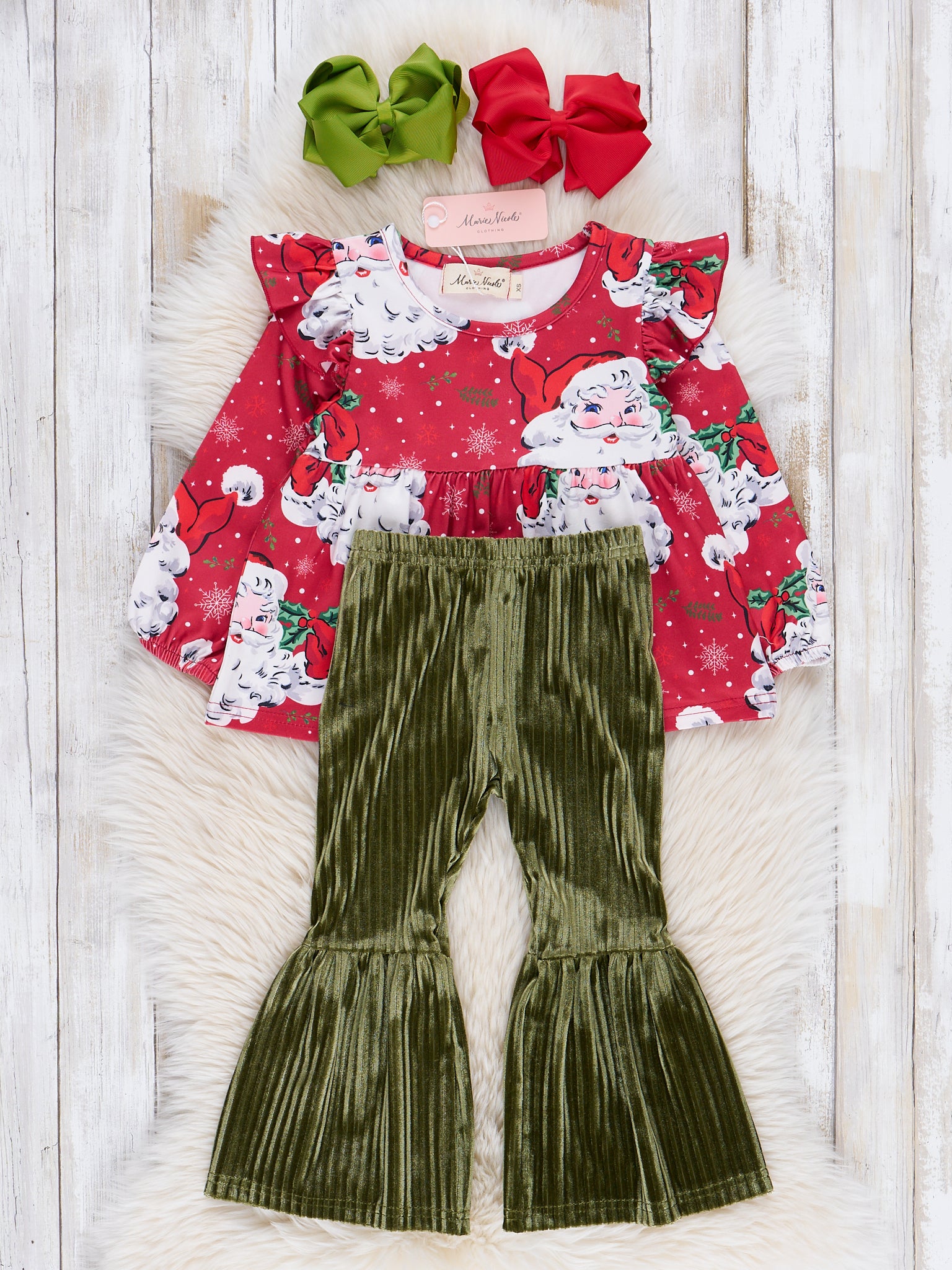 The sweetest Santa outfit for your little elf! This outfit by Marie Nicole Clothing features a red peplum top with Santa details, flutter trim, & ribbed velvet bell bottoms.