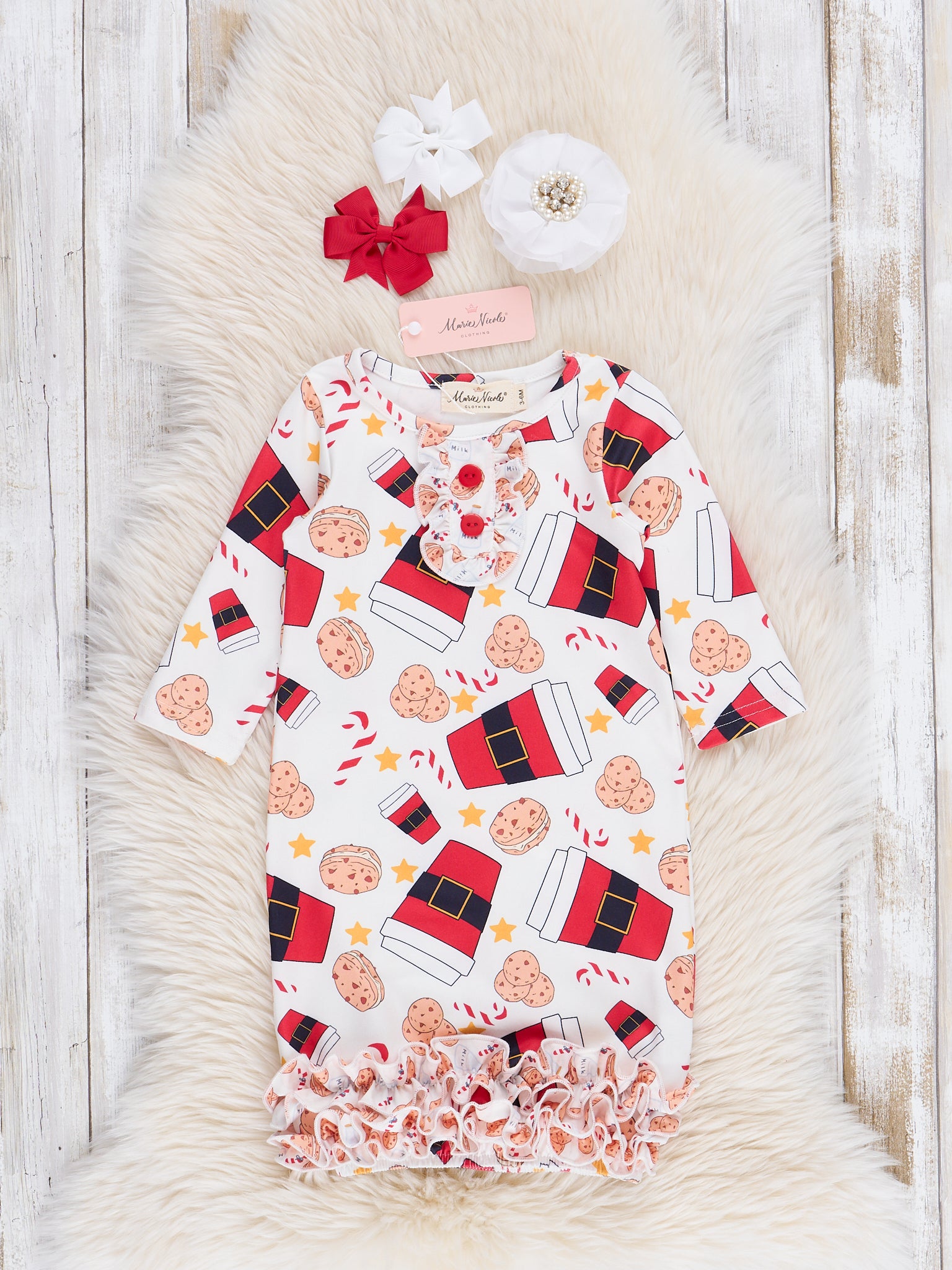 Get your little one in the holiday spirit with our Santa Treats Ruffle Infant Gown! This adorable girls' infant gown features a festive Christmas print of cookies and Santa's cup of cocoa. The icing ruffle hem adds a sweet touch. Bring on the cuteness overload!