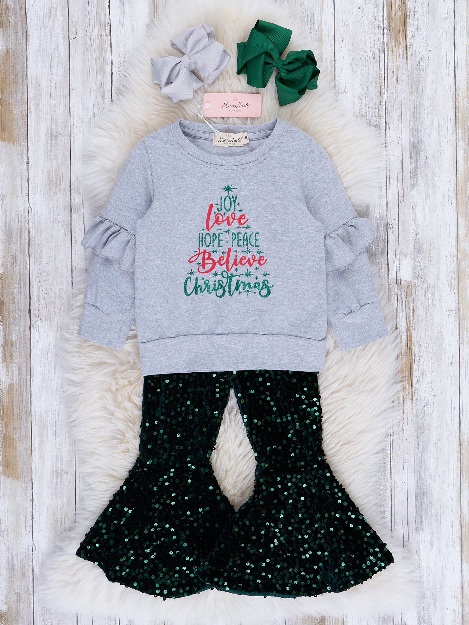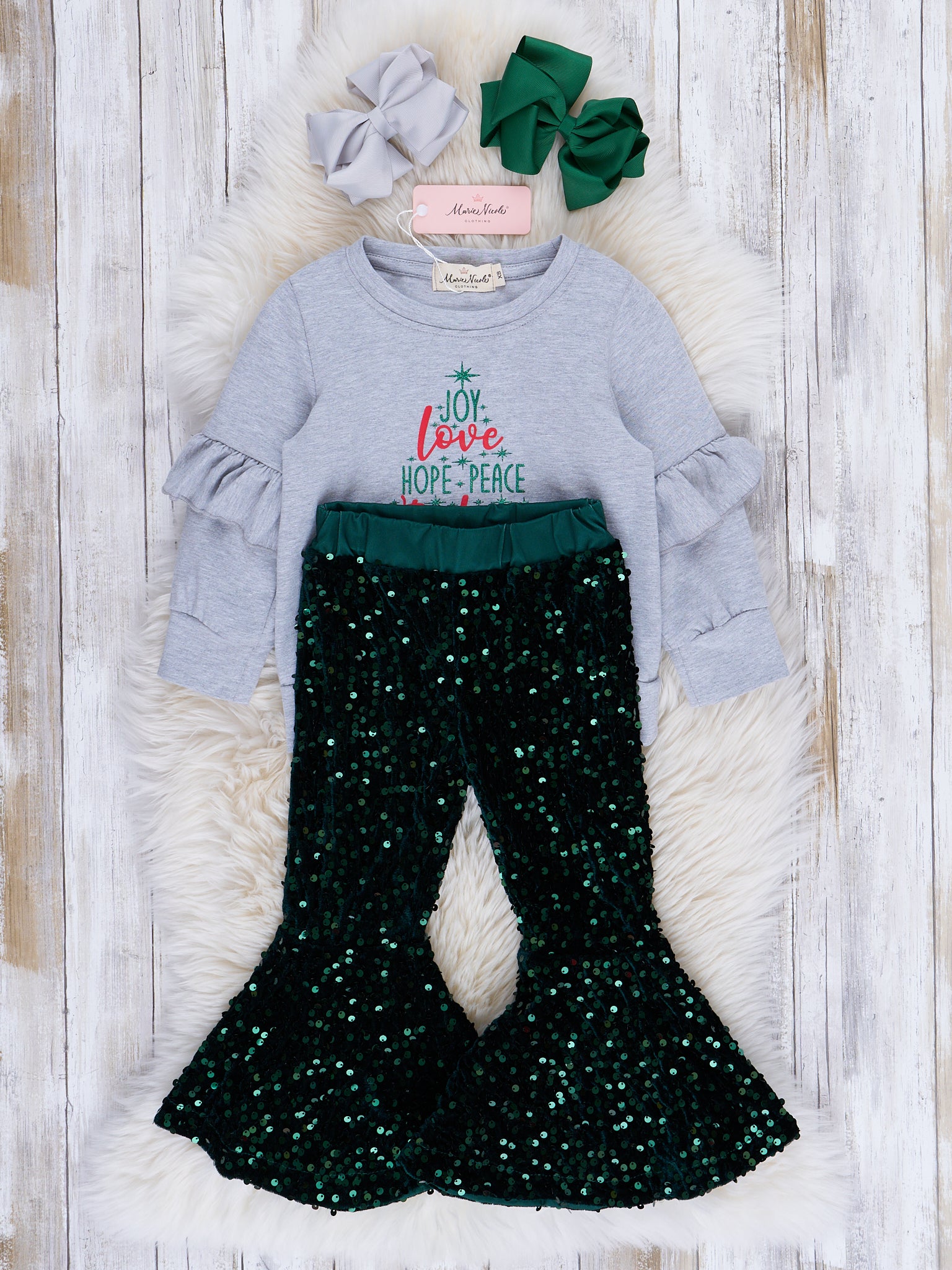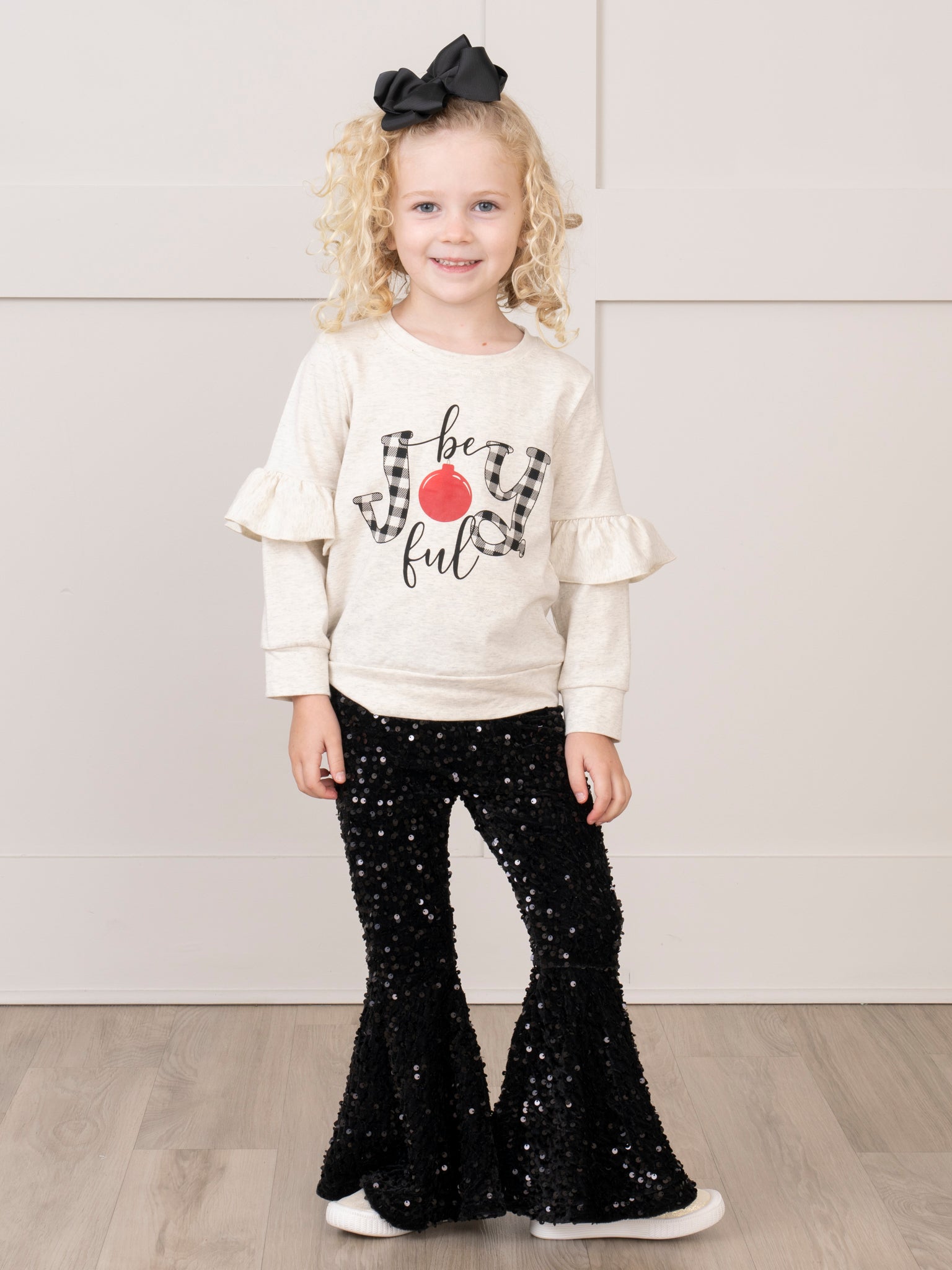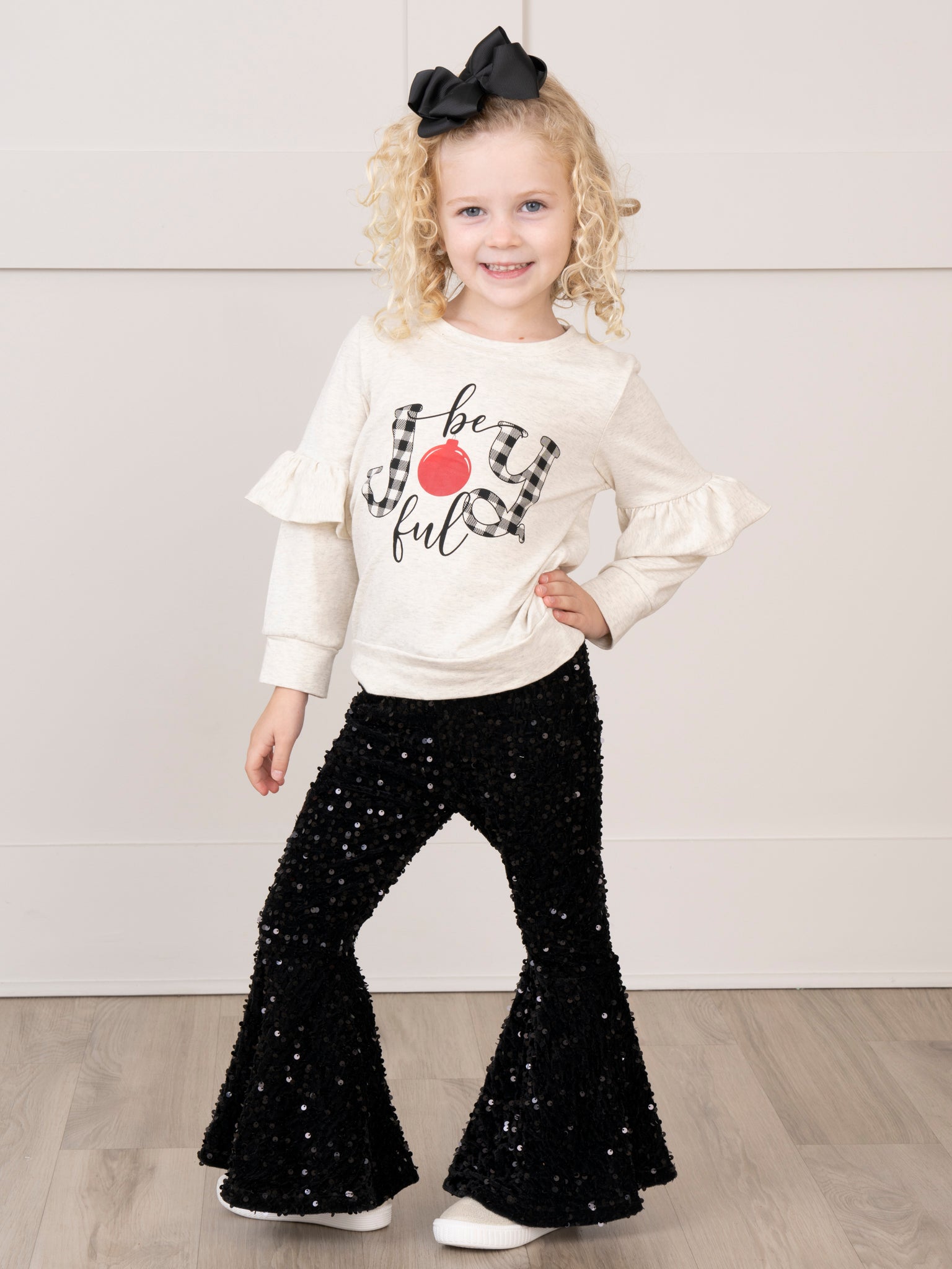 Let your little one become a walking winter wonderland in this dazzling ensemble featuring a ruffle sleeve holiday crew neck and sequin pull-on bell bottoms that will have her twirling through the season!