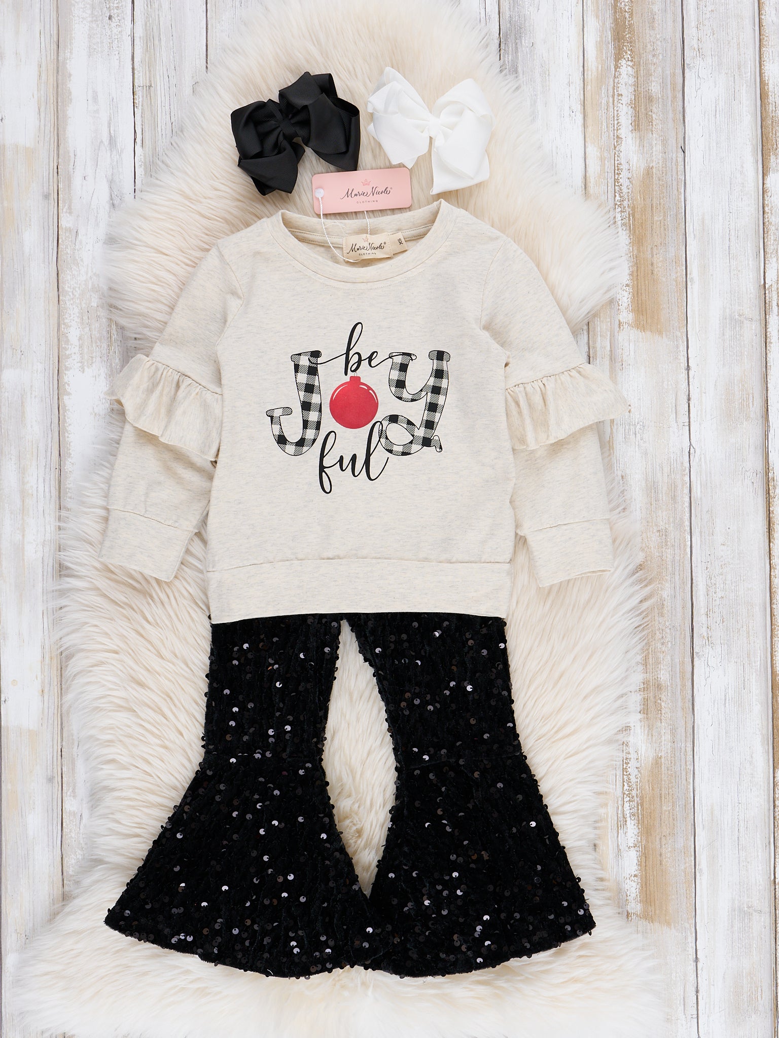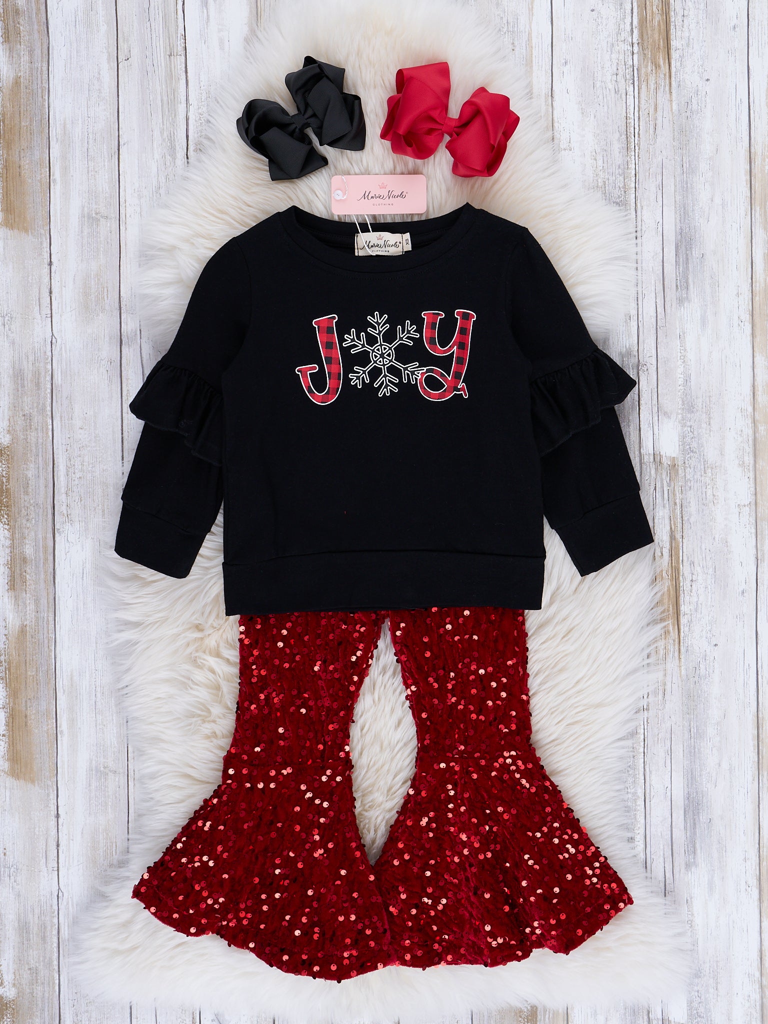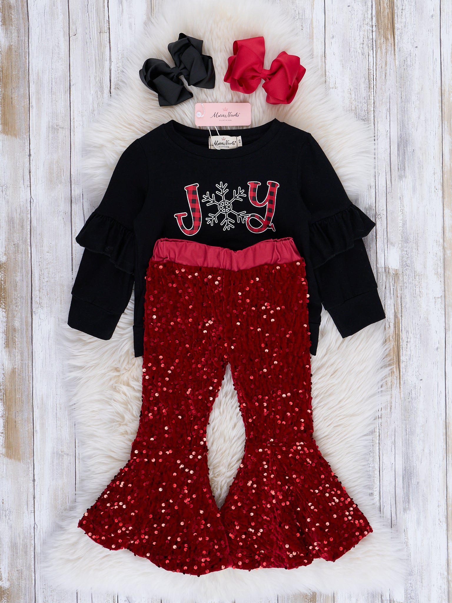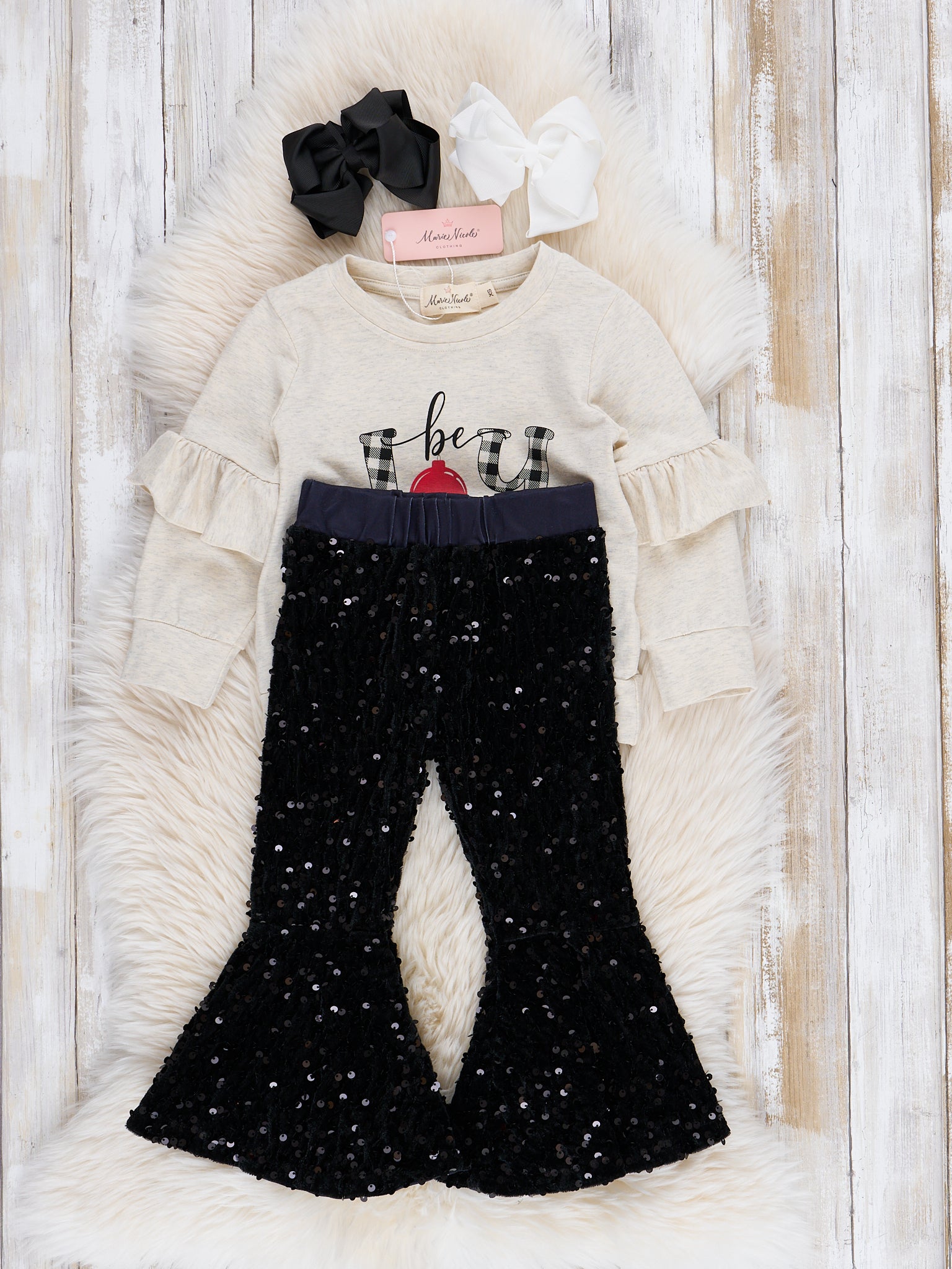 Let your little one become a walking winter wonderland in this dazzling ensemble featuring a ruffle sleeve holiday crew neck and sequin pull-on bell bottoms that will have her twirling through the season!