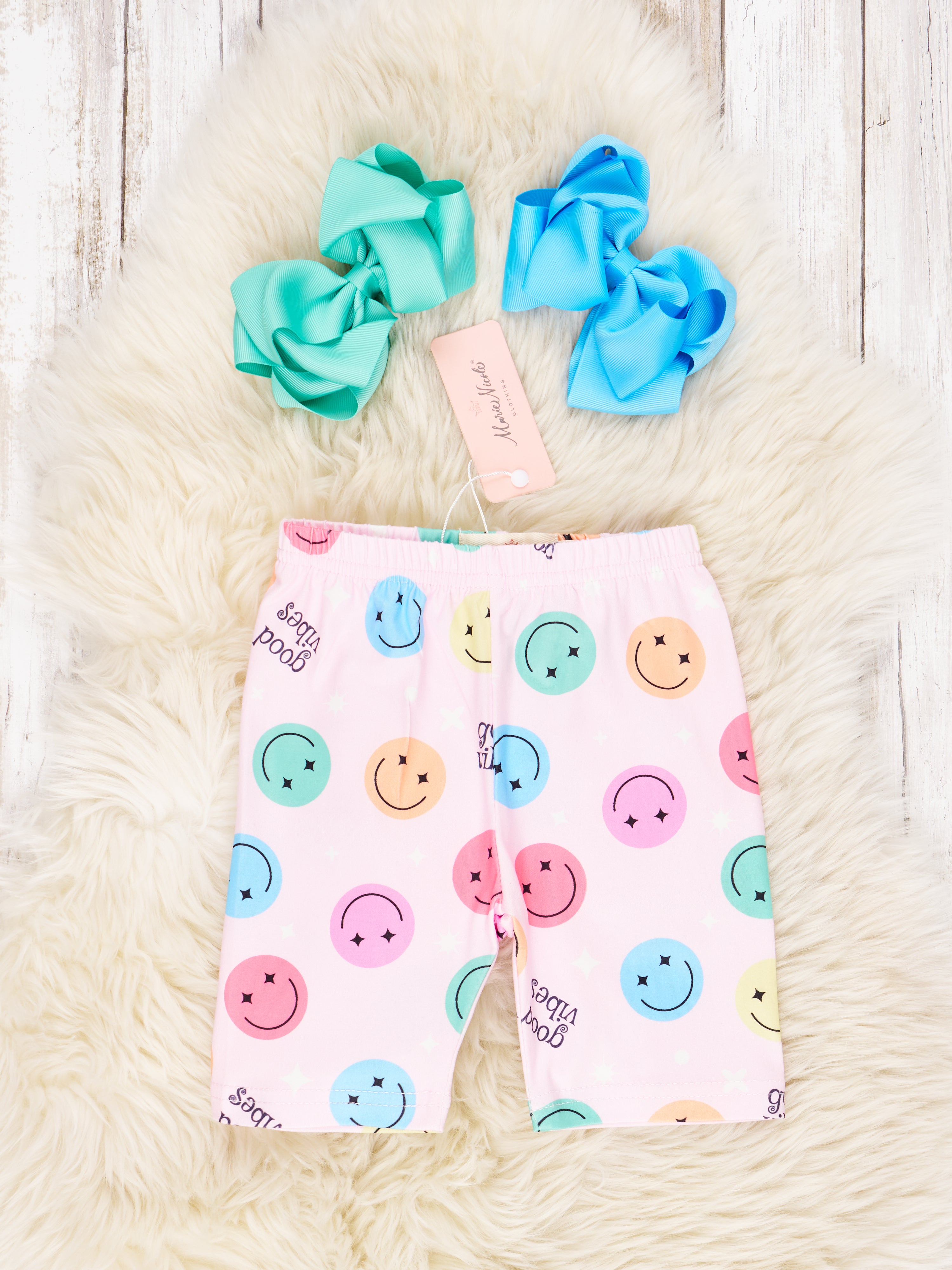 Make a statement with these dazzling smiley "good vibes" biker shorts! Perfect for any little one, these amazing shorts come in multiple styles and feature a comfy elastic waistband. Get ready to shine with these one-of-a-kind shorts!