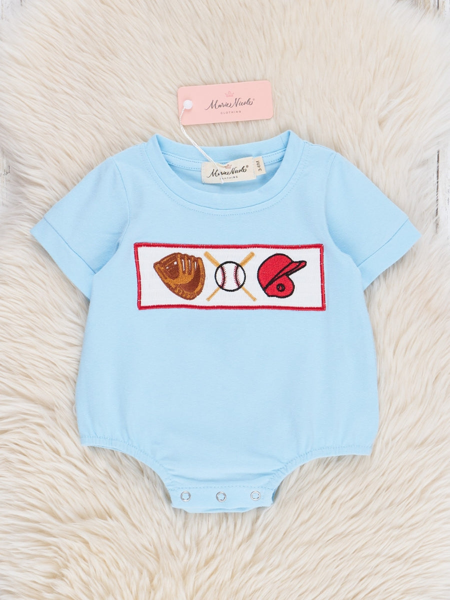 Score a home run with this Smocked Baseball Season Bubble from Marie Nicole Clothing! Your little slugger will look adorable in the blue bodice with embroidered baseball details over smocking. This sibling set is perfect for games at the diamond.