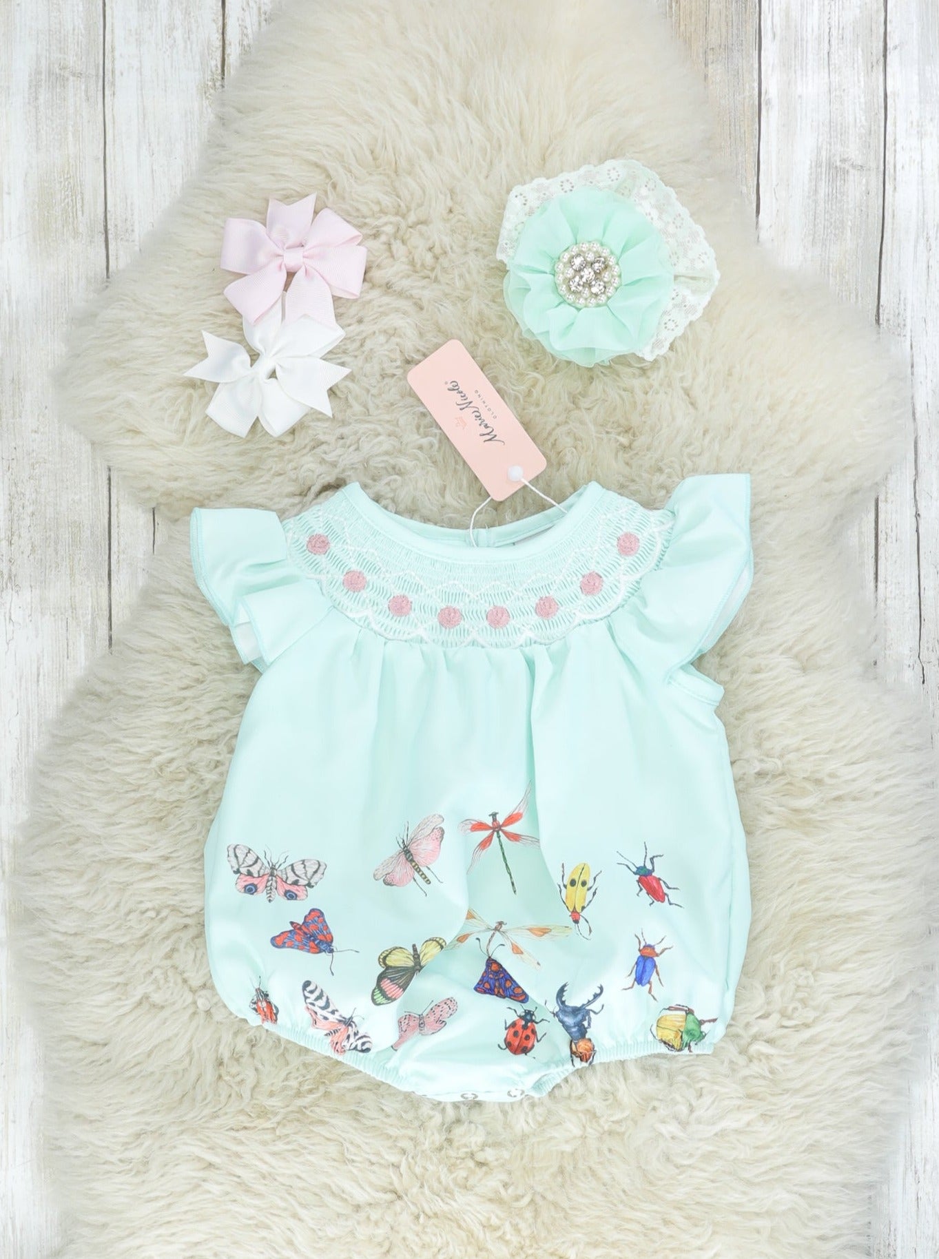 A darling sister set for your fly girls! This mint romper features smocking, embroidered florals, bug details, & ruffle trim.