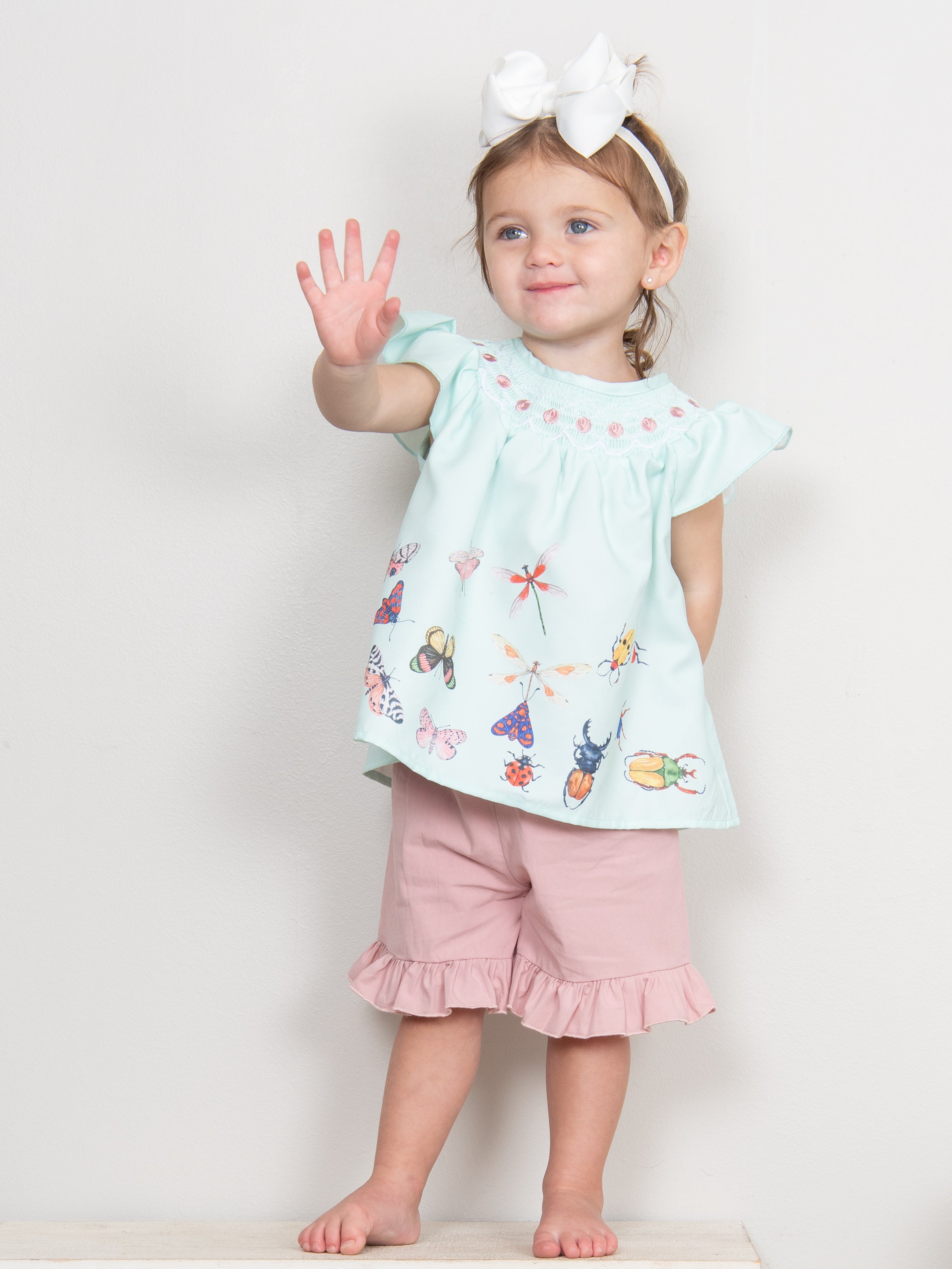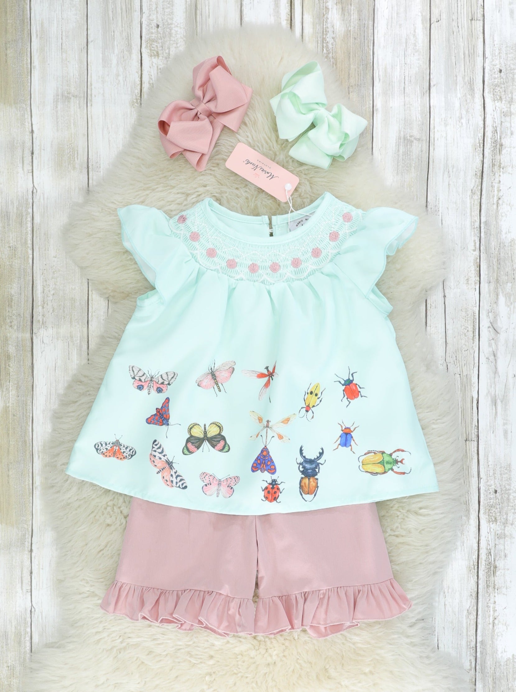 A darling sister set for your fly girls! This outfit features a mint top with smocking, embroidered florals, bug details, & dusty rose shorts with ruffle trim and elastic waistband.