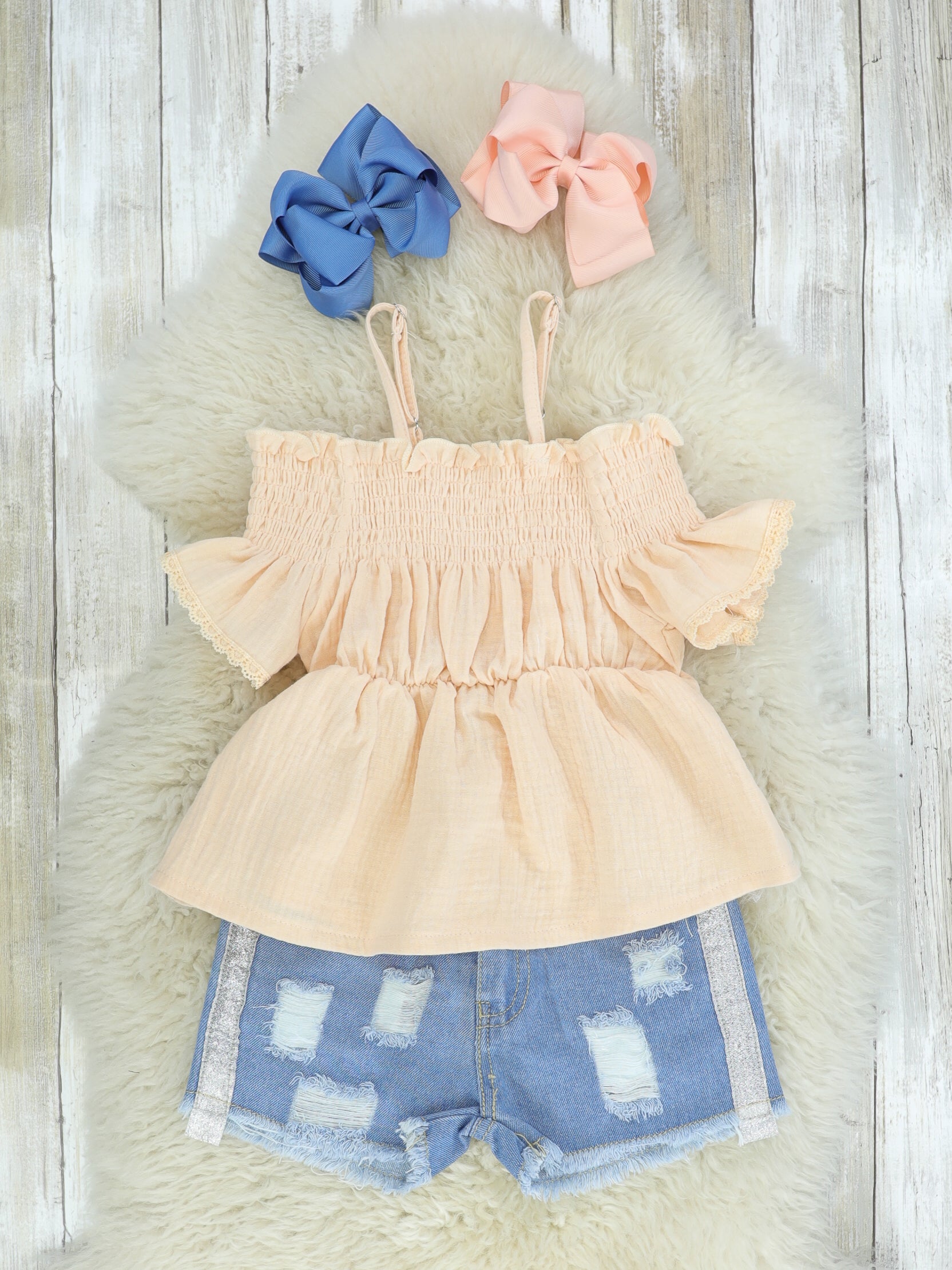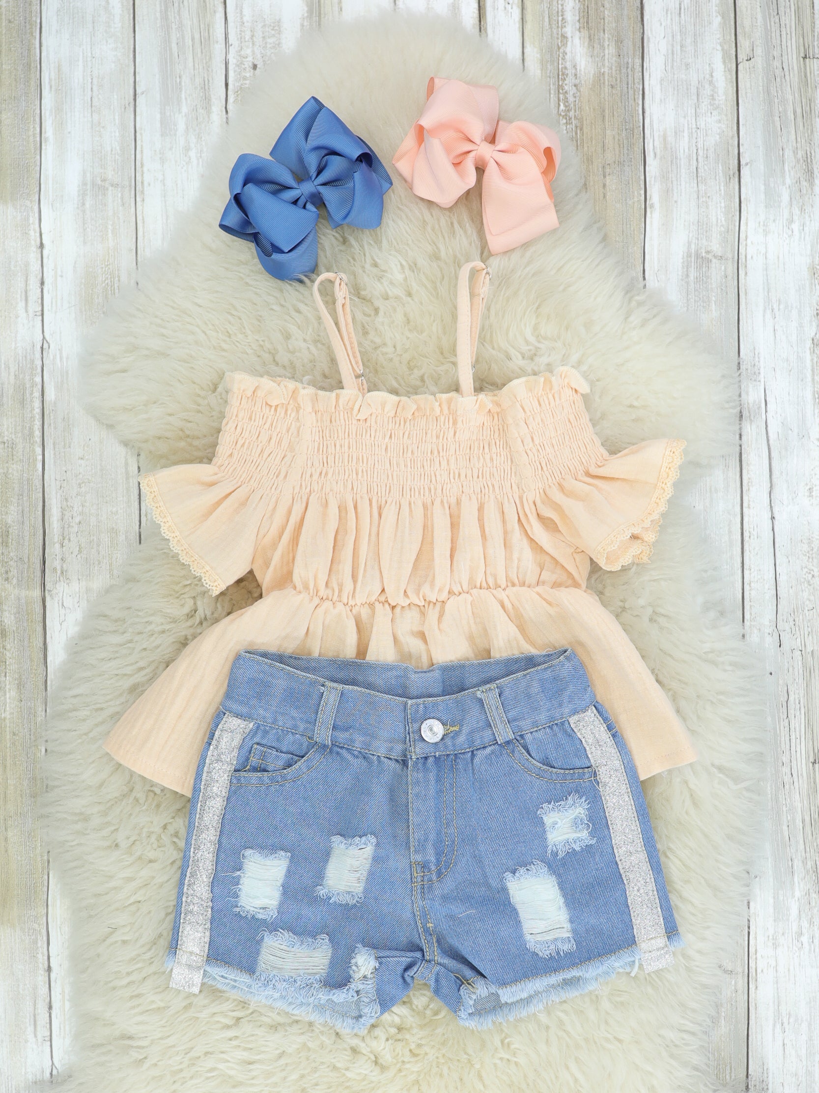 There's nothing cuter than a smocked peplum top and denim combo! This outfit features a light peach colored peplum top with the prettiest smocked detail and distressed light wash denim bottoms with sparkly glitter trim lining the sides.