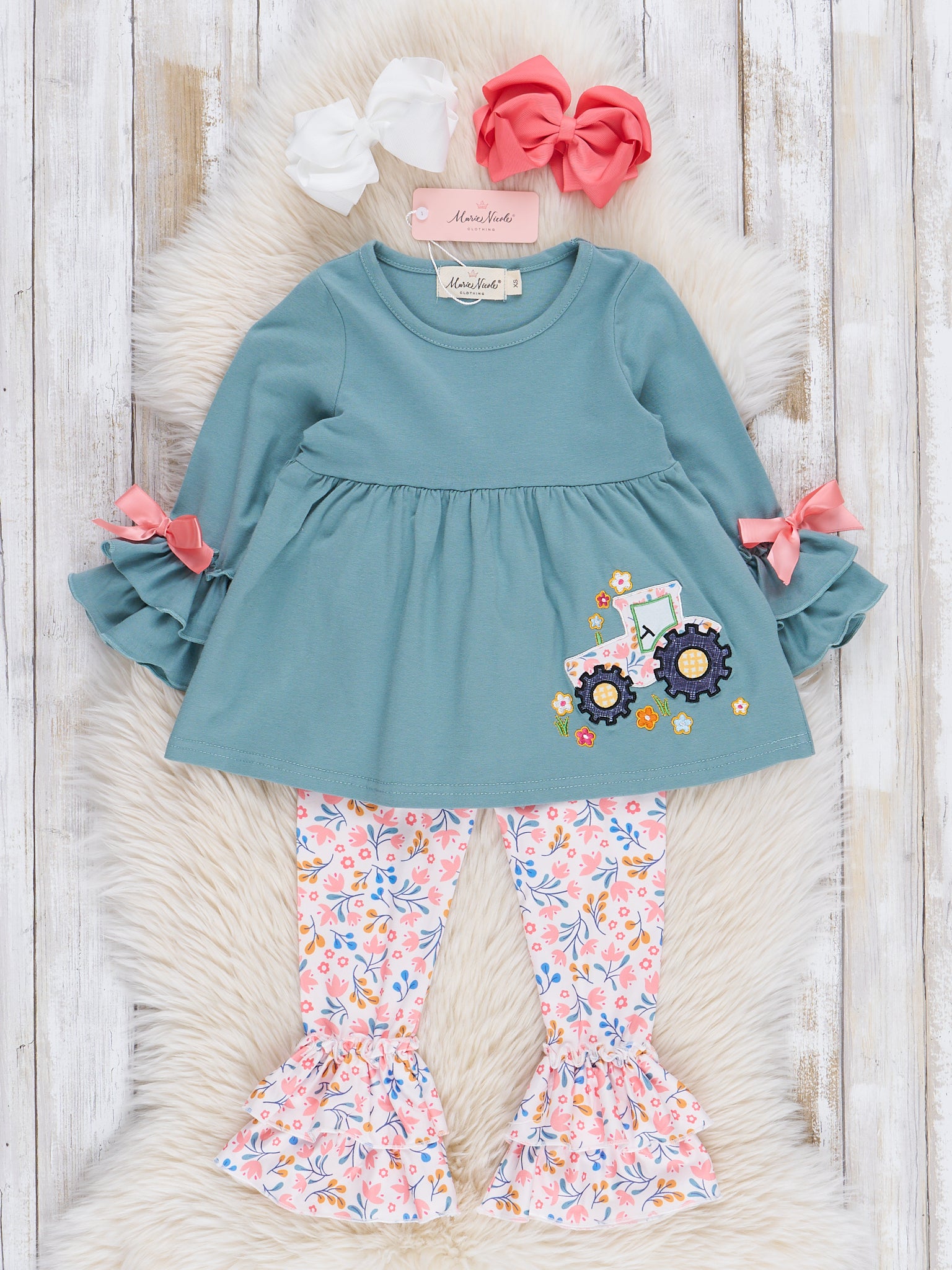 Get ready for some serious fun in our Soft Teal Floral Embroidered Tractor Outfit! This girls dress features a teal top with an embroidered floral tractor, perfectly matched with blooming floral ruffle bell leggings. Perfect for sisters who want to match in style, this dress is sure to bring out their playful side. Yee-haw!