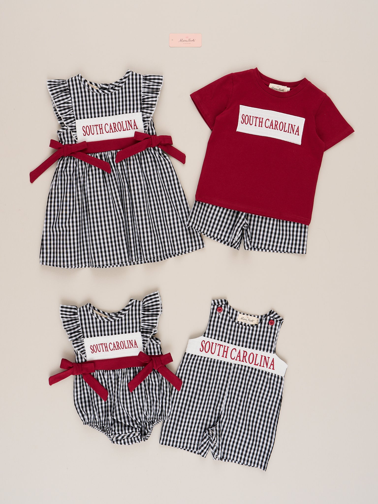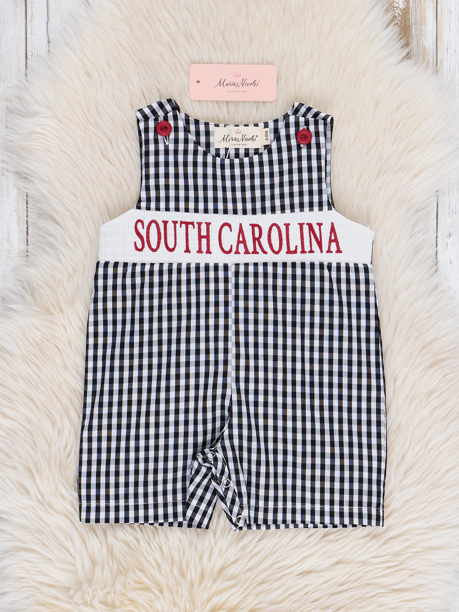 The South Carolina Smocked Gingham Johnny is a classic and charming choice for your little guy to show off his state pride. Featuring a timeless black and white gingham print and a smocked panel with bold “South Carolina” embroidery, this one-piece from Marie Nicole Clothing brings Southern style to game day and beyond. Lightweight, breathable, and designed with convenient snaps for easy changes, it’s a spirited outfit perfect for tailgates, family photos, or sunny adventures.