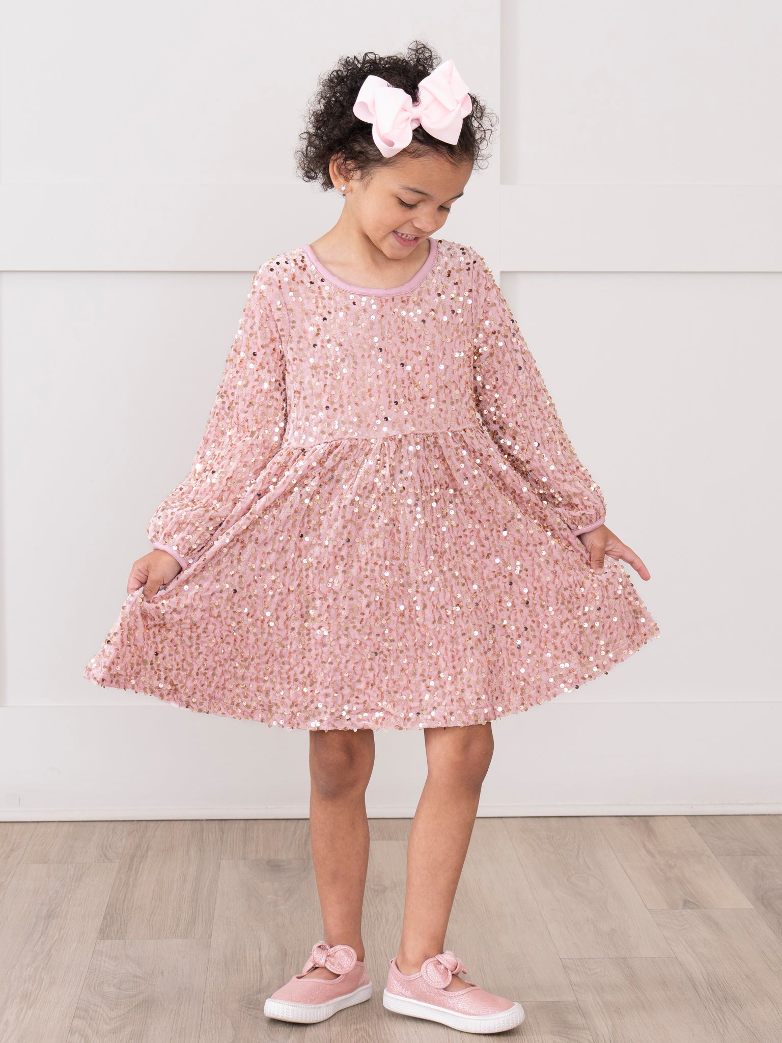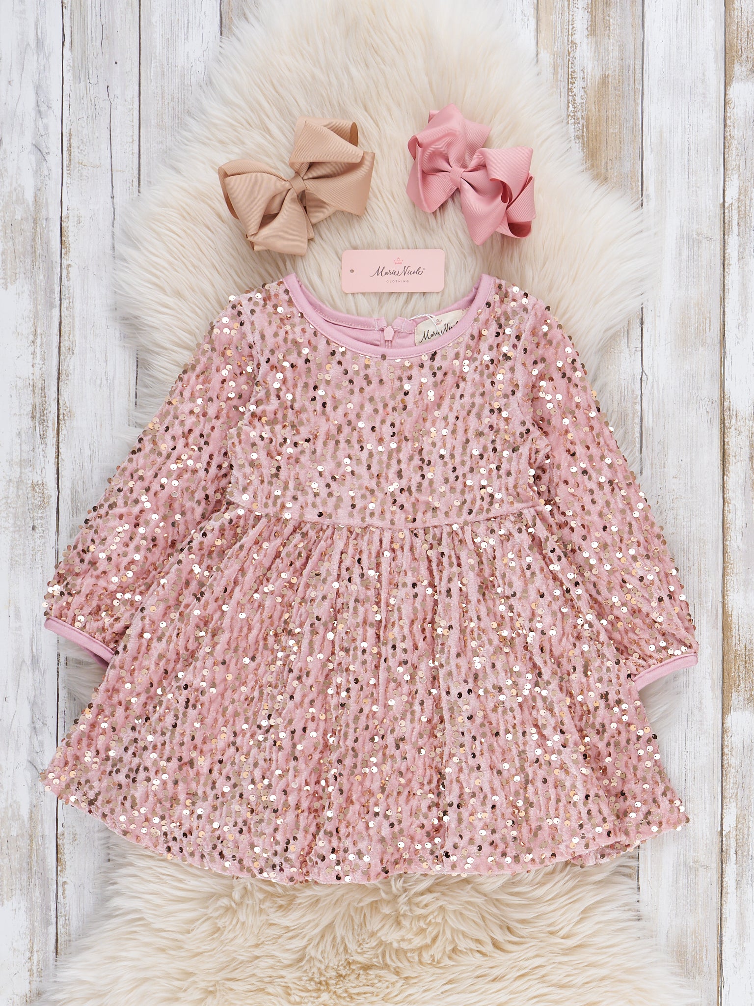 The Sparkle & Shine Dress by Marie Nicole features a long sleeve silhouette adorned with shimmering sequins throughout, creating a dazzling look for special occasions. With a softly gathered waist and comfortable stretch, this dress is perfect for festive celebrations and making any moment glitter and shine.