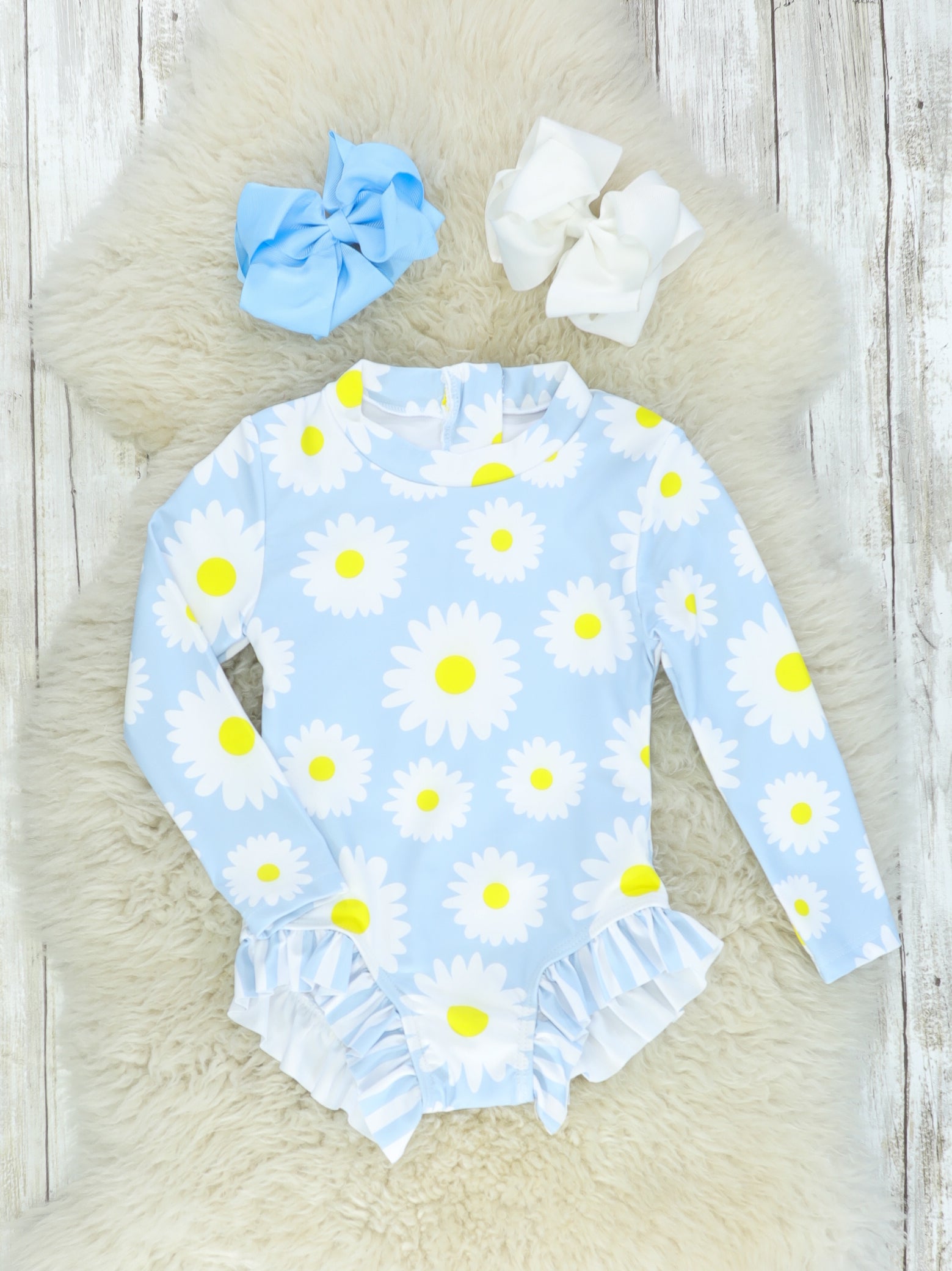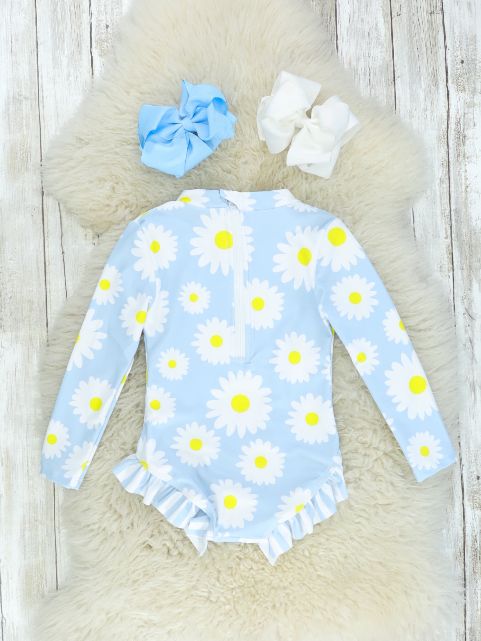 Your little one love to have fun in the sun but always ends up sunburnt? This long-sleeved swimsuit is the answer! It is pale blue with ruffles and pretty daisy details.