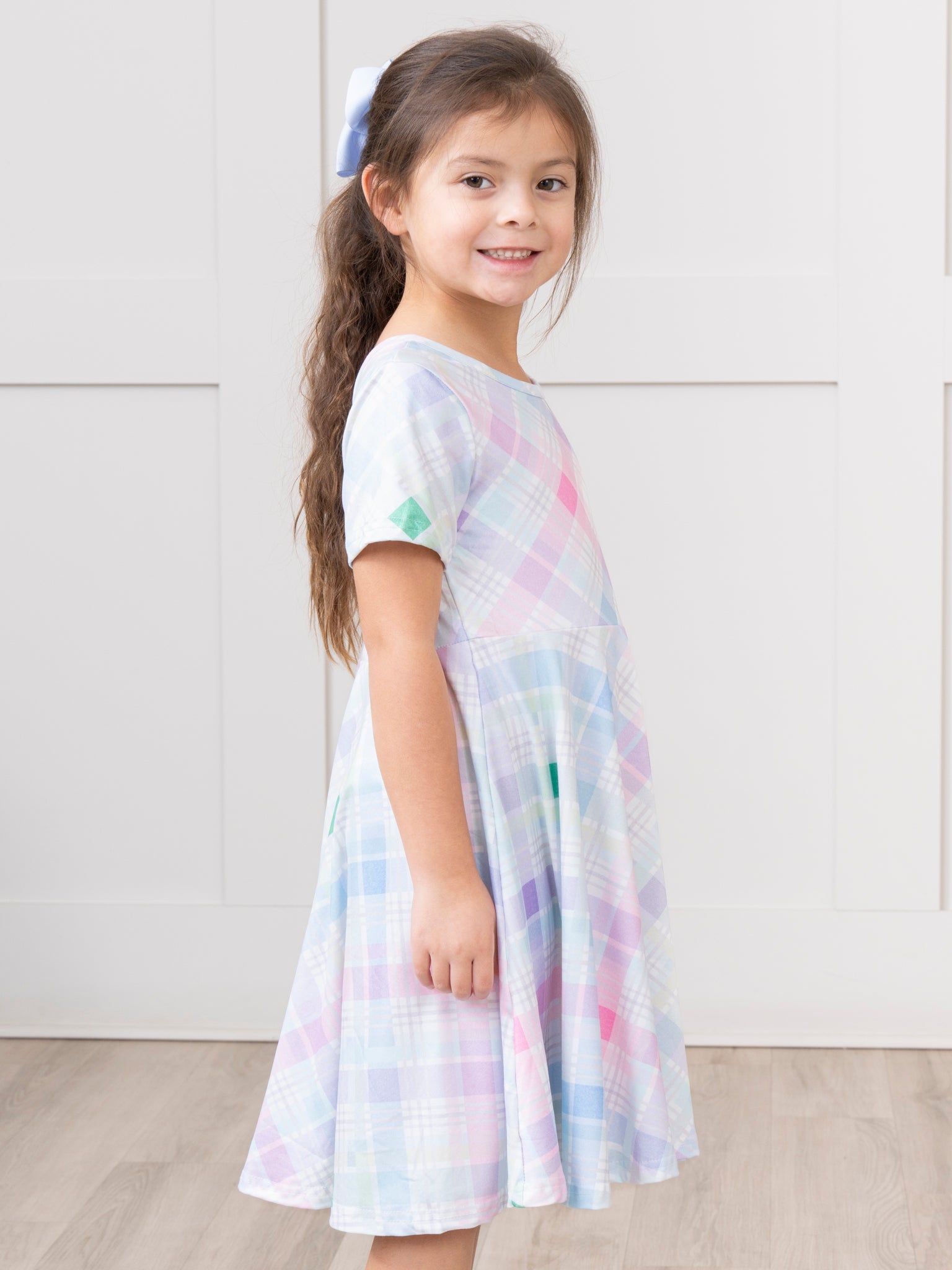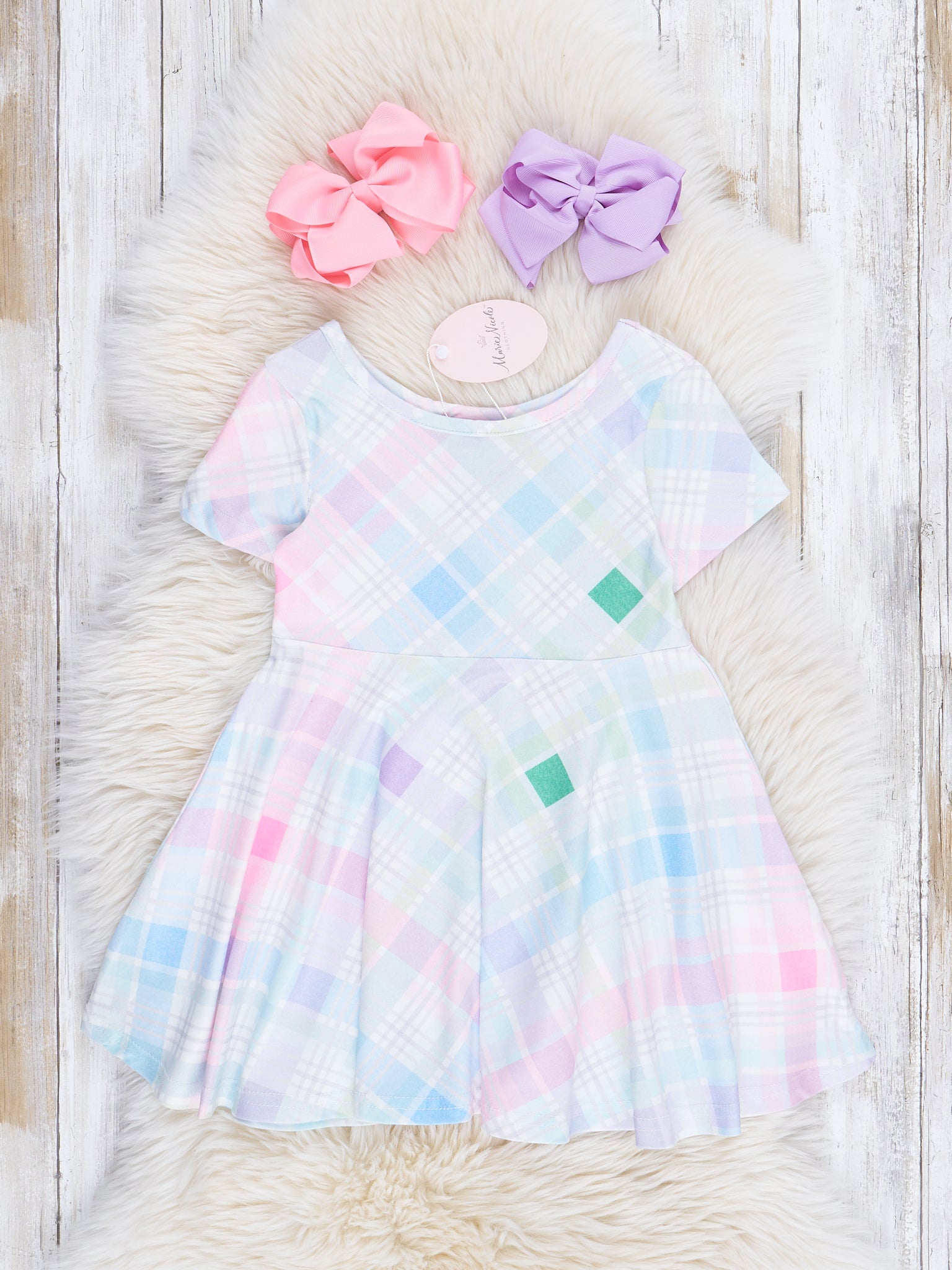 A sweet spring dress for your dainty girls! This swing dress features green, purple, pink, & blue plaid.