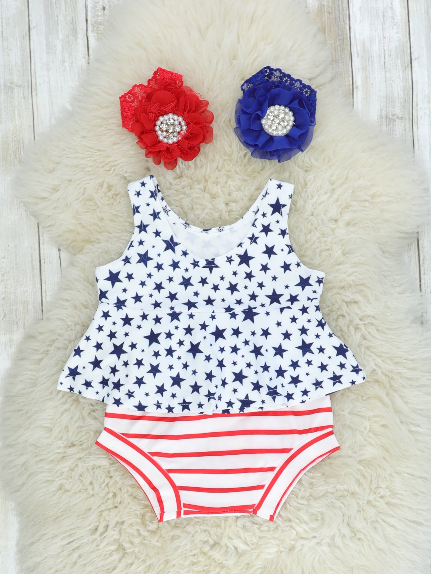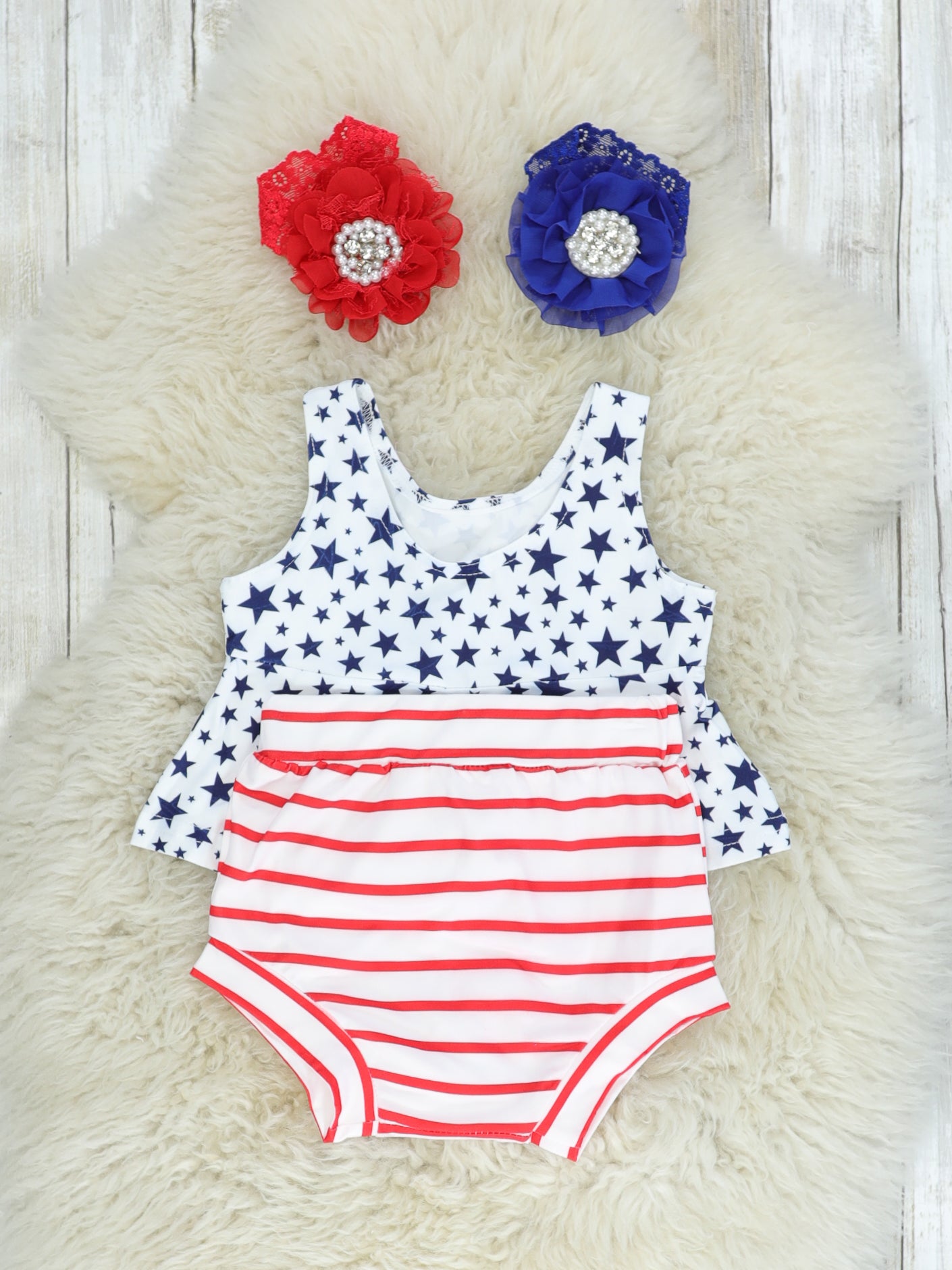 Hooray for the USA! We are loving this adorable bloomers set with a navy and white star pattern and red and white striped bottoms.