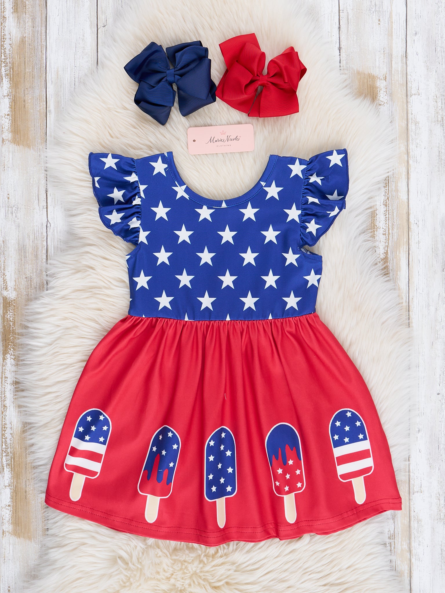 Show off your little girl's patriotic side with our Stars & Stripes Popsicle Dress! Perfect for Independence Day celebrations, this fun and playful dress will make her stand out from the crowd. Let her show off her American pride in style! 🇺🇸